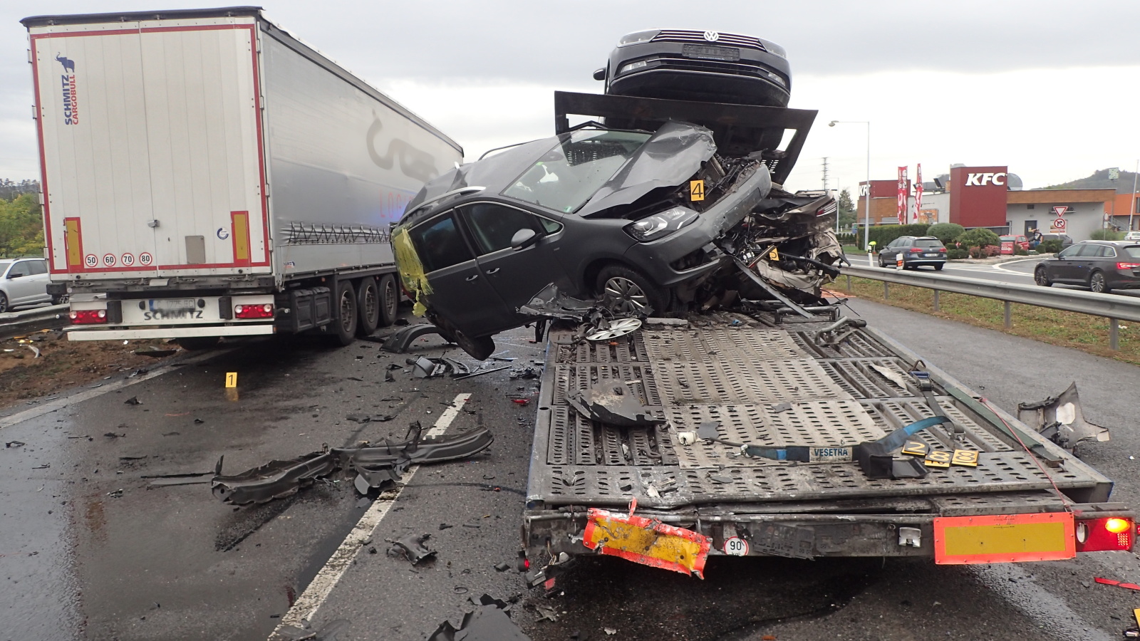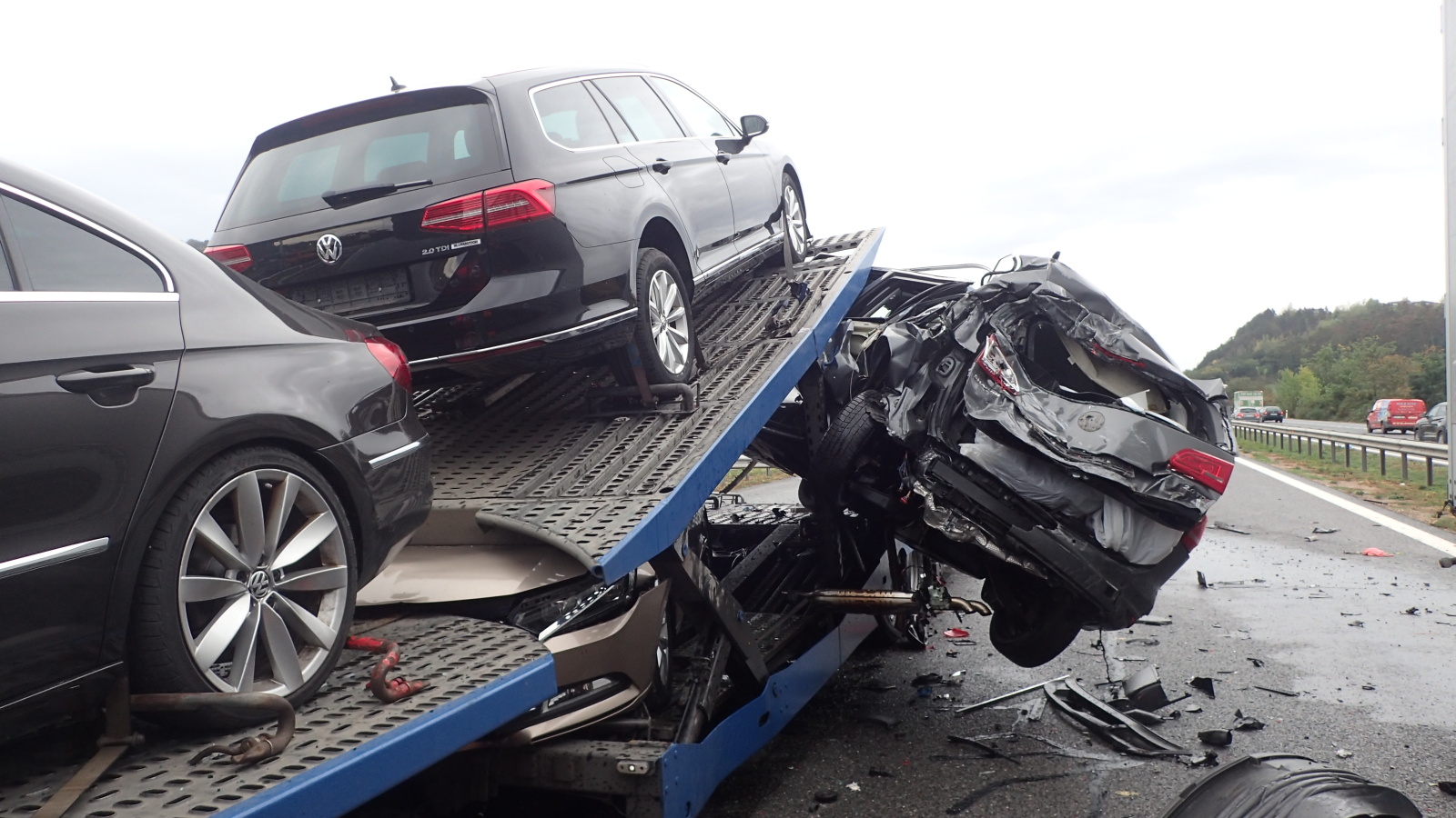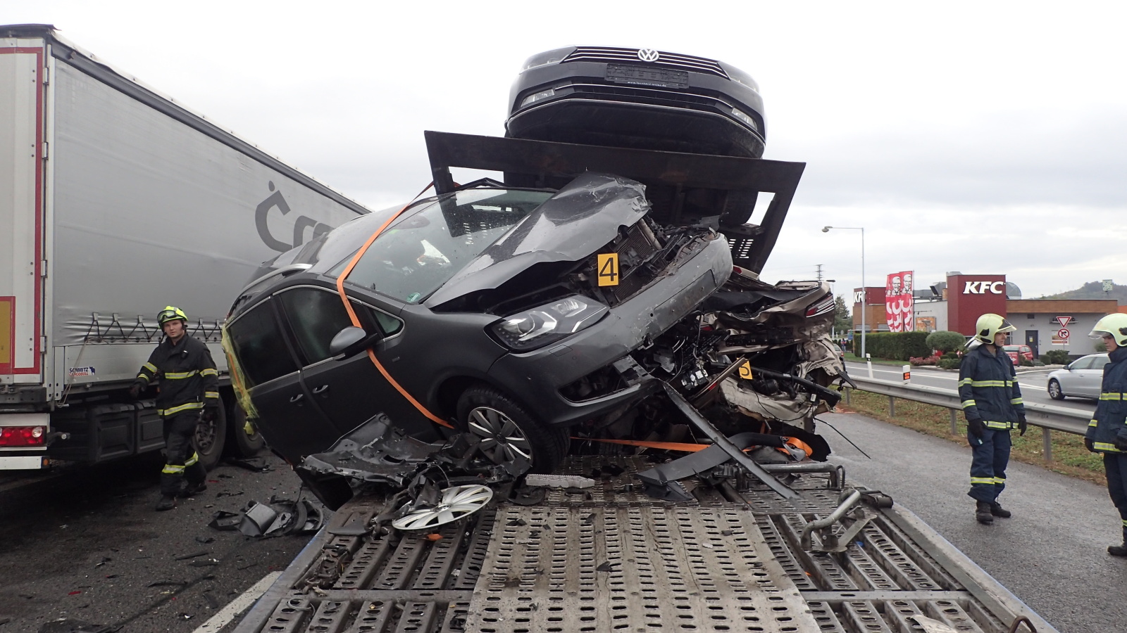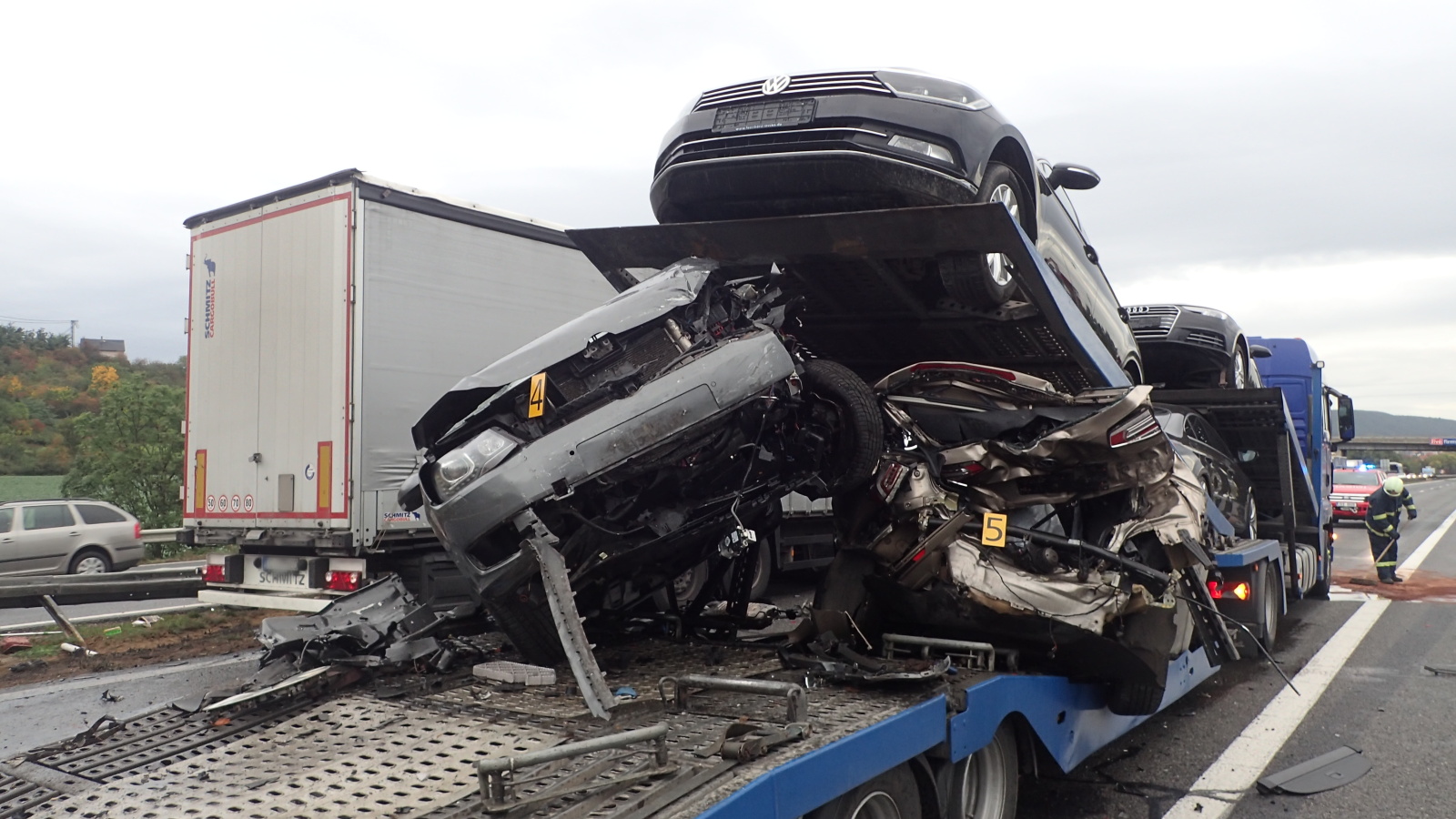 Operační důstojník k události poblíž 22. kilometru vyslal jednotku profesionálních hasičů ze stanice HZS Beroun. Po příjezdu na místo bylo zjištěno, že se srazily dva kamiony, přičemž jeden přepravoval osobní vozidla a druhý plastový granulát. Vzhledem k velkému nárazu došlo k posunutí přepravovaných vozidel, která hasiči museli nejprve zajistit proti případnému pádu.