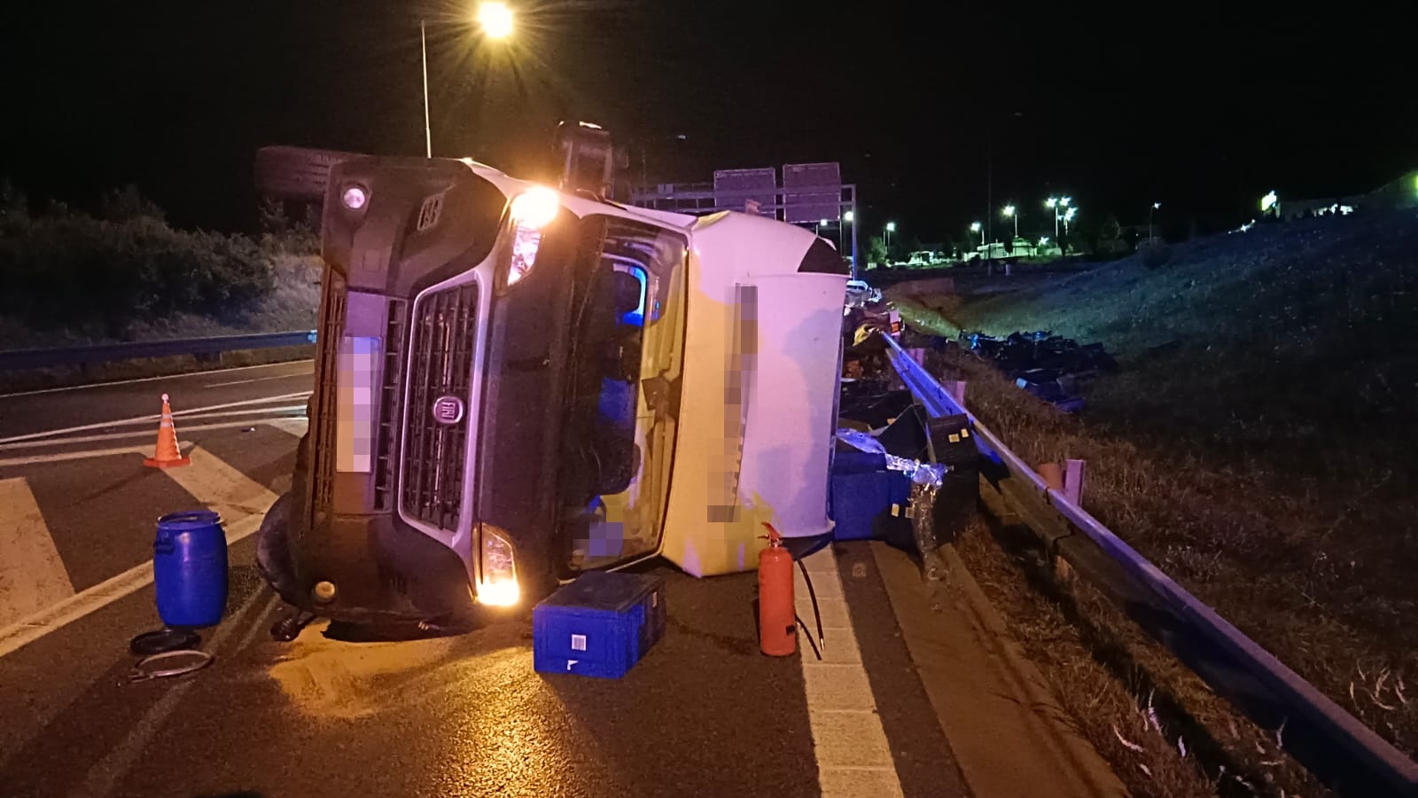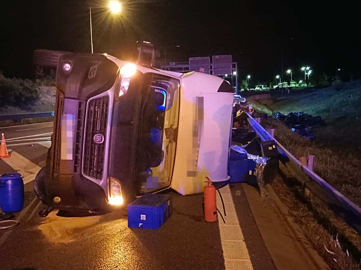 První vážnější událost přišla ještě v noci na desátém kilometru dálnice D1 ve směru do Prahy. Dodávka zde sjela ze silnice a skončila převrácená na boku. Řidiče musela převzít záchranná služba, jeho zranění zatím nejsou blíže specifikována.