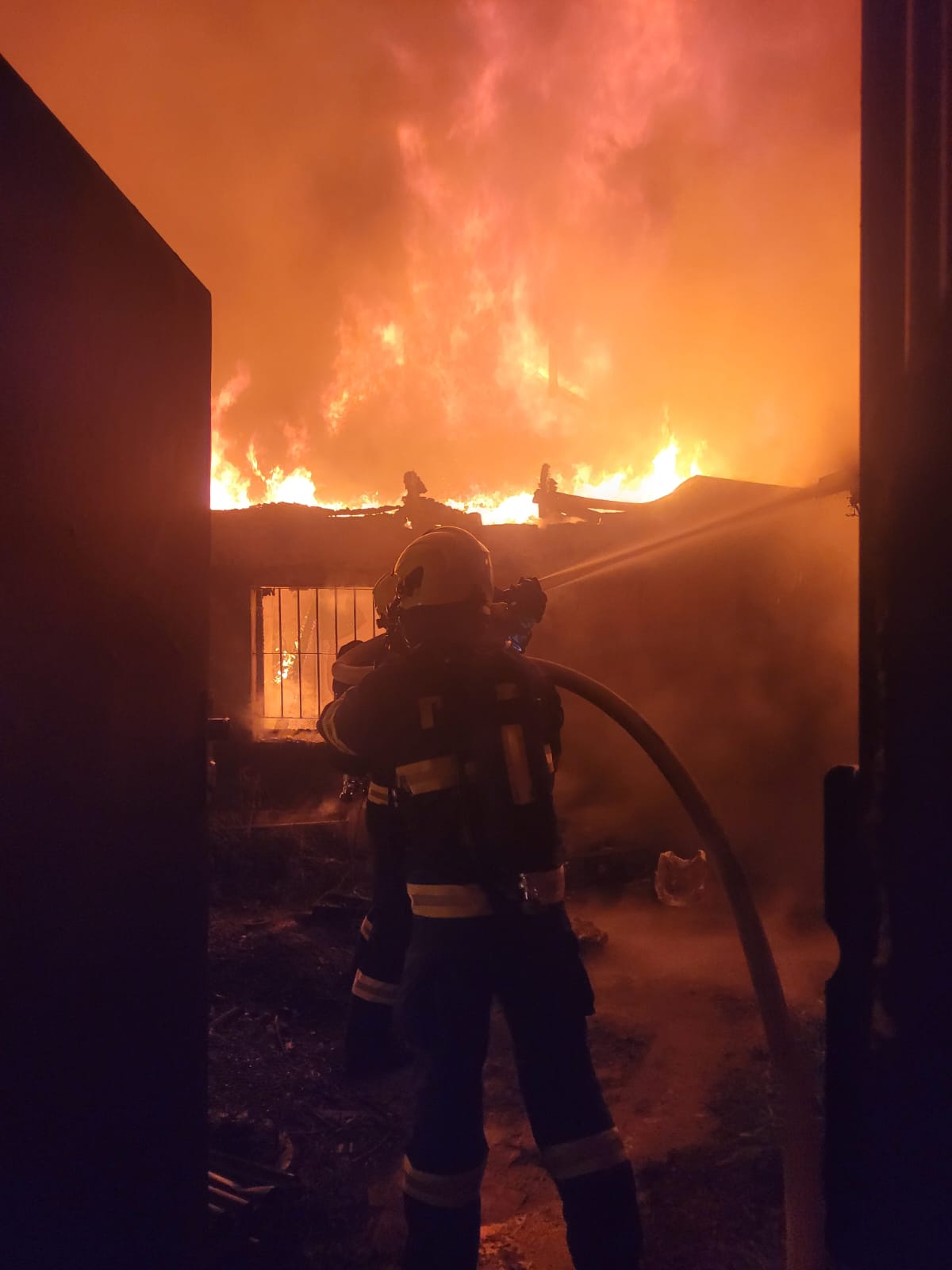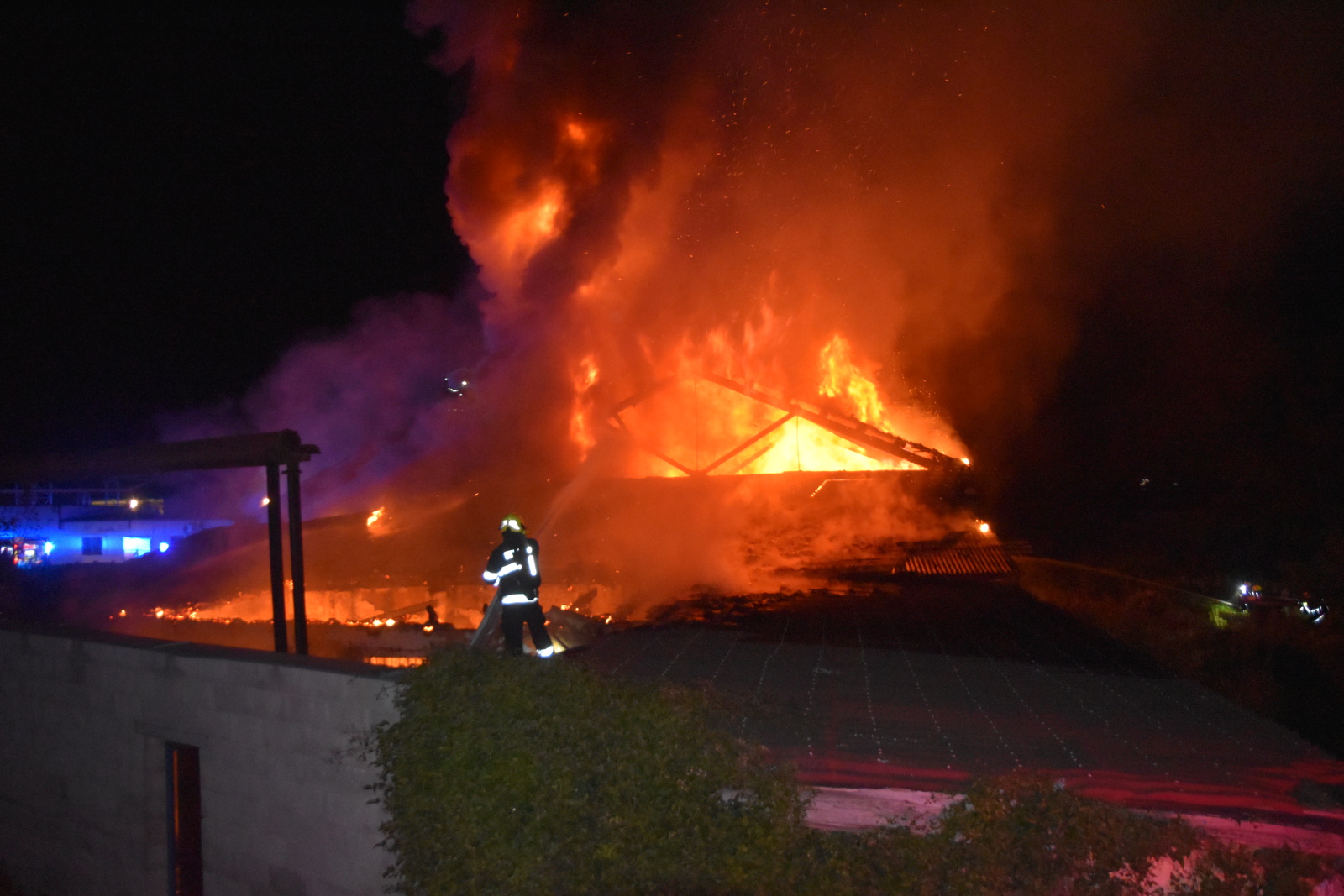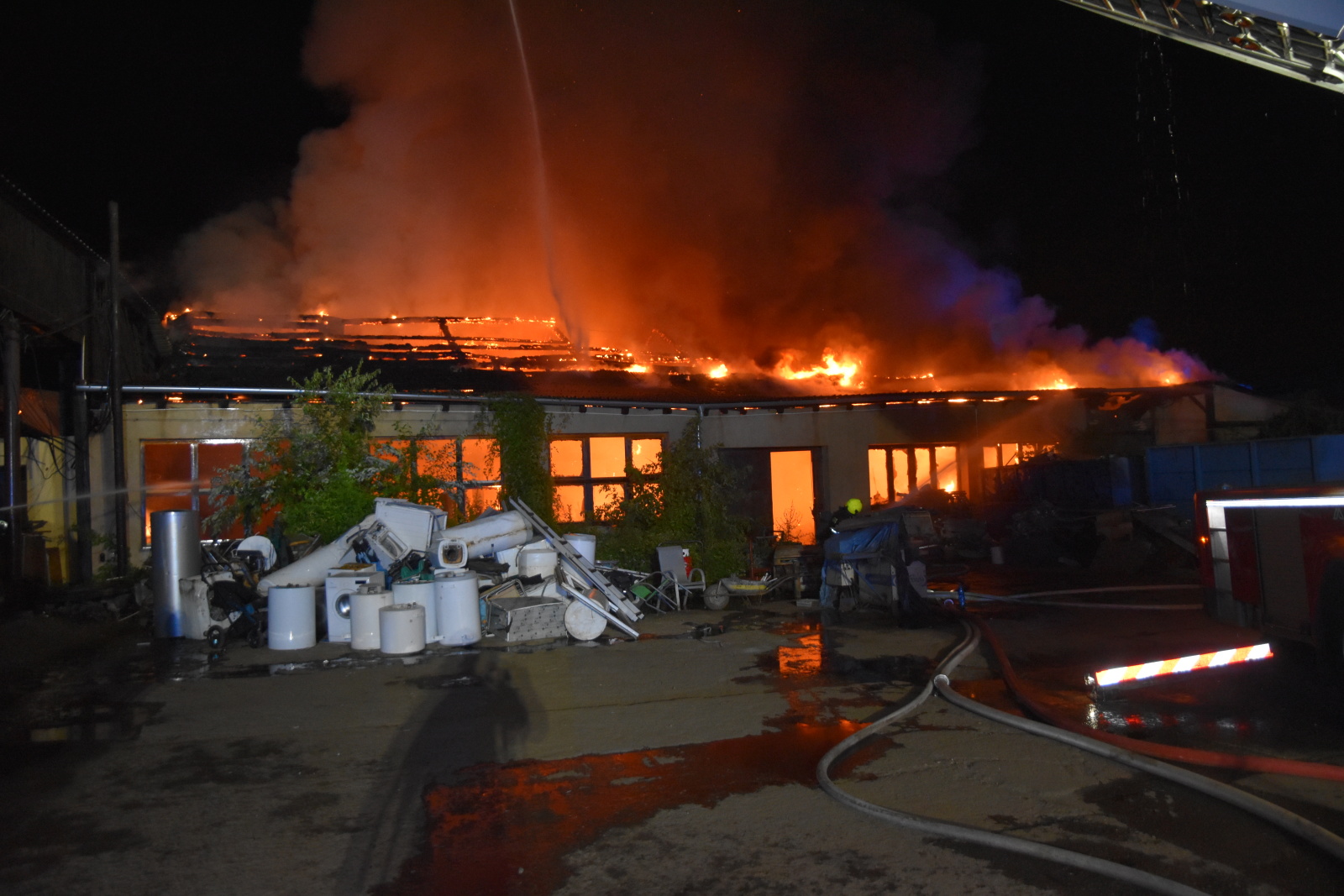 Kromě sanitního vozu tak k požáru vyrazily i jednotky HZS Slaný a SDH Braškov, Stehelčeves, Unhošť a Vinařice. Zraněného muže si pak převzala do své péče posádka zdravotnické záchranné služby, po prvotním ošetření byl pacient převezen do kladenské nemocnice. Hasiči zahájili zásah pěti proudy C, a to i za využití automobilového žebříku. Požár se však dál rychle rozšiřoval, protože zasažený areál sběrny byl hodně členitý a zřejmě v něm bylo uskladněno dost hořlavých materiálů, navíc i několik velkých lahví s propanbutanem. Jedna z nich i záhy explodovala, asi po deseti minutách druhá. Nikdo ze zasahujících ale nebyl zraněn, protože hasiči se kolem nebezpečného prostoru pohybovali velice obezřetně.