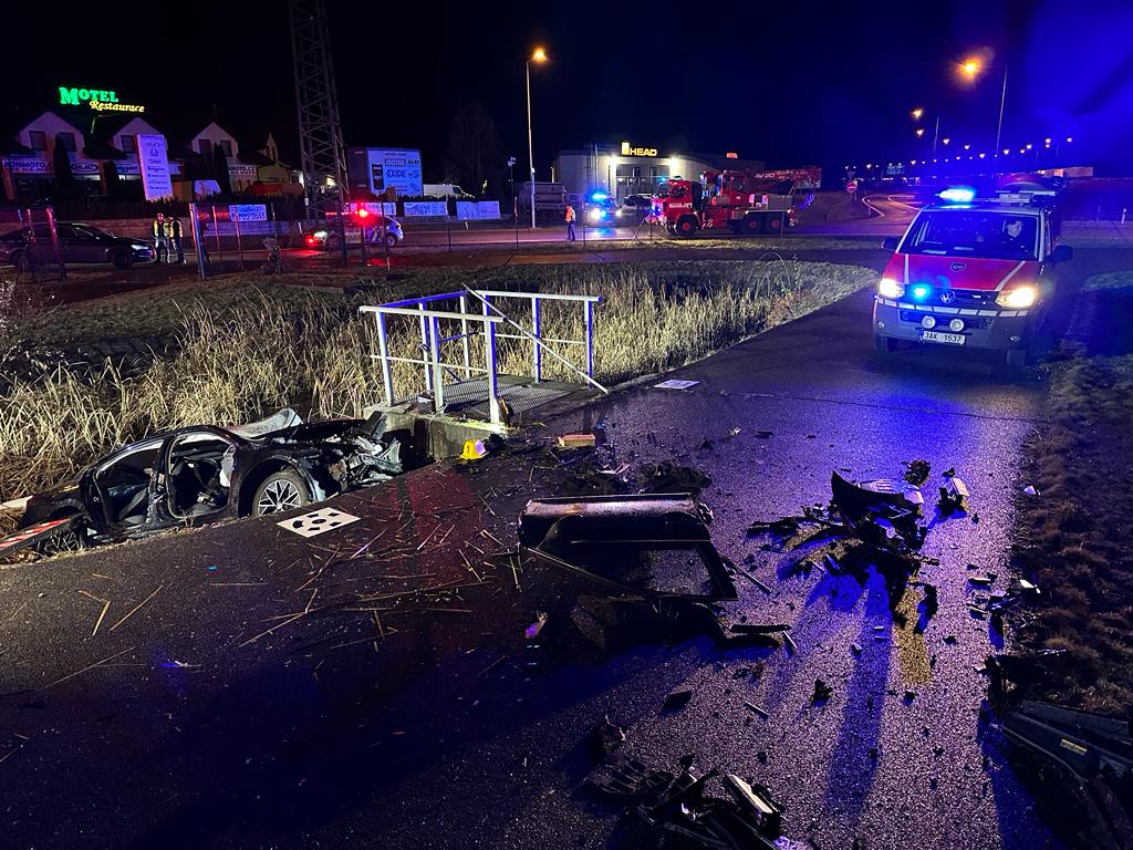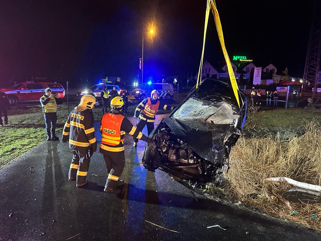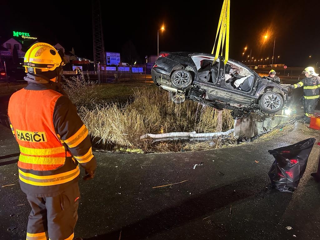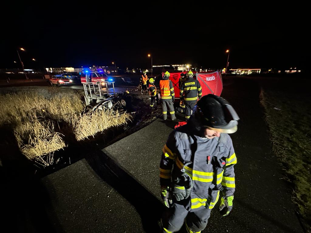 Po příjezdu na místo a prvotním průzkumu bylo zjištěno, že jde o dopravní nehodu osobního automobilu, který skončil v retenční nádrži situované uprostřed kruhového objezdu. V kabině se nacházela jedna osoba, která byla pomocí hydraulického vyprošťovacího zařízení vyproštěna a předána do péče posádkám zdravotnické záchranné služby.
