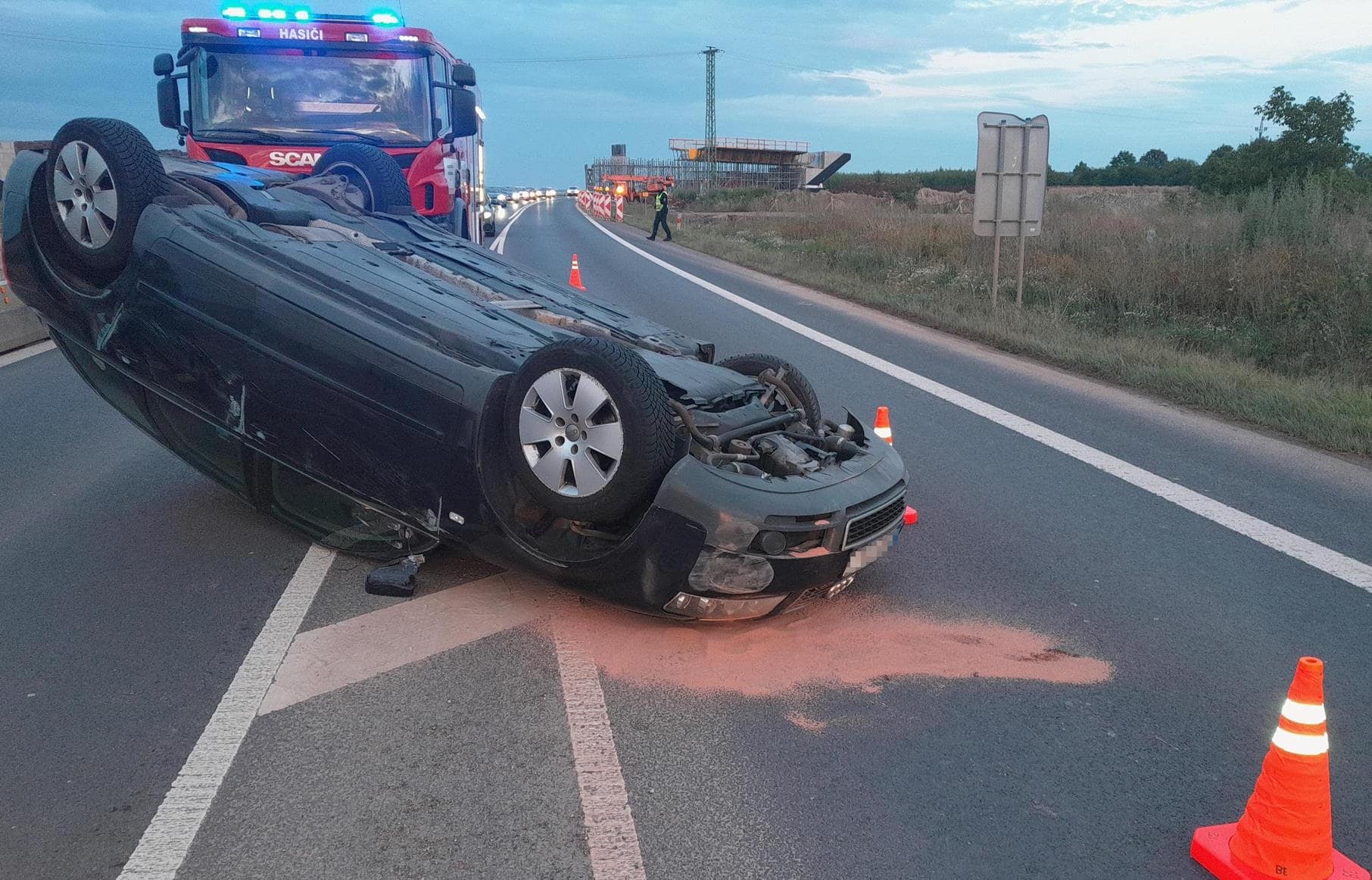 Osobní automobil zde z dosud nezjištěných příčin skončil převrácený na střeše.