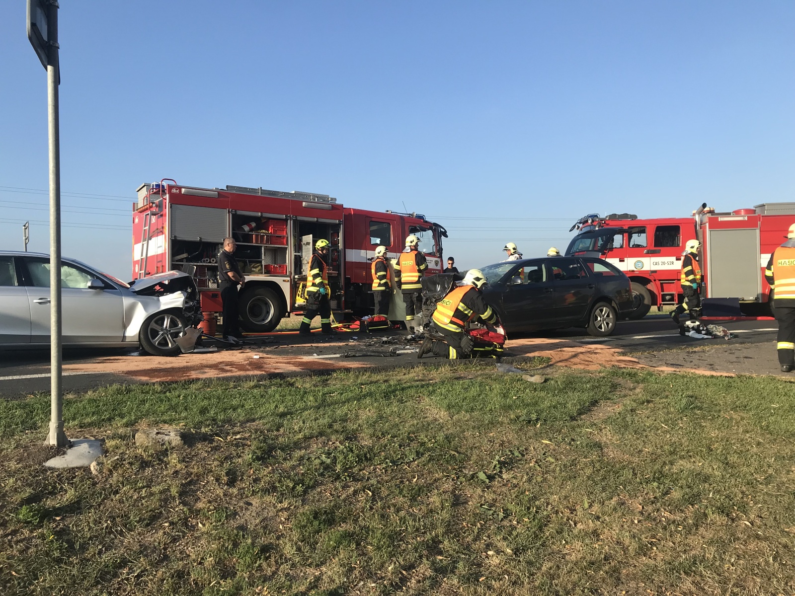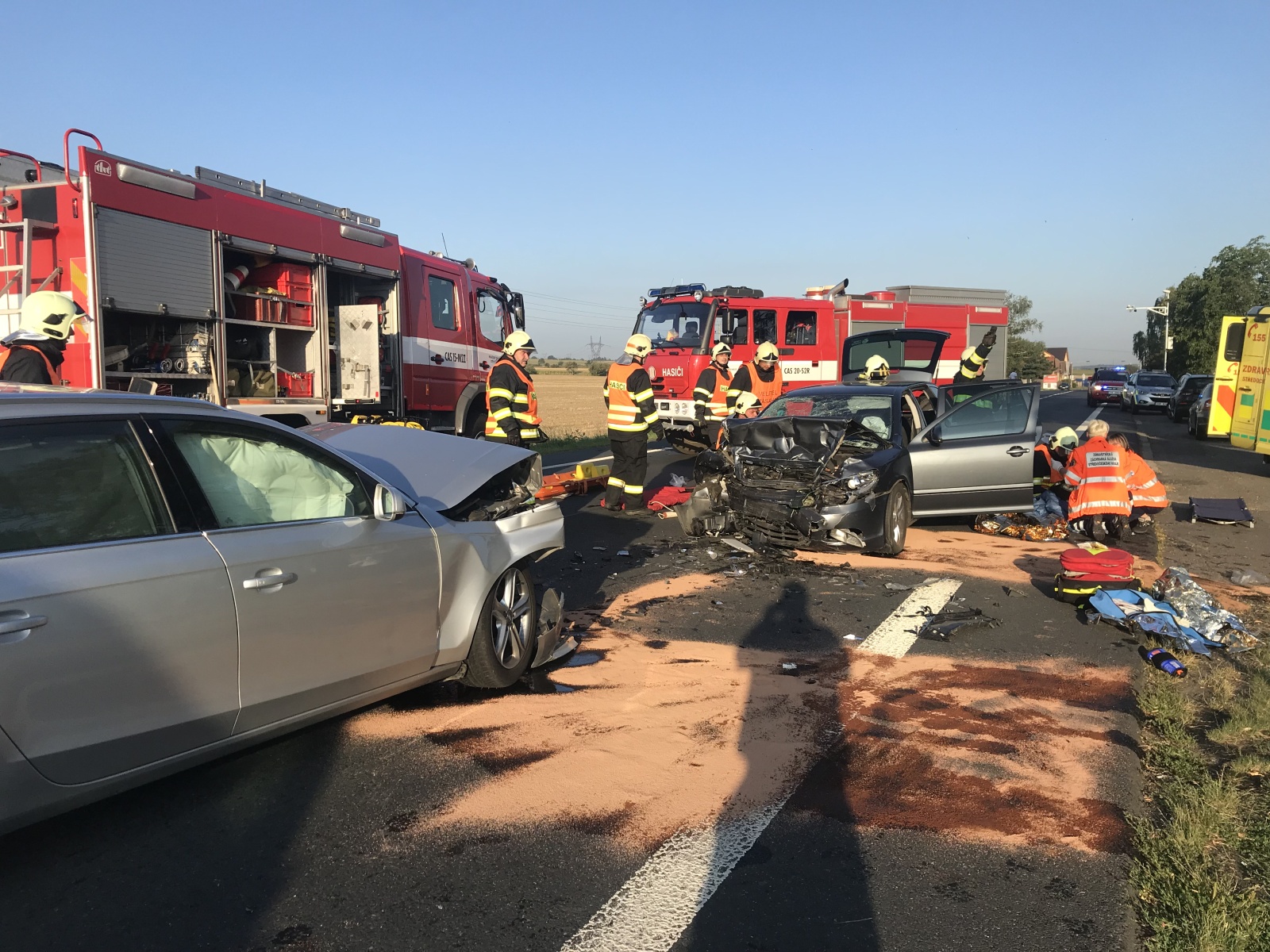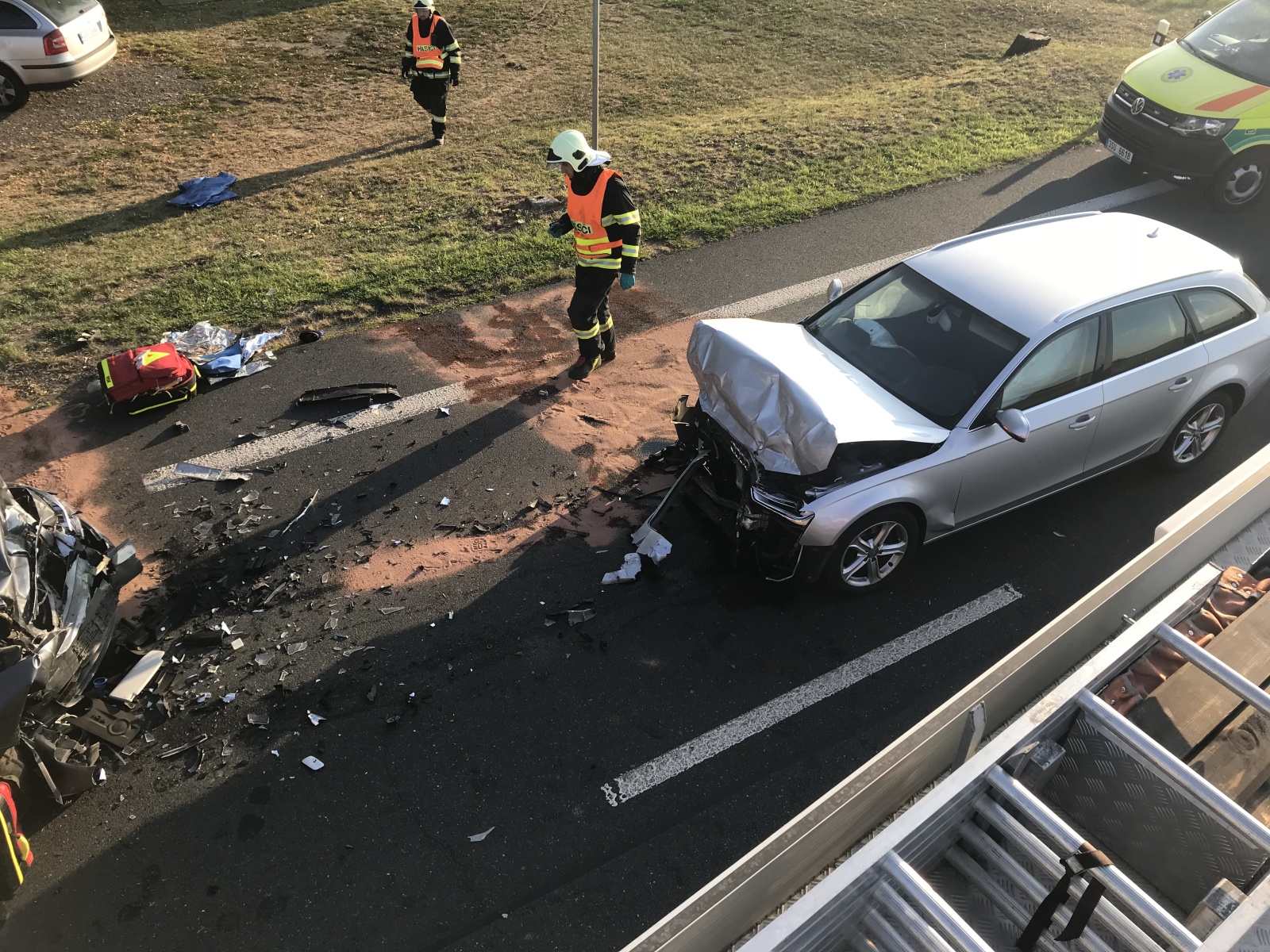 Celkem bylo při nehodě zraněno pět osob, z toho podle lékařů dvě těžce a tři středně těžce. Hasiči dále udělali protipožární opatření na obou autech a sanaci vozovky od ropných produktů. Po zadokumentování nehody Policií ČR jednotky ještě uklidily komunikaci, která byla po celou dobu zásahu zcela uzavřena. Obousměrný odklon řídily policejní hlídky po vedlejších silnicích.
