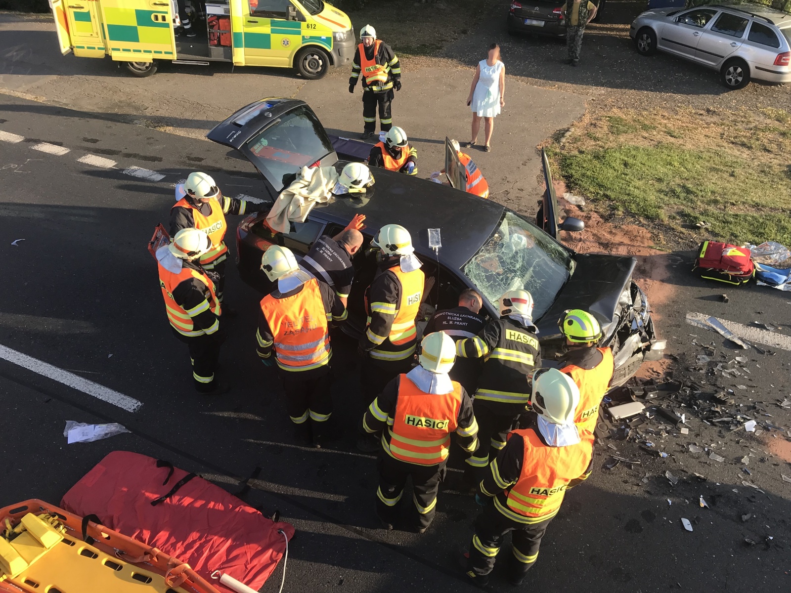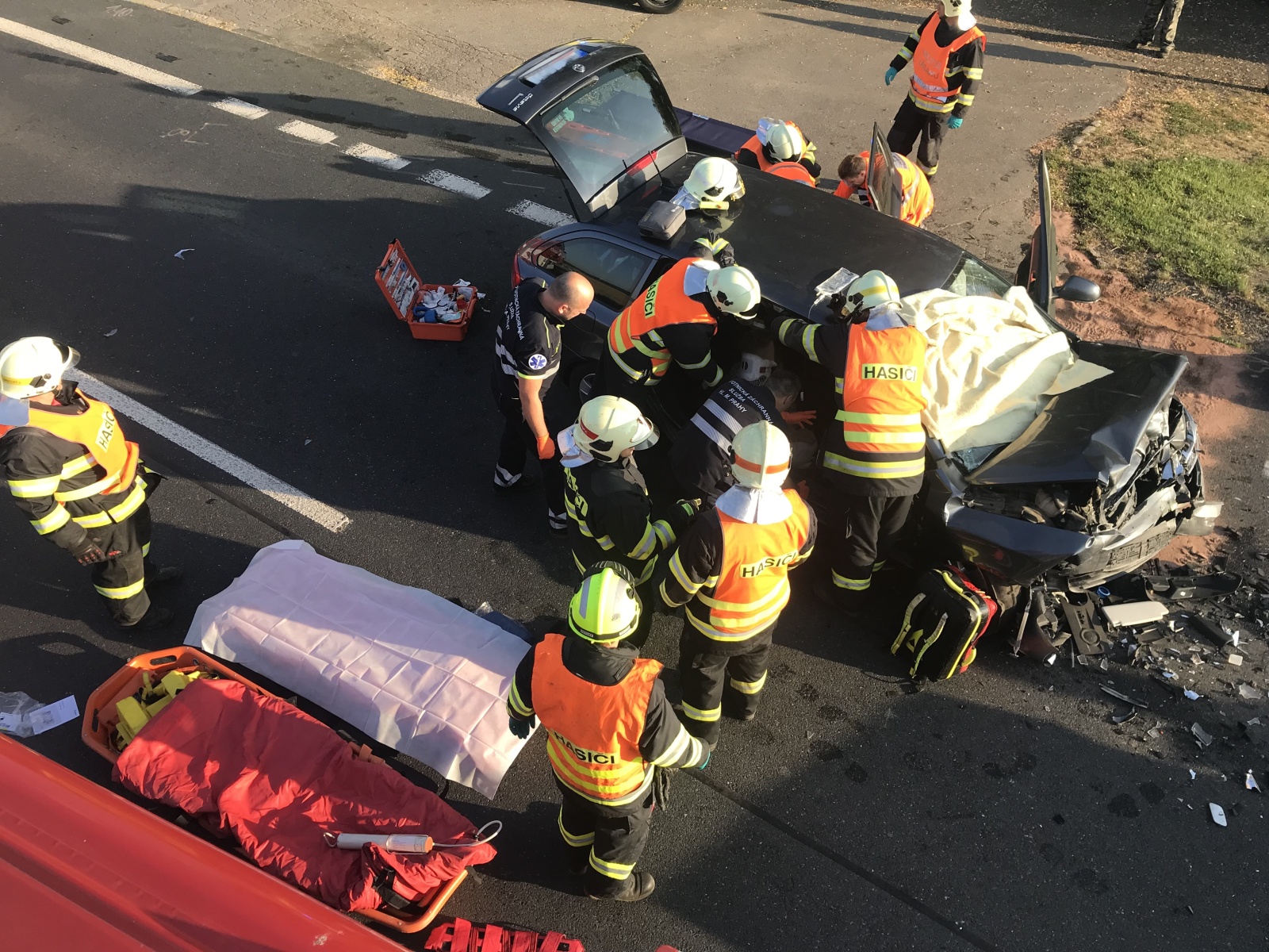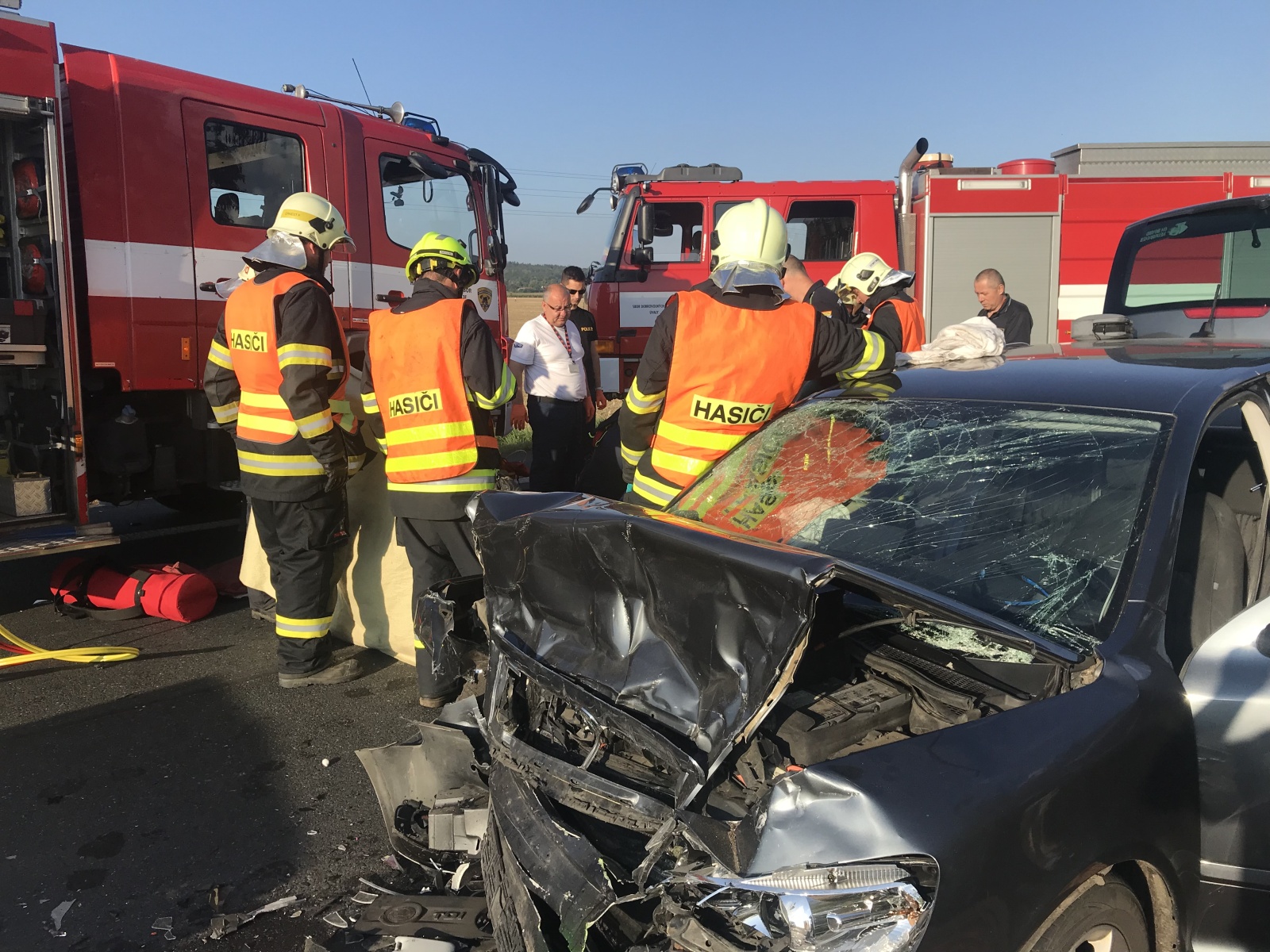Po příjezdu hasičů na místo bylo zjištěno, že jde o čelní střet dvou osobních vozidel, přičemž v jednom z nich se nacházejí zaklíněné osoby. Hasiči za použití hydraulické vyprošťovací sady začali z vozidla vyprošťovat zraněné osoby, které si následně převzala do péče přivolaná zdravotnická záchranná služba. Vzhledem k tomu, že jedno zranění bylo hodně vážné, byl na místo vyslán také vrtulník letecké záchranné služby, který osobu transportoval do nemocnice v Praze.