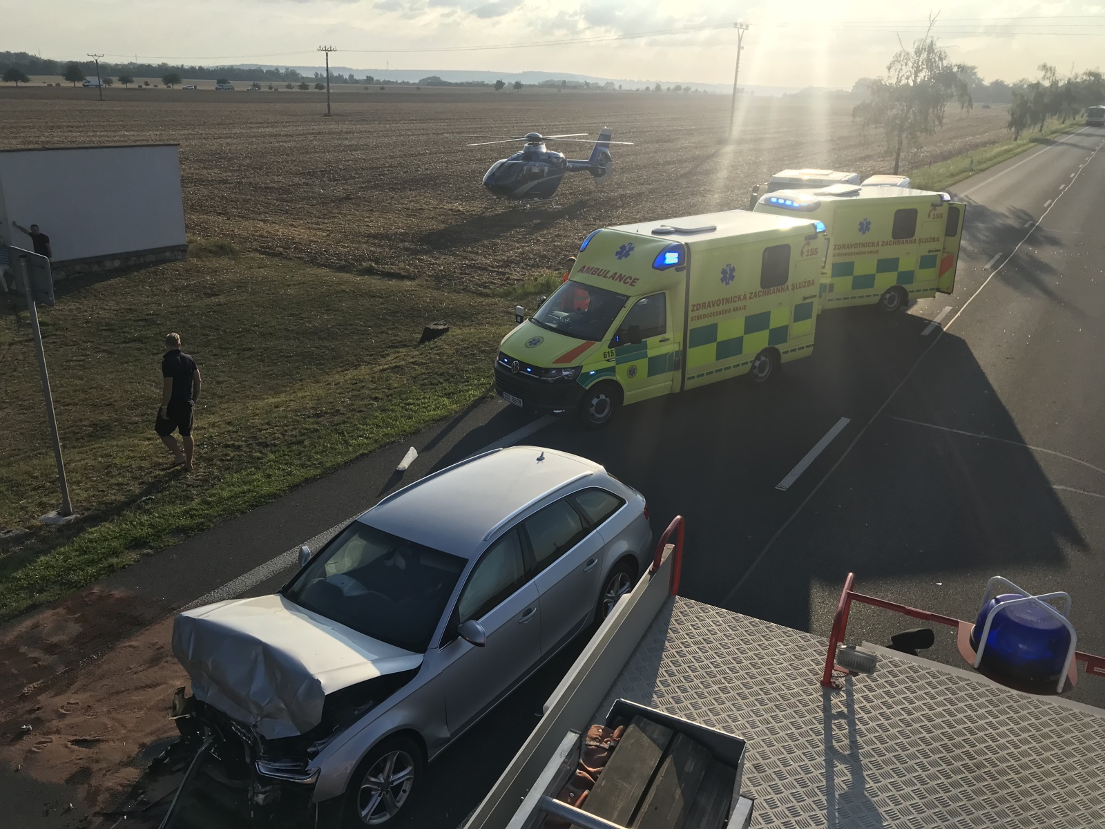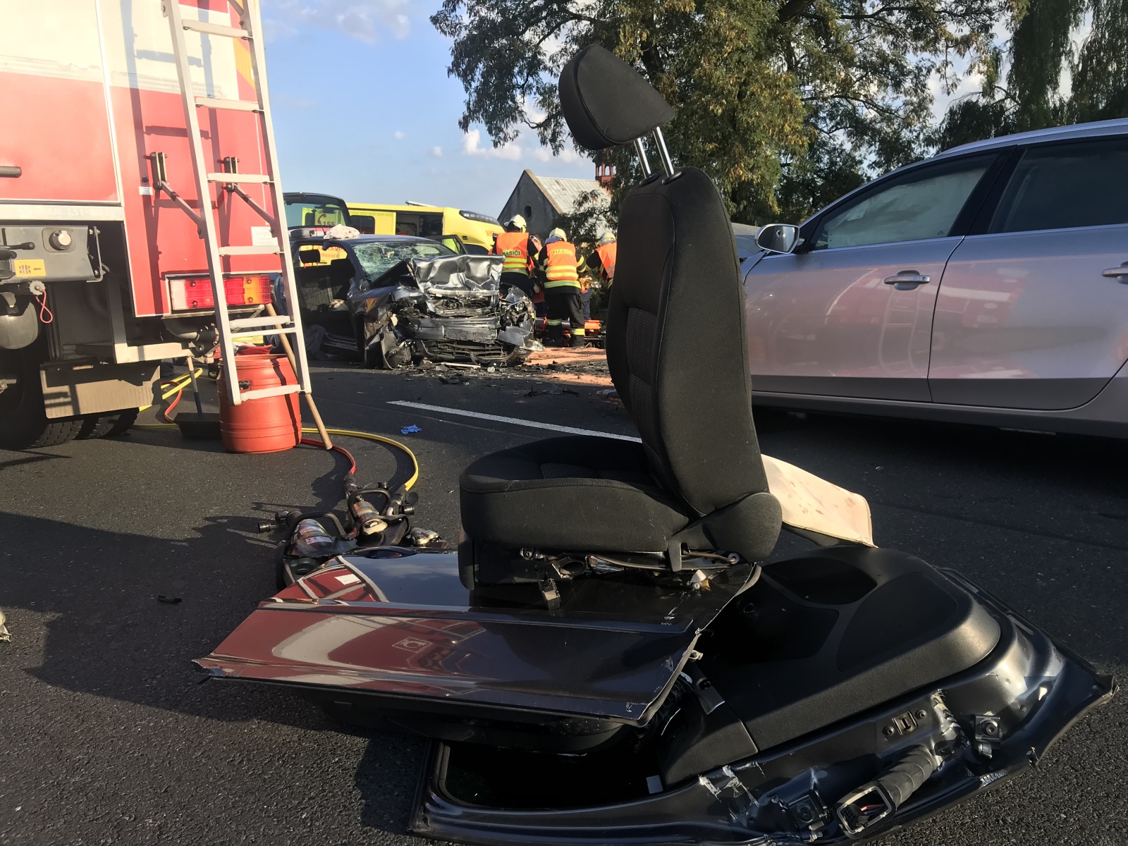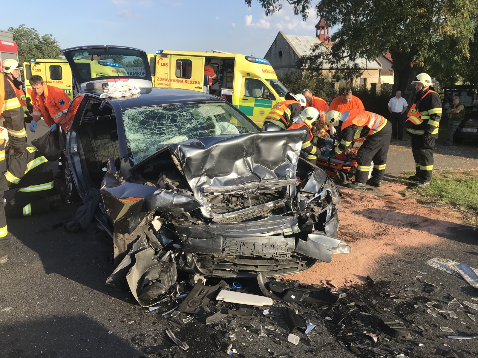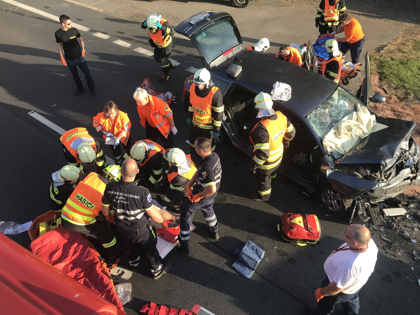 Po příjezdu hasičů na místo bylo zjištěno, že jde o čelní střet dvou osobních vozidel, přičemž v jednom z nich se nacházejí zaklíněné osoby. Hasiči za použití hydraulické vyprošťovací sady začali z vozidla vyprošťovat zraněné osoby, které si následně převzala do péče přivolaná zdravotnická záchranná služba. Vzhledem k tomu, že jedno zranění bylo hodně vážné, byl na místo vyslán také vrtulník letecké záchranné služby, který osobu transportoval do nemocnice v Praze.