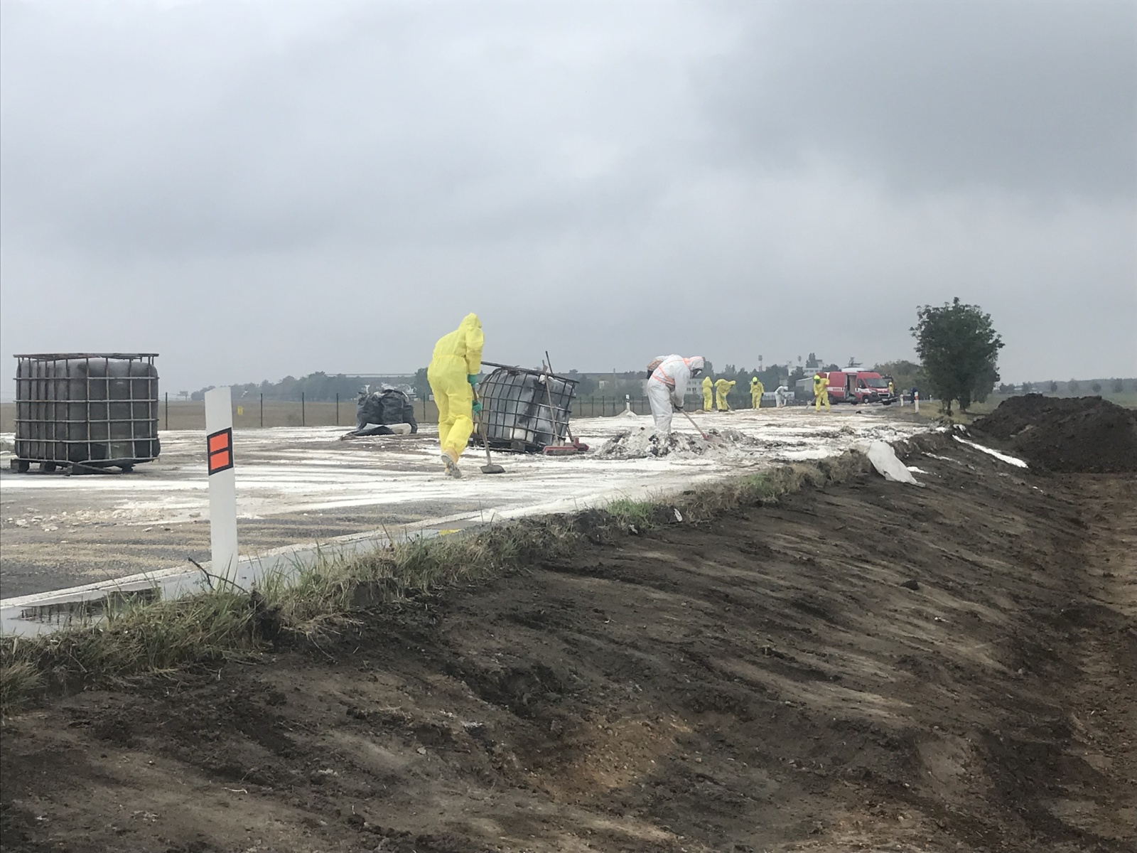 Na místo tak postupně vyjelo ještě šest jednotek, včetně Chemické laboratoře z Kamenice. V rámci mezikrajské výpomoci zasahovala i jednotka HZS hl. města Prahy, která je opěrným bodem pro chemické havárie. Hasiči později rozborem zjistili, že v jednom z kontejnerů byla přepravována 98% kyselina sírová, kapalina ve druhém barelu byla identifikována jako směs oleje s vodou.