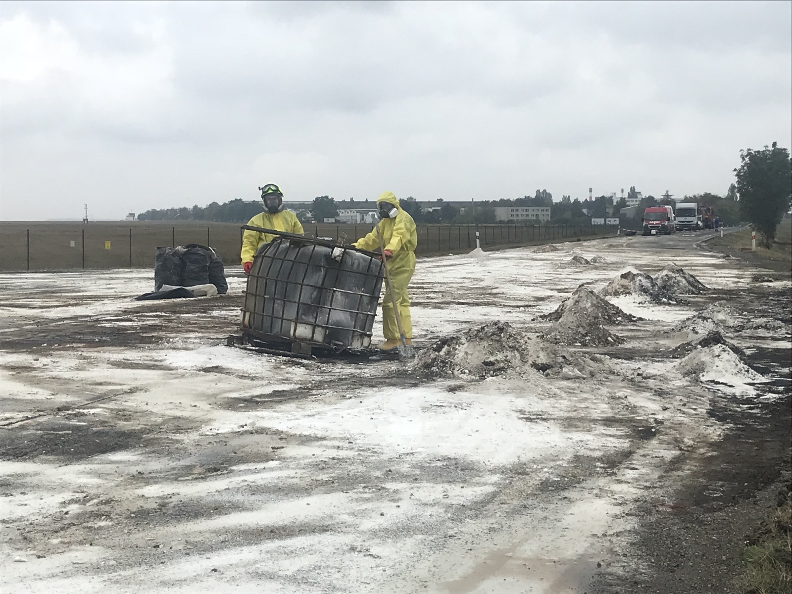 K události byli vysláni profesionální hasiči ze stanice Neratovice a také podniková jednotka Aero Vodochody Aerospace a.s. Po jejich příjezdu bylo zjištěno, že na komunikaci se nachází dva plastové kontejnery, ze kterých vytékají nějaké chemikálie.