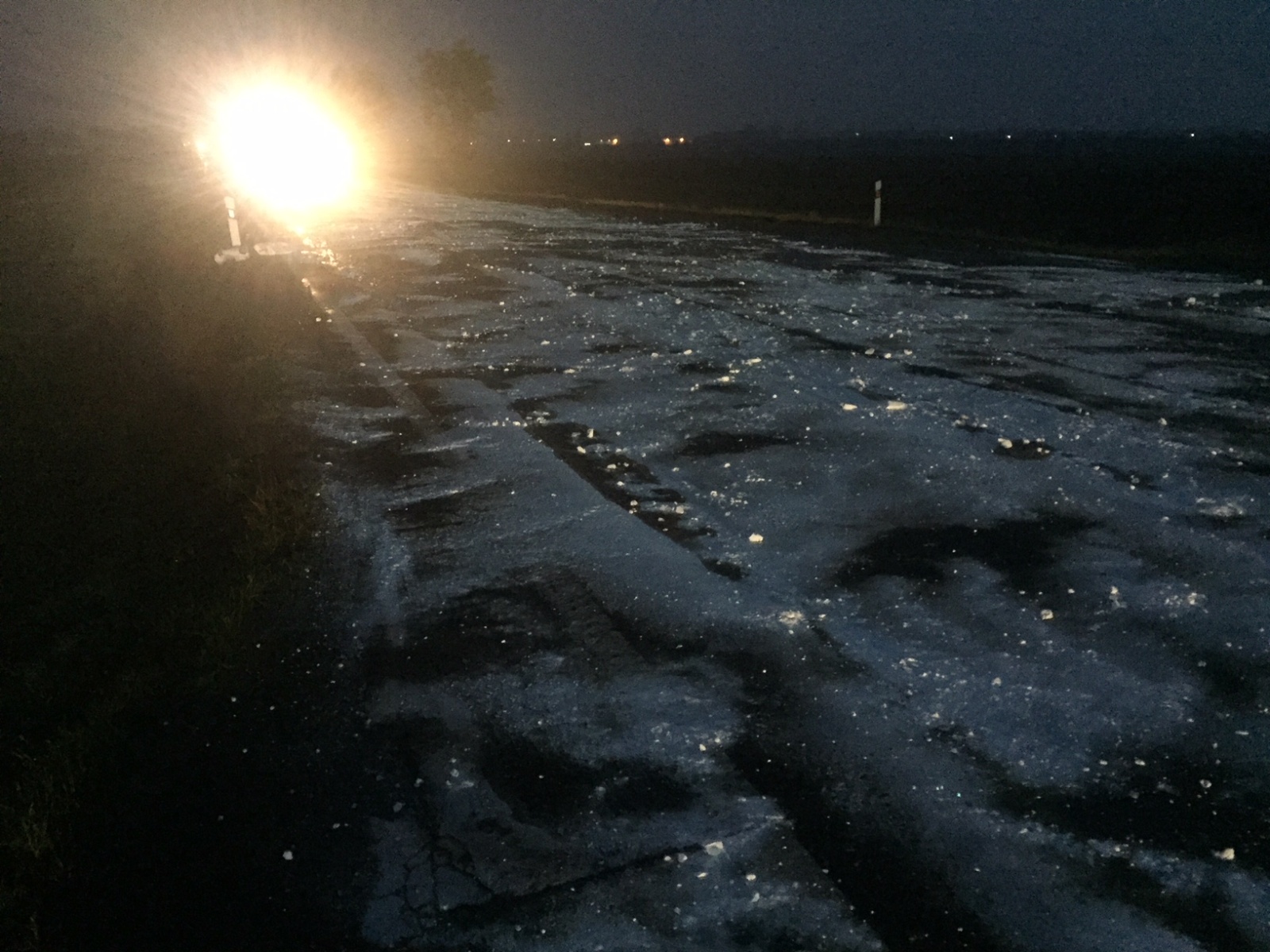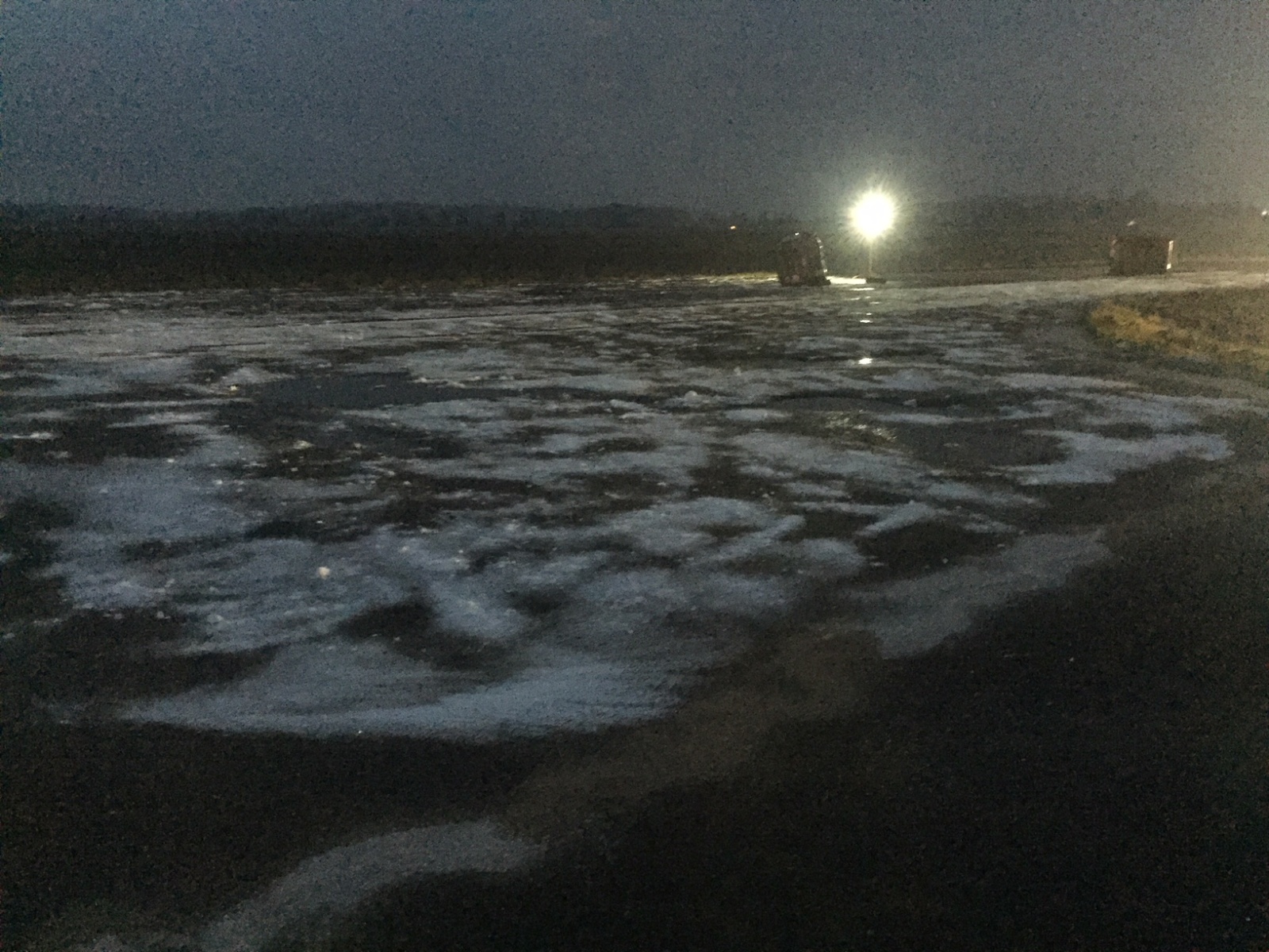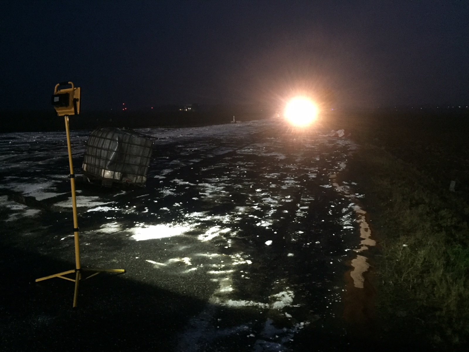 Hasiči nejprve vytyčili nebezpečnou zónu a teprve pak v ochranných oblecích s dýchací technikou zahájili podrobný průzkum, při kterém se potvrdilo, že látka je rozlitá na vozovce v délce kolem sedmdesáti metrů a dále unikla do příkopu a do půdy na okraji pole. Vzhledem k tomu, že se na místě nenacházelo žádné vozidlo, ze kterého by mohl náklad vypadnout, bylo pro hasiče zprvu velmi těžké zjistit, o jakou tekutinu jde.