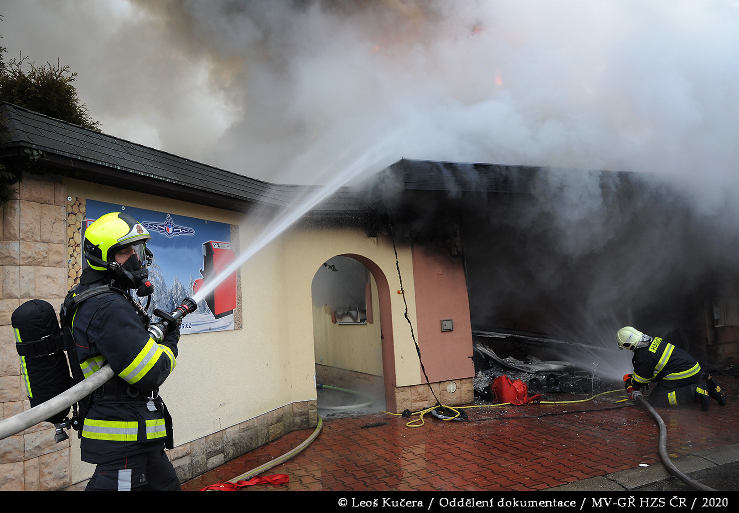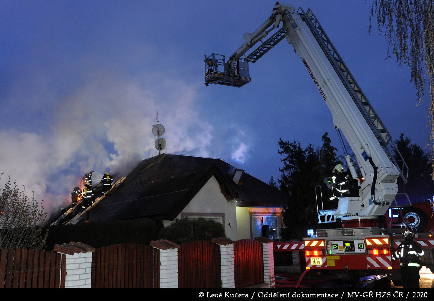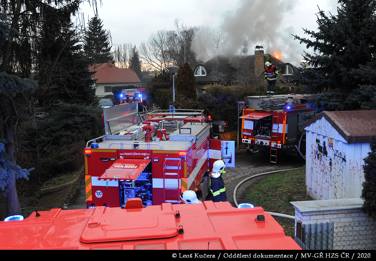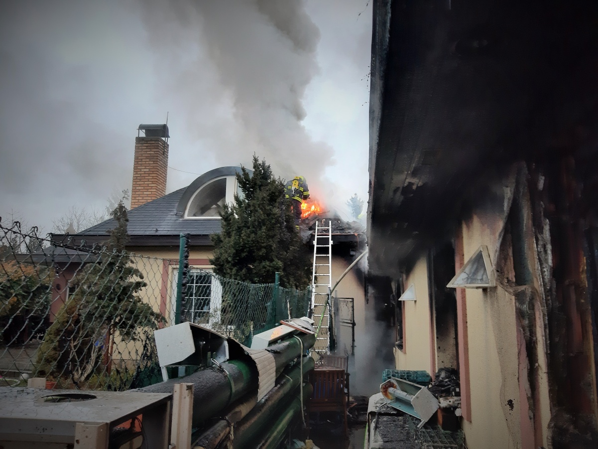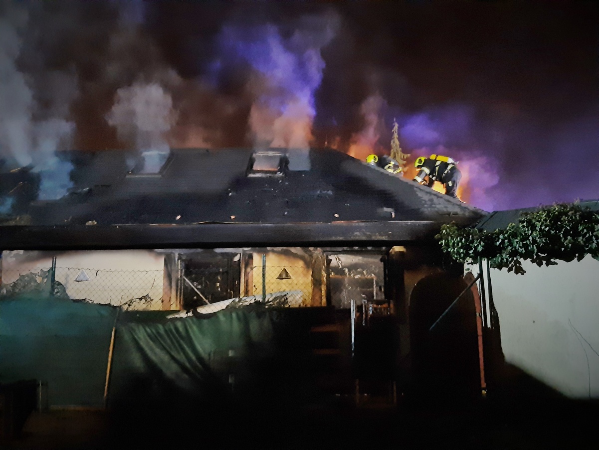 První jednotka byla na místě za deset minut od prvotního ohlášení. Provedeným průzkumem bylo zjištěno, že požár zasáhl převážně garáž a dále se rozšiřuje na rozsáhlý rodinný dům, ve kterém se nikdo nenacházel. Hasiči se za pomoci několika C proudů a vysokotlaku pokusili zabránit dalšímu šíření plamenů. Vzhledem k tomu, že dům měl dřevěnou šindelovou střechu, která byla ze spodní části zakryta obložením, požár se i přes jejich veškerou snahu rozšiřoval střešní konstrukcí a půdním prostorem dál. Po příjezdu byla následně nasazena také výšková technika.