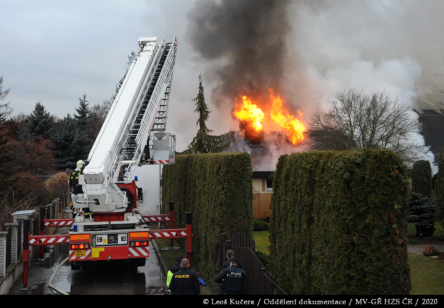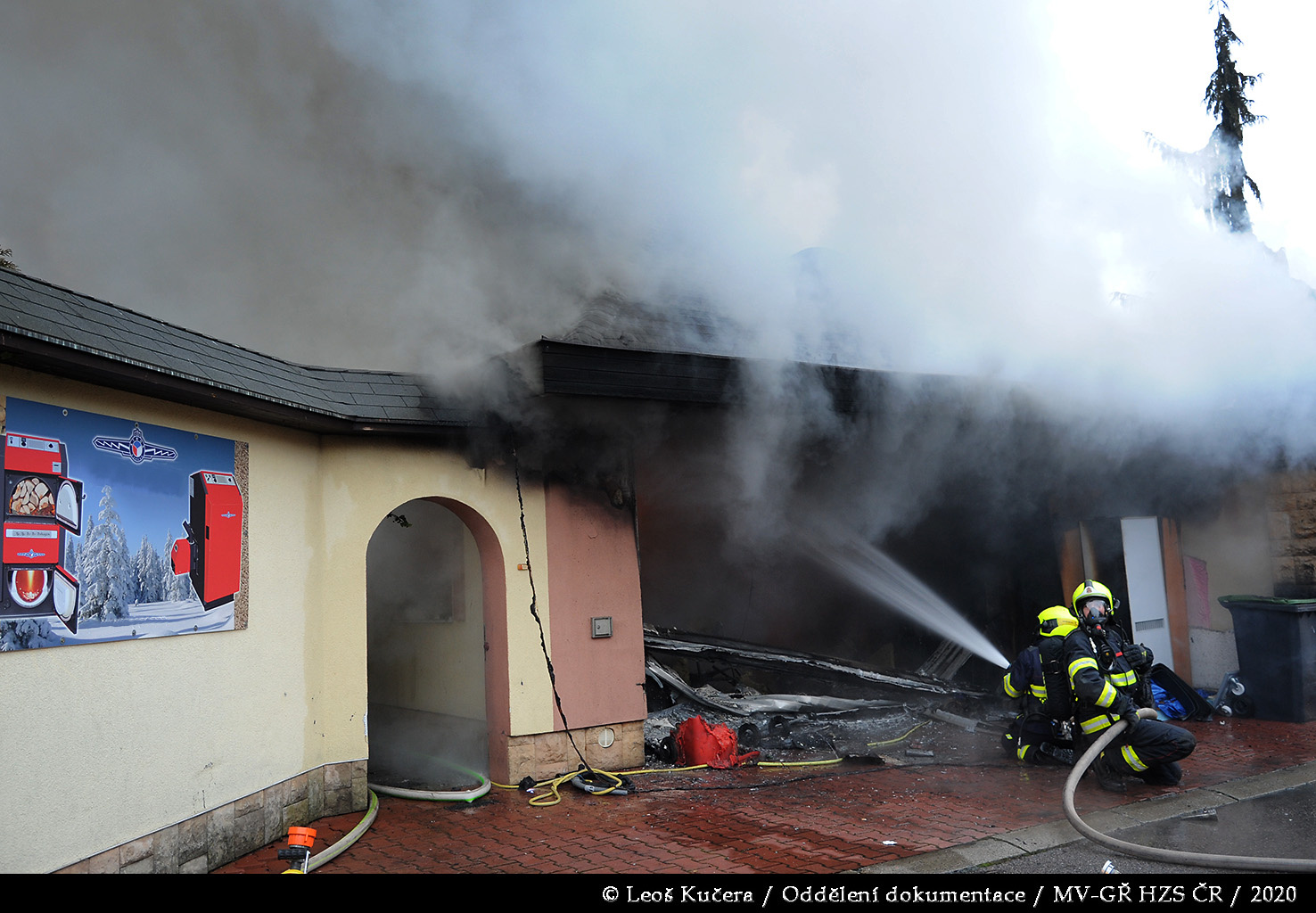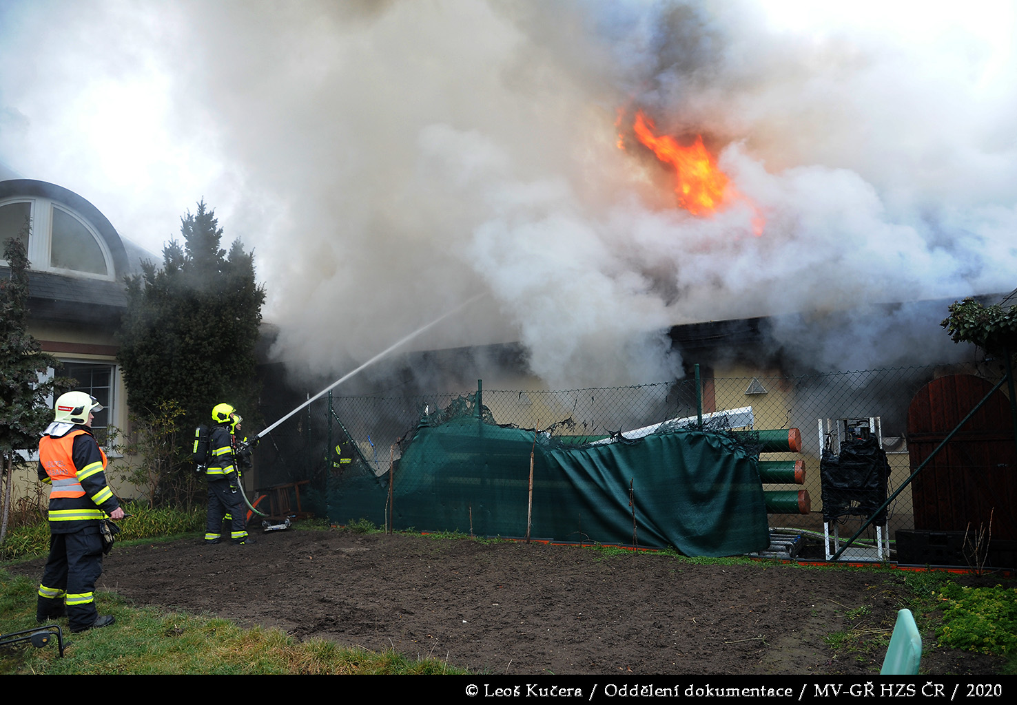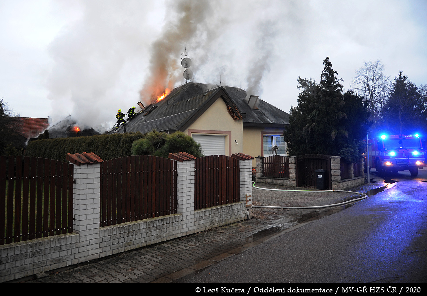 První jednotka byla na místě za deset minut od prvotního ohlášení. Provedeným průzkumem bylo zjištěno, že požár zasáhl převážně garáž a dále se rozšiřuje na rozsáhlý rodinný dům, ve kterém se nikdo nenacházel. Hasiči se za pomoci několika C proudů a vysokotlaku pokusili zabránit dalšímu šíření plamenů. Vzhledem k tomu, že dům měl dřevěnou šindelovou střechu, která byla ze spodní části zakryta obložením, požár se i přes jejich veškerou snahu rozšiřoval střešní konstrukcí a půdním prostorem dál. Po příjezdu byla následně nasazena také výšková technika.