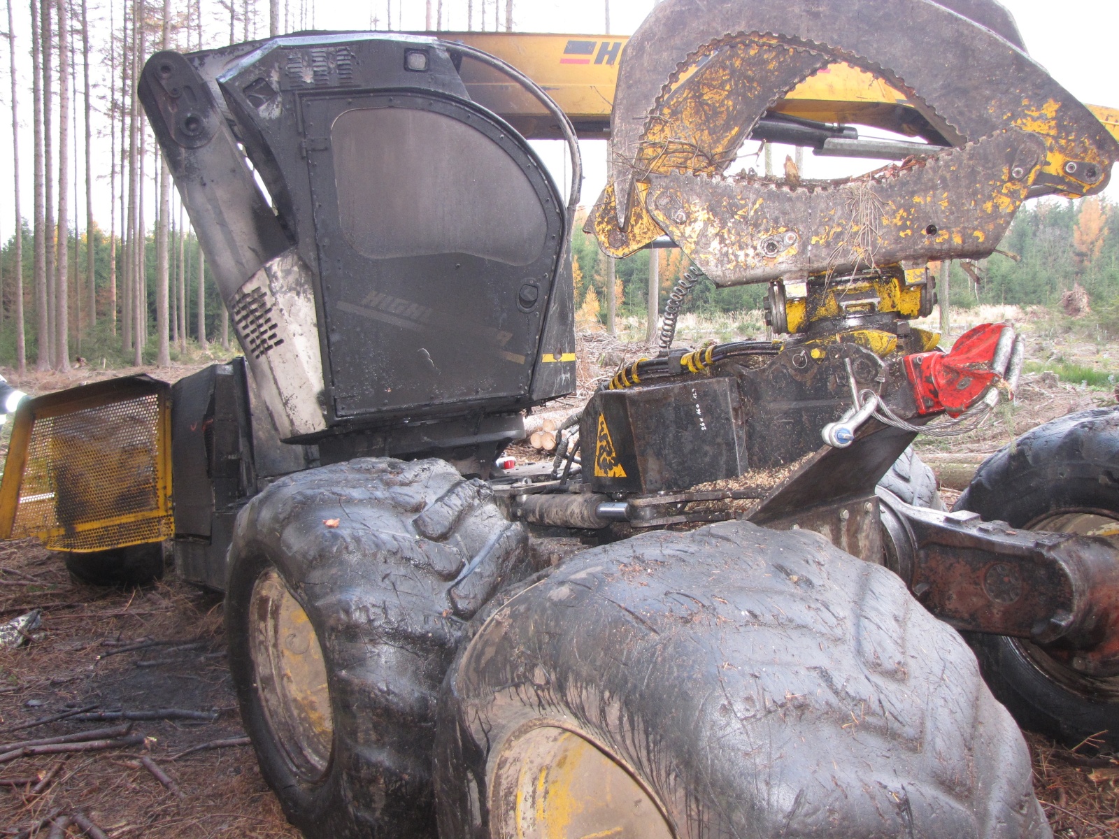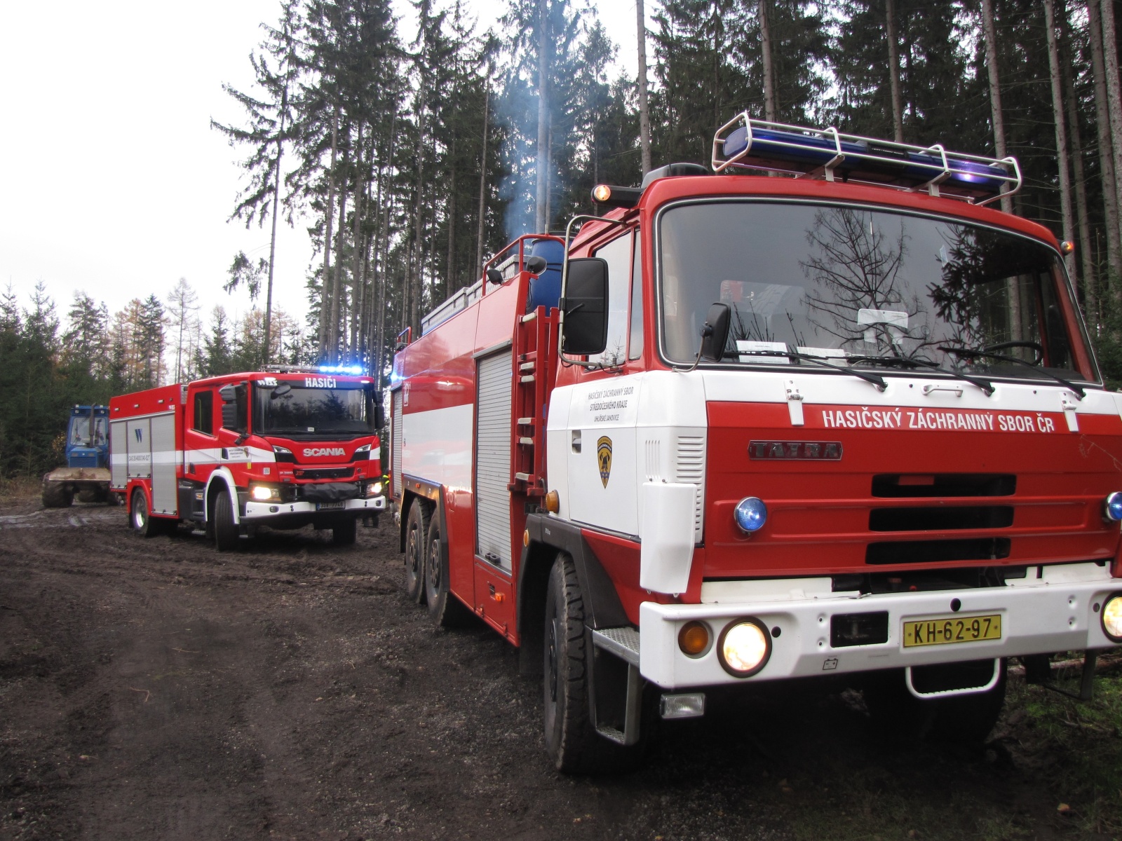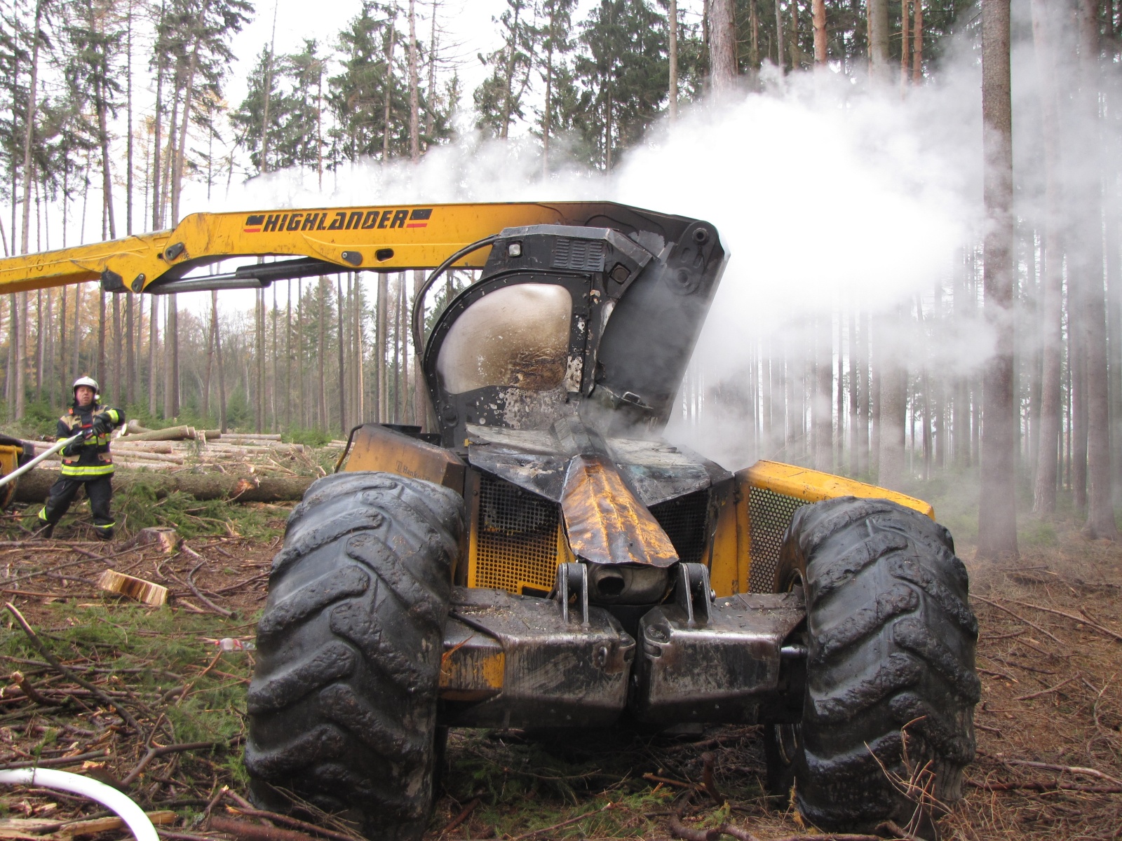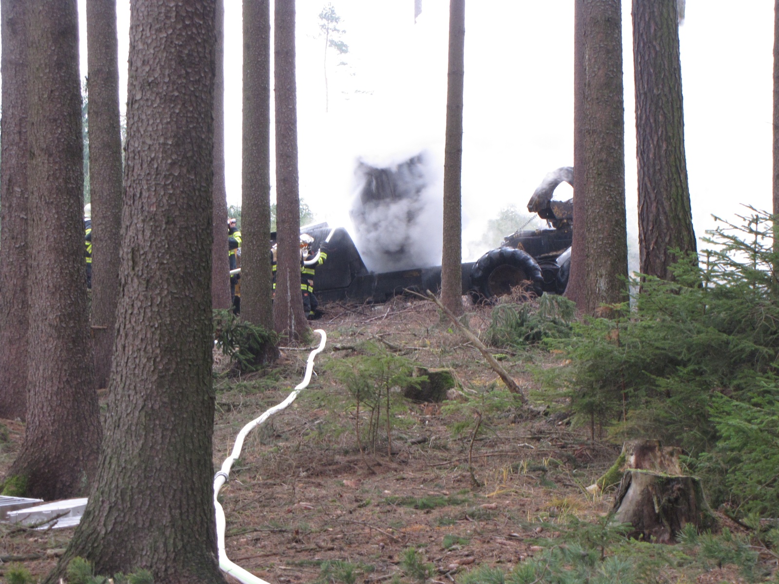 Velitel zásahu průzkumem zjistil, že jde o požár kabiny harvestoru (víceoperační stroj, který při těžbě dříví kácí, odvětvuje, rozřezává a ukládá strom v jednom cyklu) v plném rozsahu. Hasiči na zdolání plamenů nasadili jeden C proud, ale jelikož přehořely hadice s olejem, tak byl na místo povolán i zástupce životního prostředí. K úniku pohonných hmot však nedošlo. Zhruba hodinu po nahlášení byl oheň zcela pod kontrolou a bylo možné nahlásit lokalizaci, zanedlouho také likvidaci.