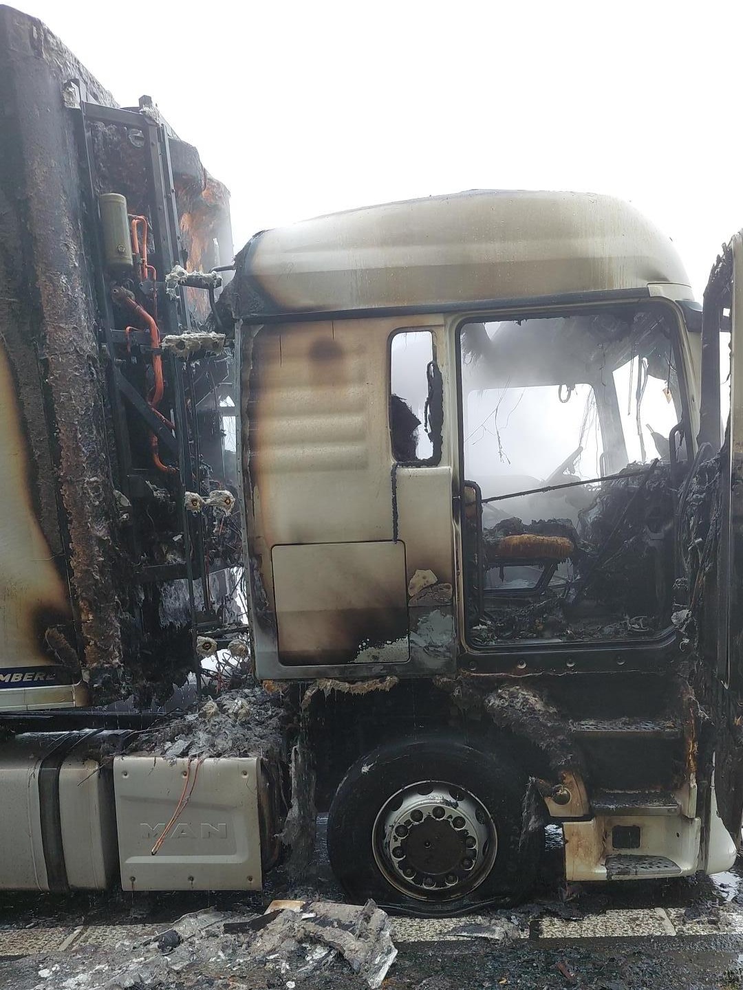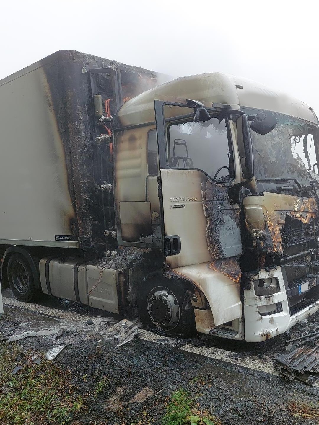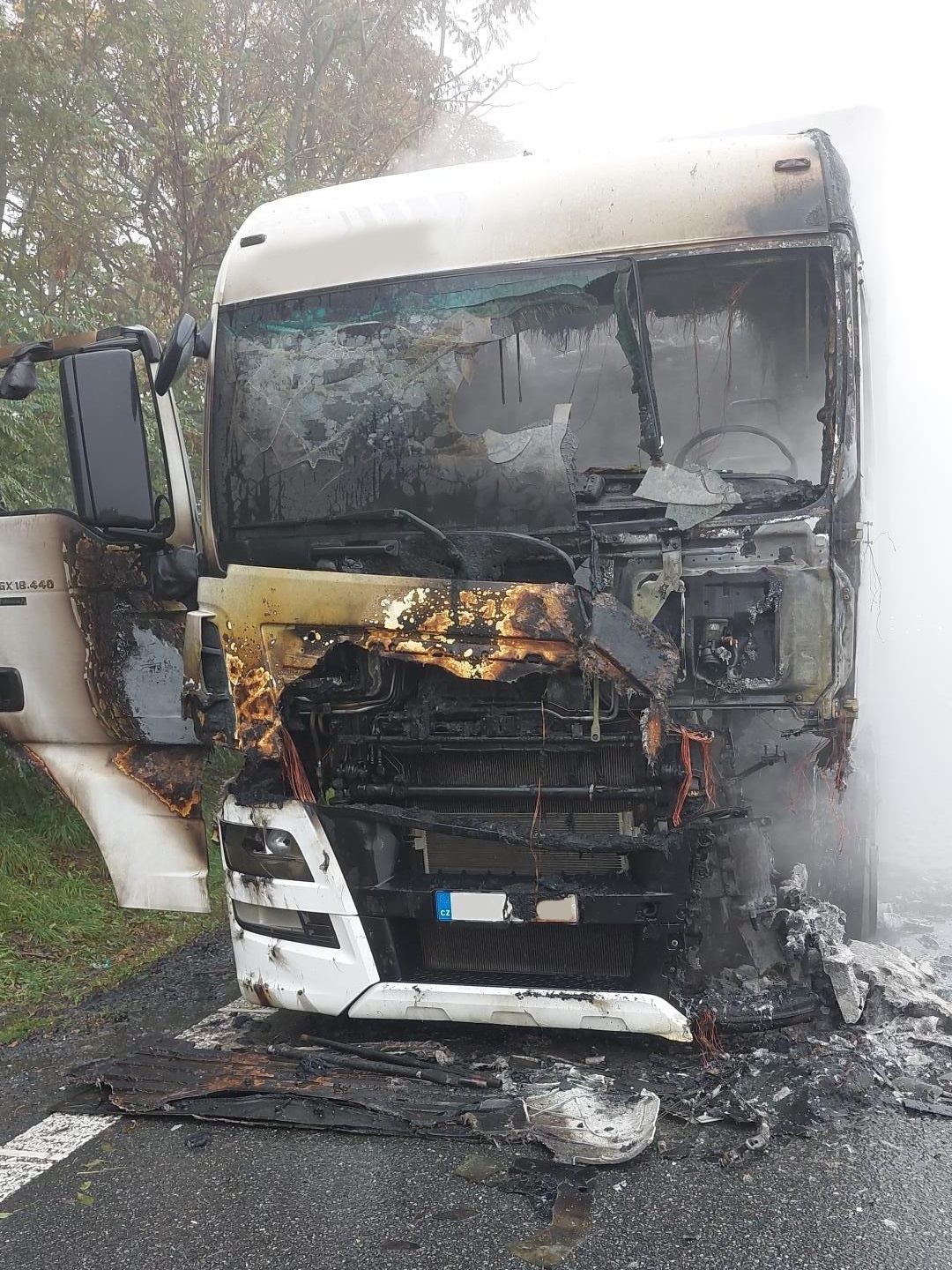 Při příjezdu na místo už byla kabina tahače celá v plamenech, které přeskočily i na chladicí agregát návěsu.