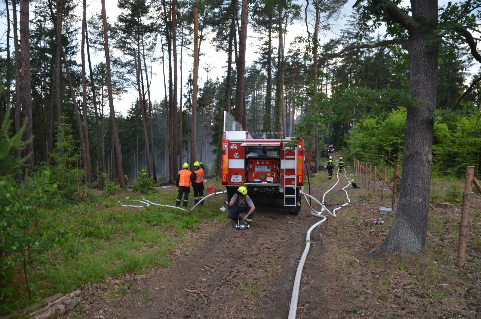První jednotka, která přijela na místo asi za deset minut od ohlášení, zjistila, že hoří tráva, hrabanka a náletové dřeviny ve spodní partii lesa na téměř dvouhektarové ploše ve svažitém terénu, kam vede jen úzká cesta nevhodná pro těžkou hasičskou techniku. Po natažení hadicového vedení byl zahájen zásah pomocí jednoho C a dvou D proudů. Těmi se podařilo požár v poměrně krátké době lokalizovat alespoň do té míry, že už se dál nerozšiřoval.