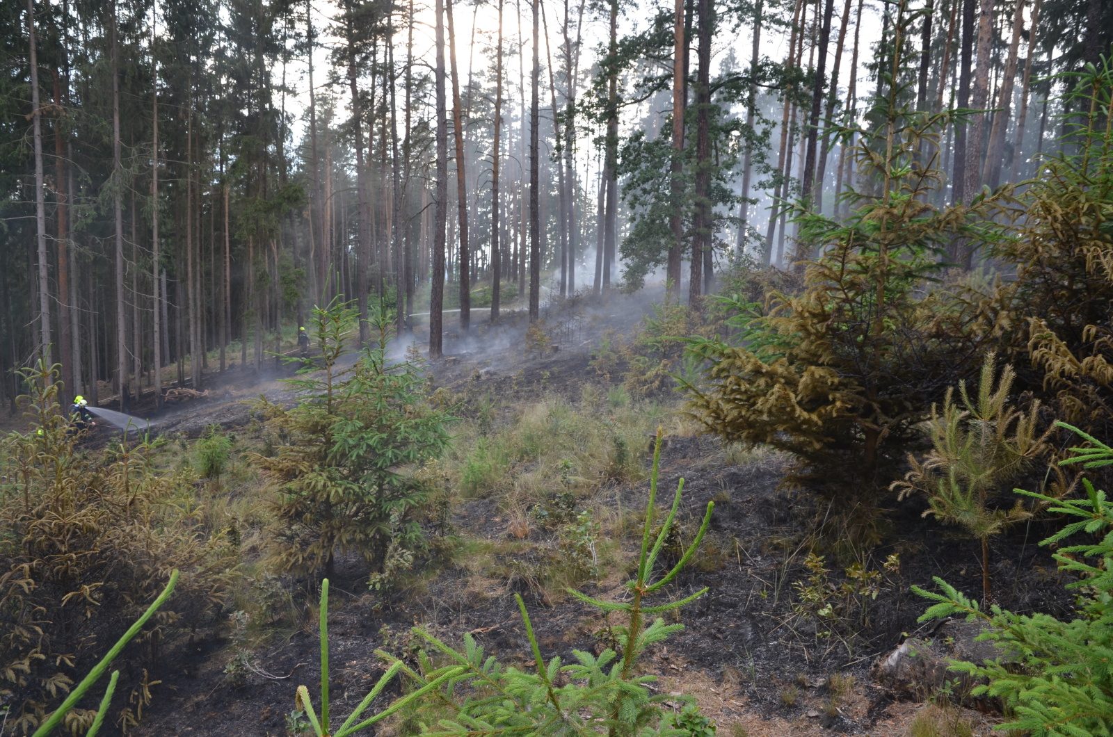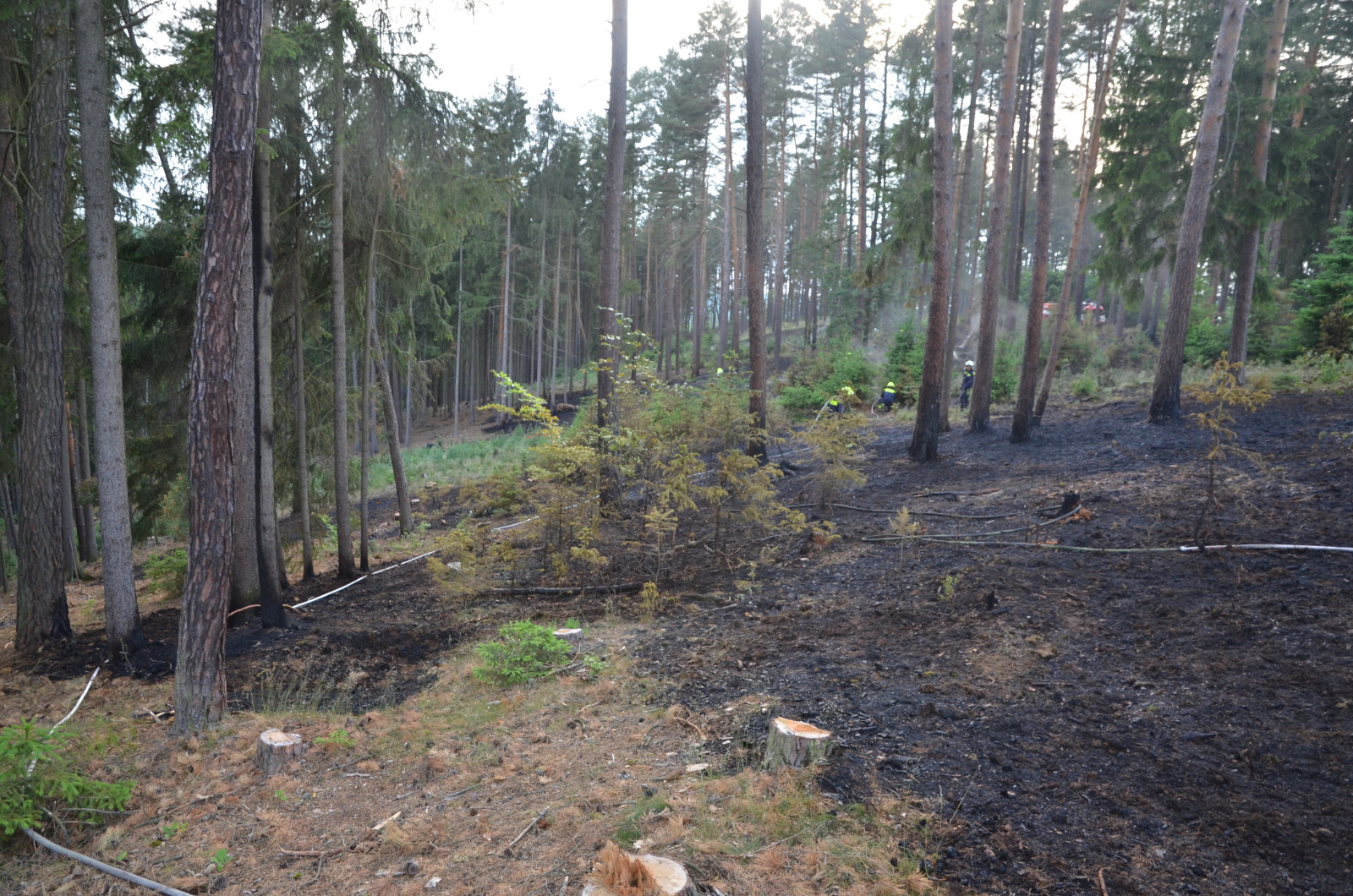 Zasažená oblast byla následně rozdělena na tři sektory, ve kterých byla nově se objevující ohniska likvidována sedmi D proudy. Zásah byl ukončen v devět hodin večer s tím, že na dohlídku do ranních hodin zůstala v lese místní úhonická jednotka. Přivolaný revírník spolu s vyšetřovatelem stanovil vzniklou škodu na deset tisíc korun, uchránit se podařilo porost v hodnotě dvou set tisíc. Požár s největší pravděpodobností vznikl lidskou nedbalostí.