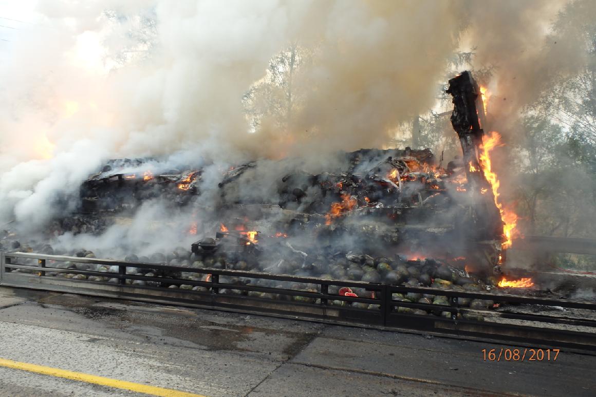 Při příjezdu na místo hořel celý kamion, v průběhu požáru došlo rozsypání převážených melounů na dálnici a k netěsnosti na palivové nádrži. Hořící nafta zasáhla i do směru na Brno, neunikla však mimo dálniční těleso. Během pěti minut od příjezdu první cisterny hasiči dostali požár pod kontrolu pomocí dvou proudů C52 a jednoho vysokotlakého.