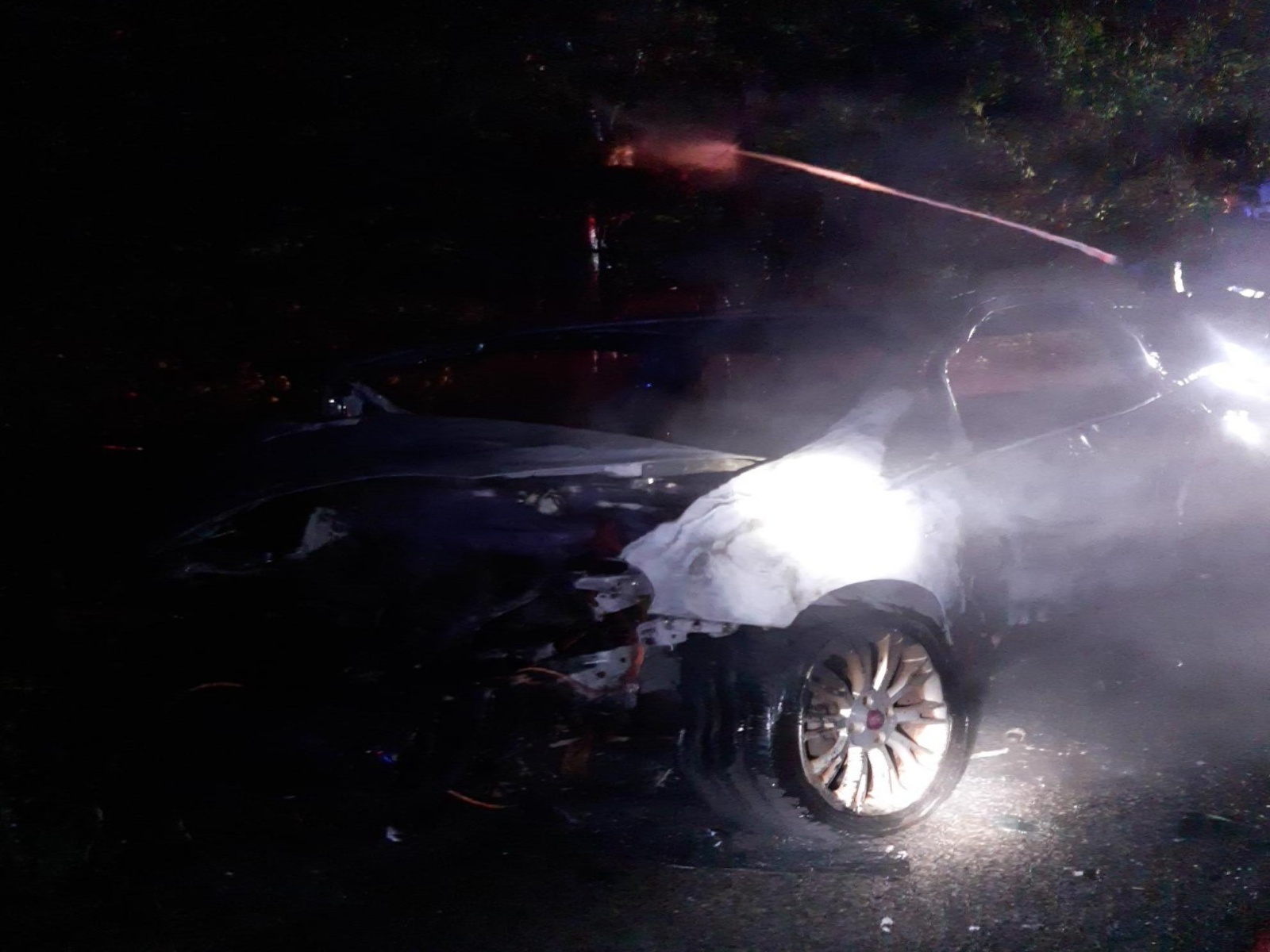 Po necelých deseti minutách od přijetí oznámení byla první jednotka na místě nahlášeného požáru. Provedeným průzkumem bylo zjištěno, že došlo k dopravní nehodě osobního automobilu a vozidlo začalo po nárazu hořet. Hasiči použili k likvidaci plamenného hoření vysokotlaký vodní proud. Oheň se podařilo dostat pod kontrolu a tím lokalizovat v půl dvanácte v noci. Deset minut poté byl požár zlikvidován.