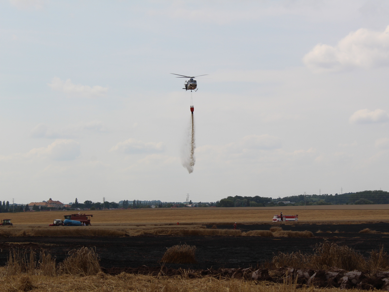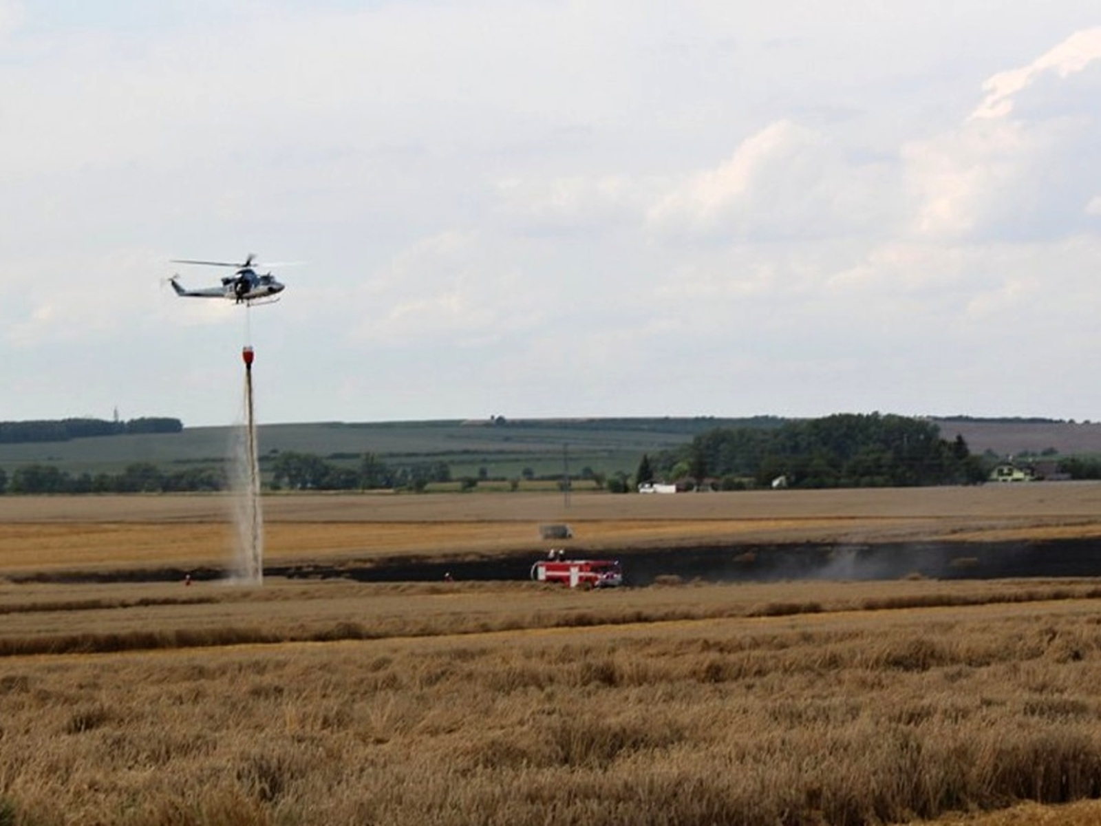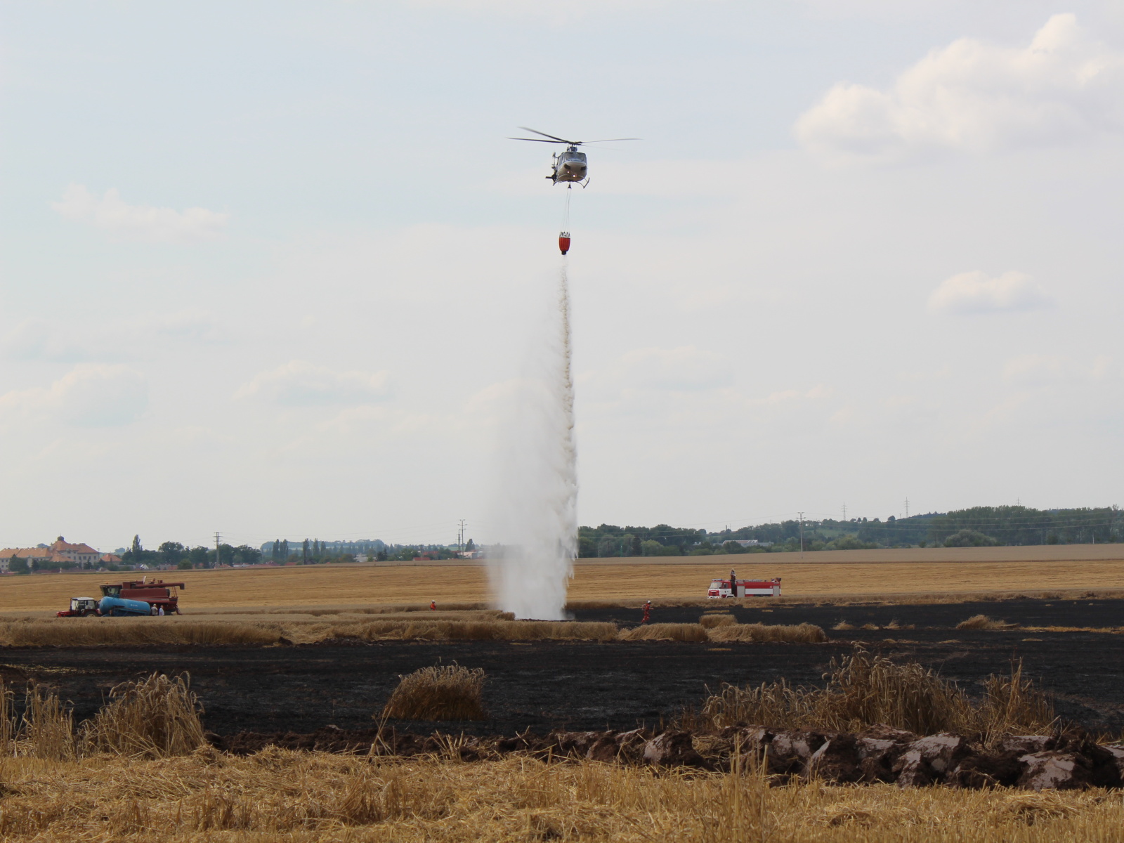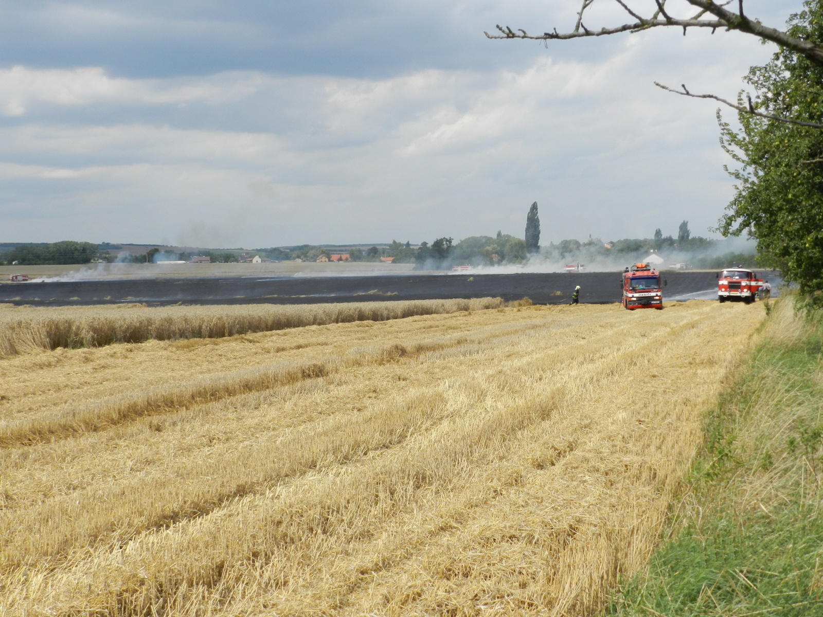 Nasazením vrtulníku, který udělal celkem šest shozů, i mnoha proudů z cisteren se podařilo požár v 15:14 hodin lokalizovat. Výrazně pomohli také zemědělci, kteří oborávali zasaženou plochu a zároveň se snažili oddělit neposekanou část pole od plamenů. Po ukončení leteckého hašení byl požární poplach snížen na druhý a v krátké chvíli na první stupeň.
