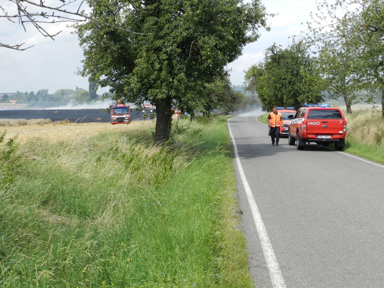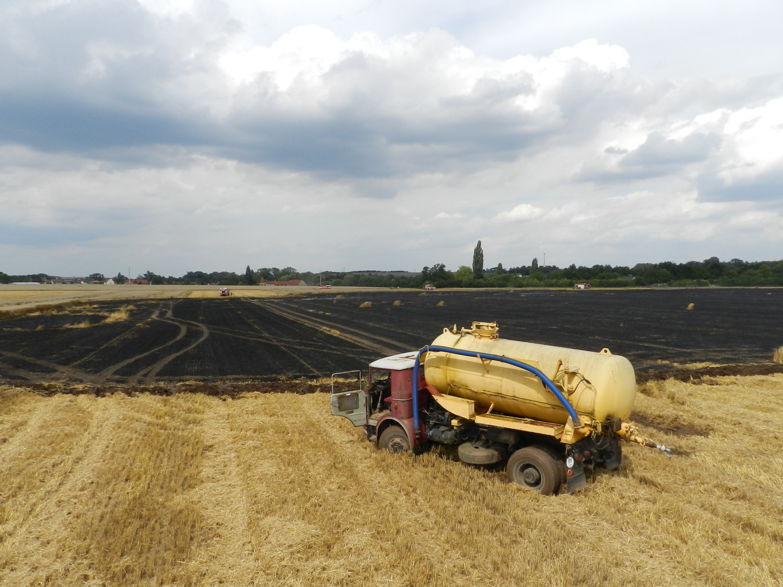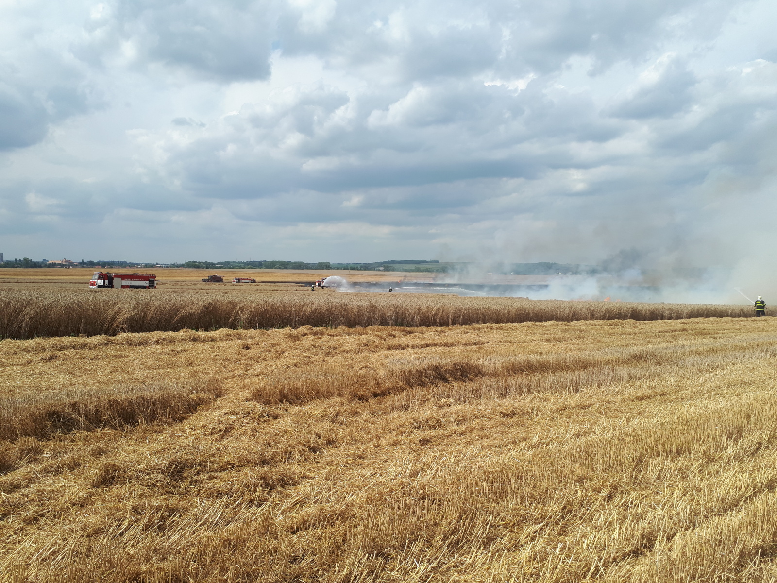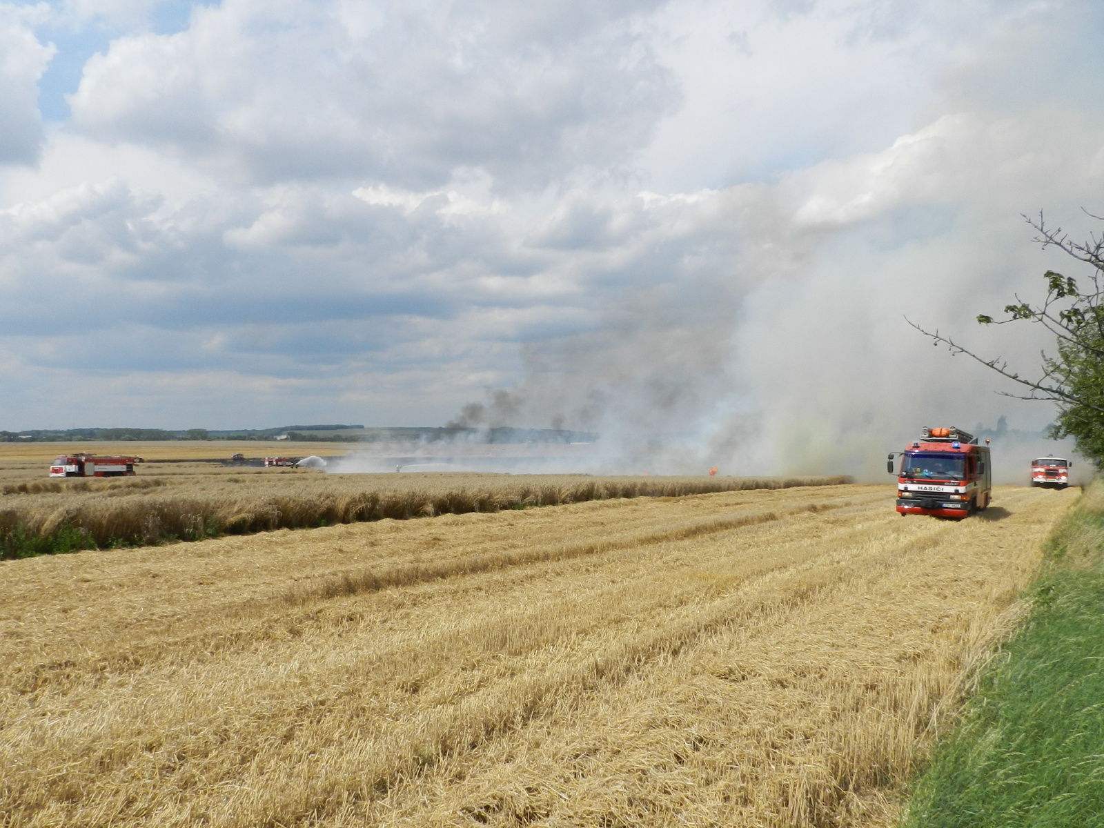Nasazením vrtulníku, který udělal celkem šest shozů, i mnoha proudů z cisteren se podařilo požár v 15:14 hodin lokalizovat. Výrazně pomohli také zemědělci, kteří oborávali zasaženou plochu a zároveň se snažili oddělit neposekanou část pole od plamenů. Po ukončení leteckého hašení byl požární poplach snížen na druhý a v krátké chvíli na první stupeň.