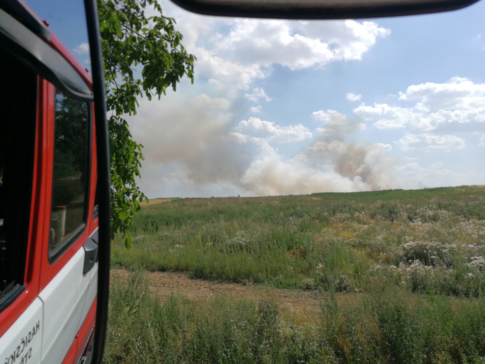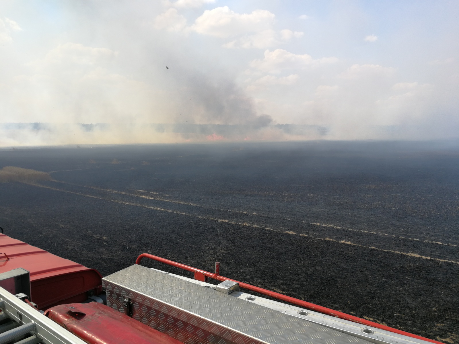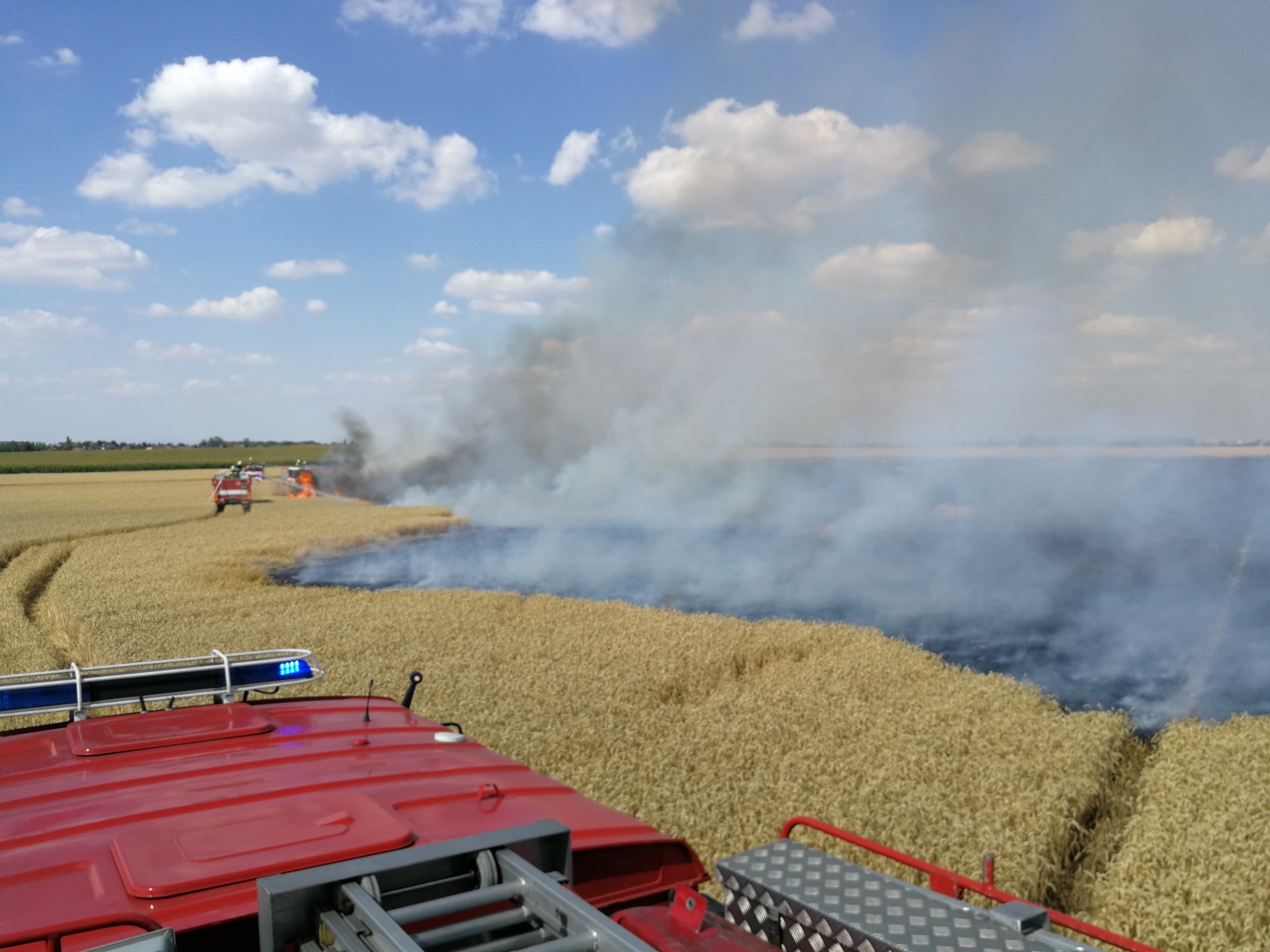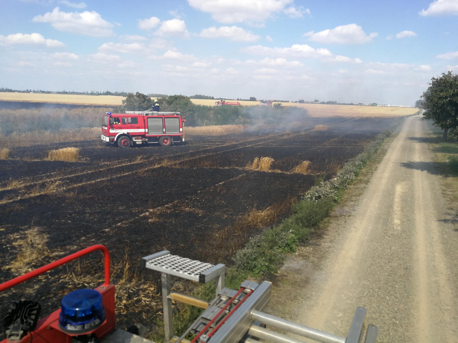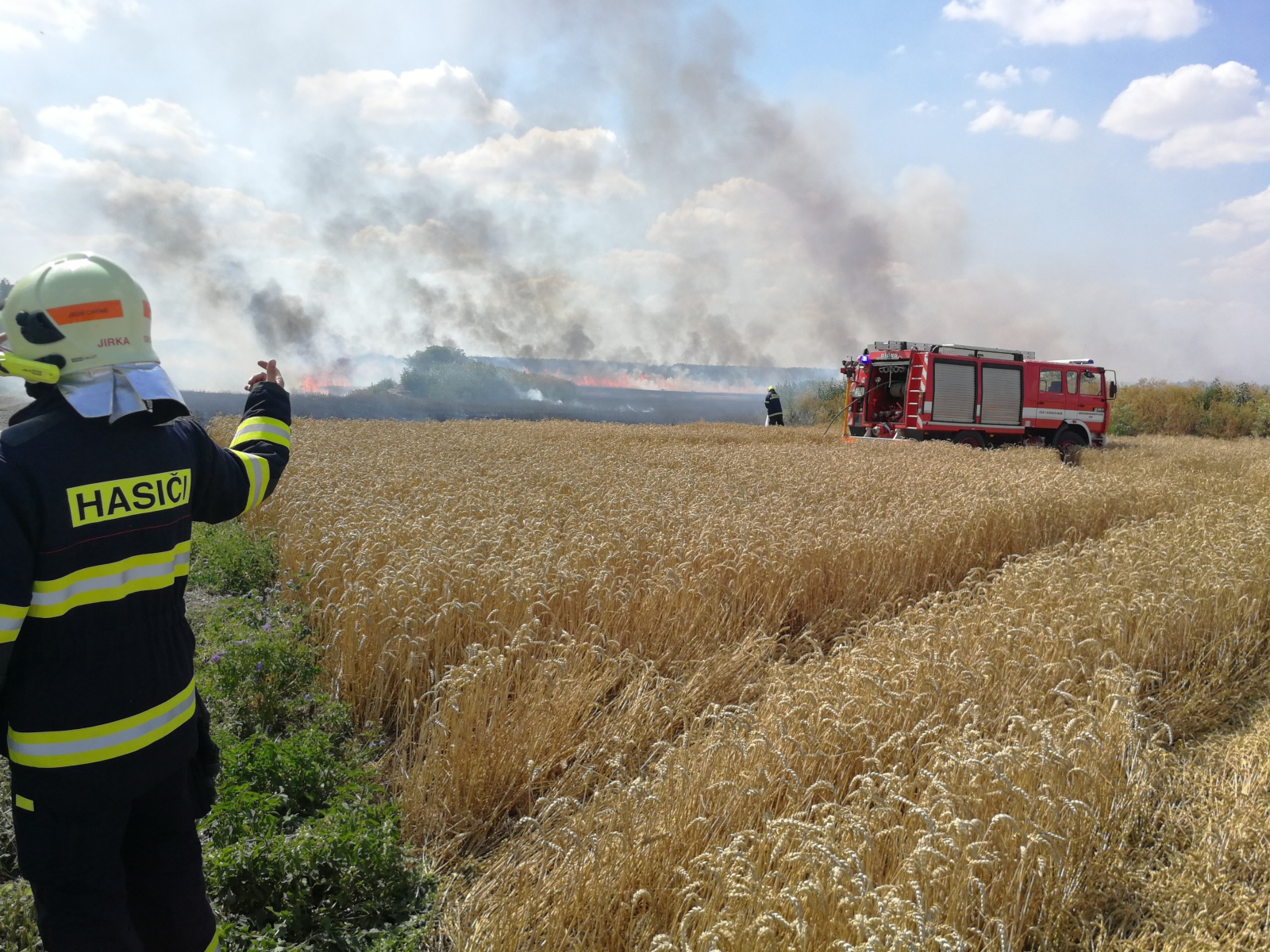 z Kladna a několik dobrovolných sborů z okolních obcí. Vzhledem k upřesňujícím telefonátům, že se požár po neposekaném poli rychle rozšiřuje, byly na místo povolány další jednotky a velitel zásahu vyhlásil druhý stupeň požárního poplachu. V rámci mezikrajské výpomoci vyjela i jednotka HZS hlavního města Prahy ze stanice Petřiny a také dva pražské dobrovolné sbory. Celkem se tak na místě sjelo dvanáct jednotek.