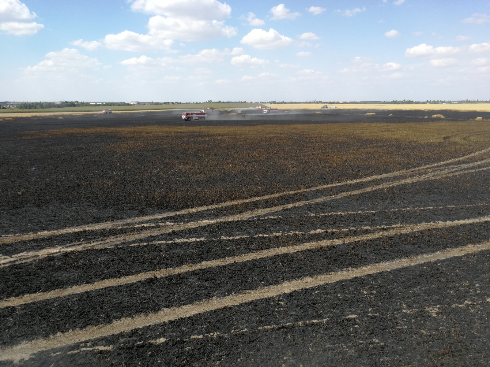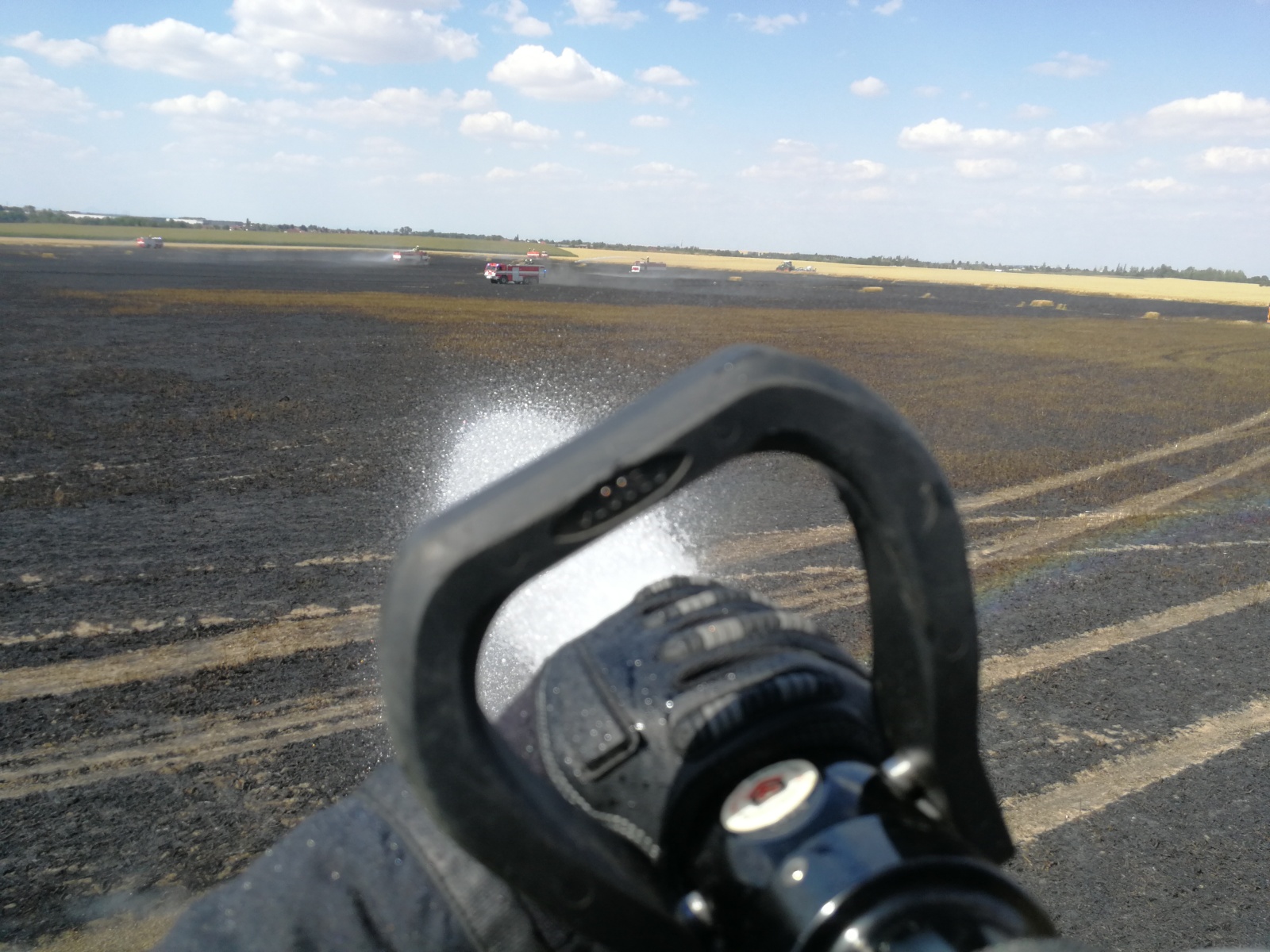 plamenů do neposečené části pole zastavili několika proudy. Částečně pomohli i sami zemědělci, kteří část pozemku oborali diskovými podmítači. Pro doplňování cisteren hasební vodou bylo na nedalekém Litovickém rybníku zřízeno čerpací stanoviště, které obsluhoval místní hostivický sbor. Po lokalizaci požáru začal velitel zásahu s redukcí jednotek a nechal snížit poplachový stupeň na základní.