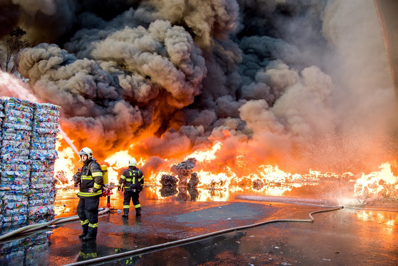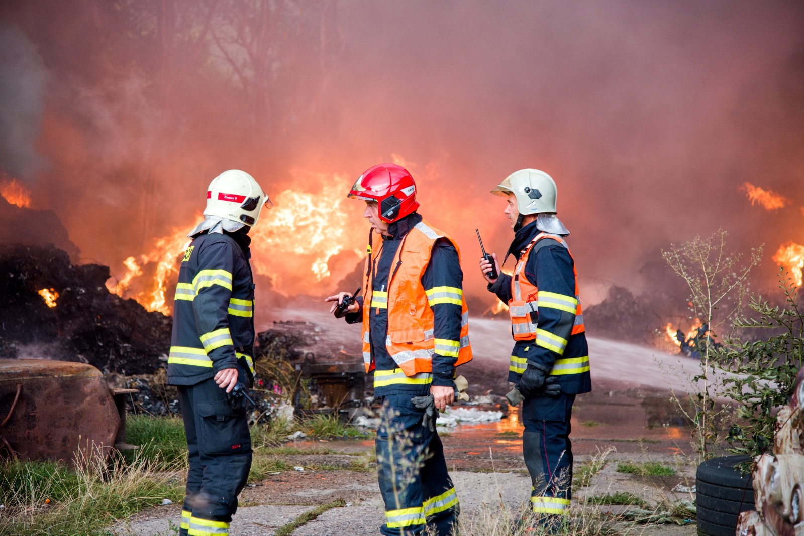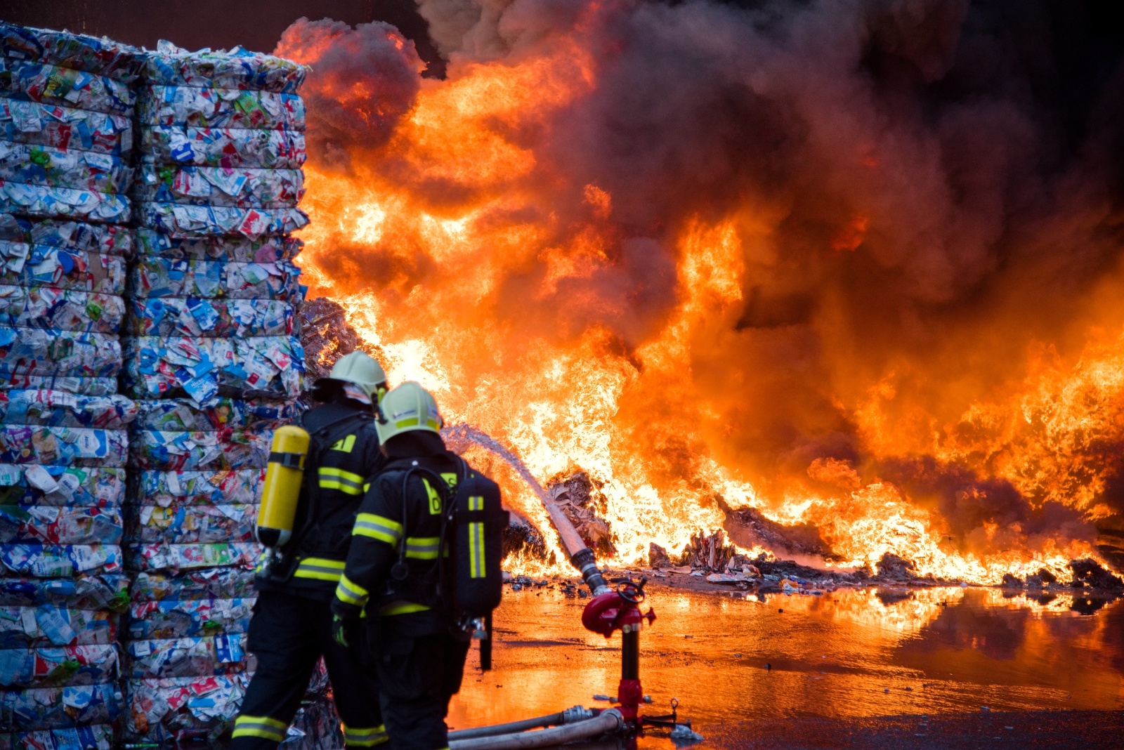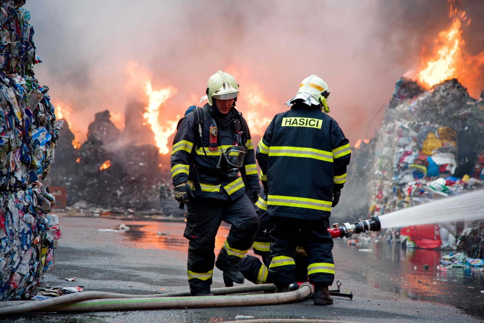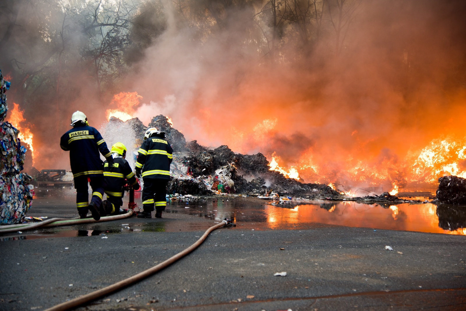 První jednotka, která dojela k požáru, upřesnila, že začínají kouřit naskladněné balíky tříděného odpadu a zatím se nemohou dostat do haly. Zároveň velitel zásahu nechal zvýšit poplachový stupeň na třetí a povolat další jednotky včetně Chemické laboratoře Kamenice, která monitorovala škodlivé látky v okolí požáru na předem vytipovaných místech. Za necelou půlhodinu však byl poplachový stupeň zvýšen na zvláštní, který je nejvyšším možným. K likvidaci požáru zamířily další jednotky. Na místní požární nádrži bylo zřízeno čerpací stanoviště, aby byla zajištěná plynulá dodávka hasební vody k likvidaci požáru. K efektivnějšímu zvládnutí zásahu bylo požářiště rozděleno na čtyři bojové úseky, každý s vlastním velitelem a byl zřízen štáb velitele zásahu. K likvidaci plamenného hoření nasadili hasiči monitory a několik vodních proudů. Zaměřili se v první fázi hlavně na ochranu okolního lesa a budovy třídírny. Na pomoc s hašením v místech, kam se hasiči nemohou dostat, byl povolán vrtulník Letecké služby Policie ČR s bambi vakem.