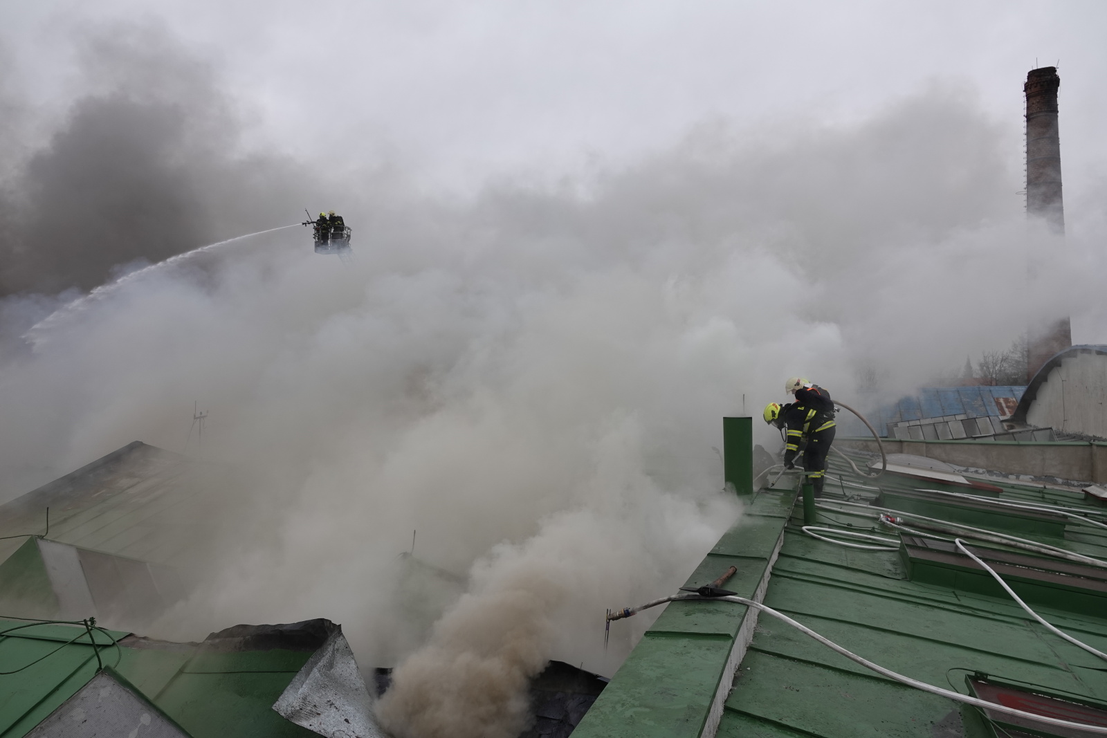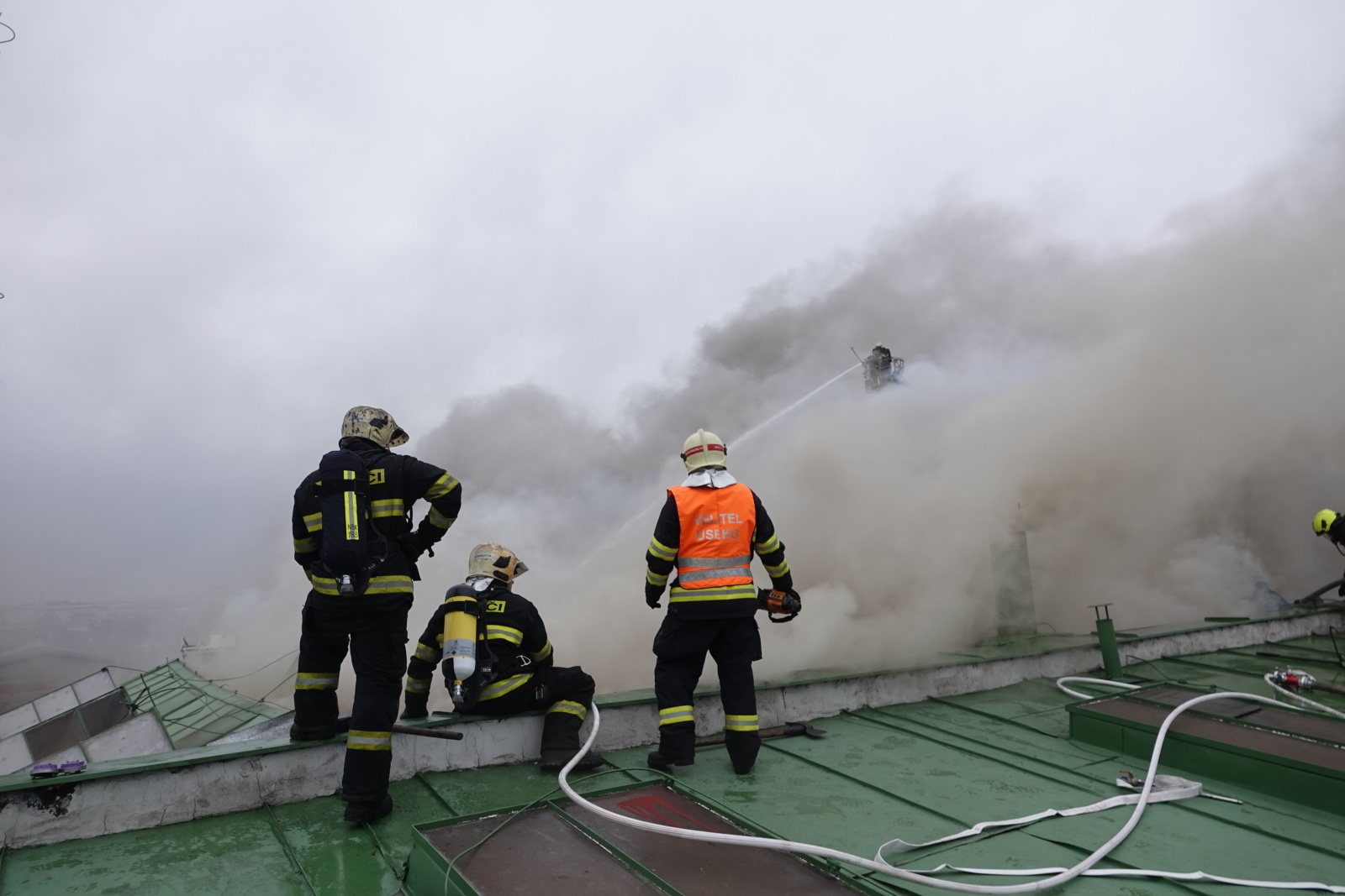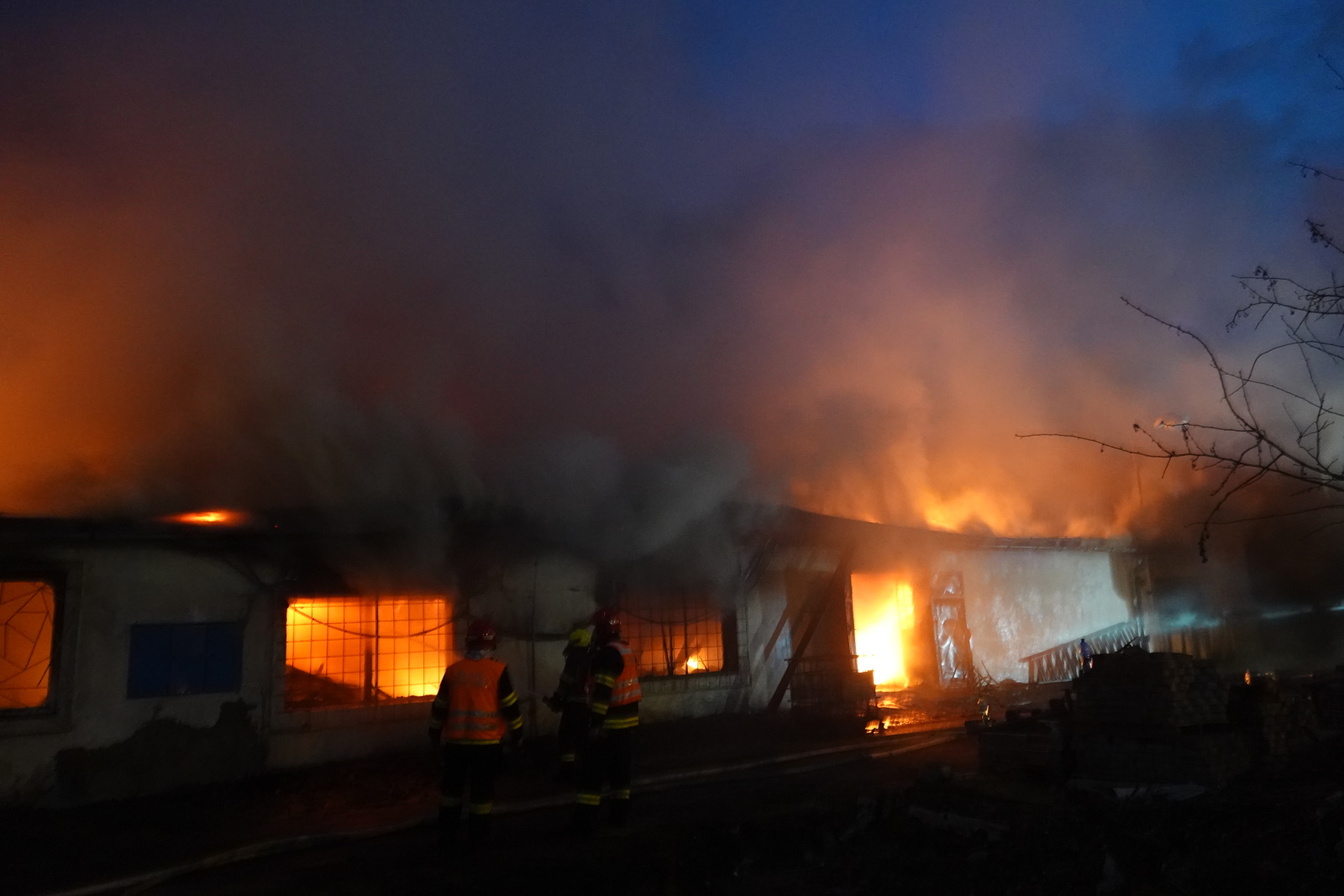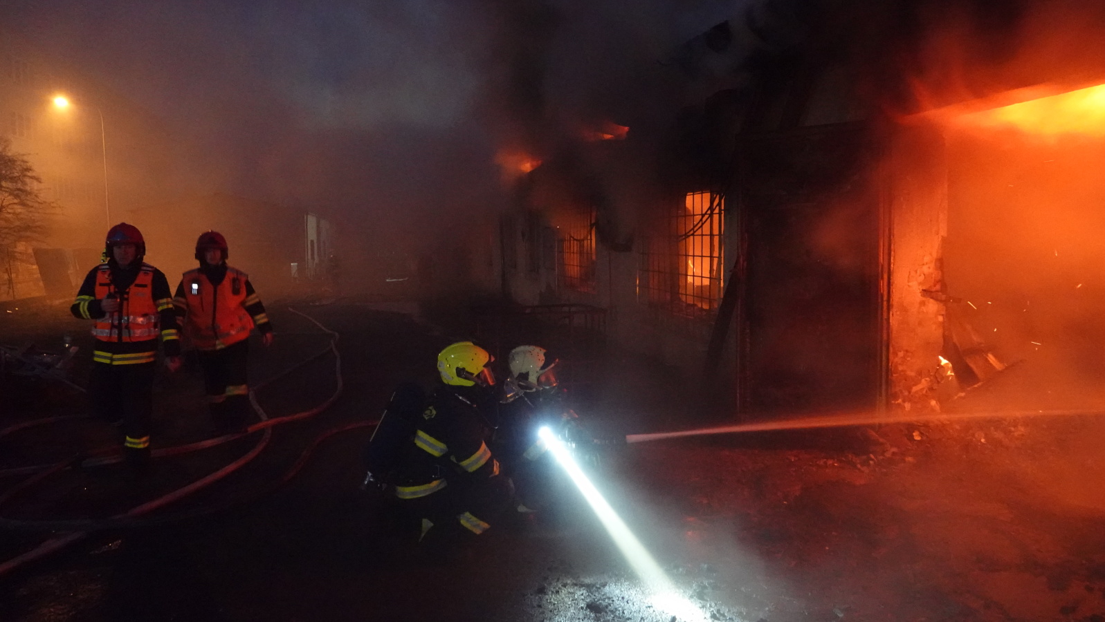 Zásah stále pokračoval na dvou úsecích s tím, že v části, kde se propadla střecha, nemohli hasiči vniknout dovnitř budovy, ale museli zasahovat z výškové techniky. Požár se šířil hlavně pod plechovou a lepenkovou střešní krytinou, takže bylo složité se k plamenům dostat. Hasiči tak na několika místech prořezali do plechového pláště otvory. Kolem páté hodiny ranní zasahovalo na místě přes sto profesionálních a dobrovolných hasičů.