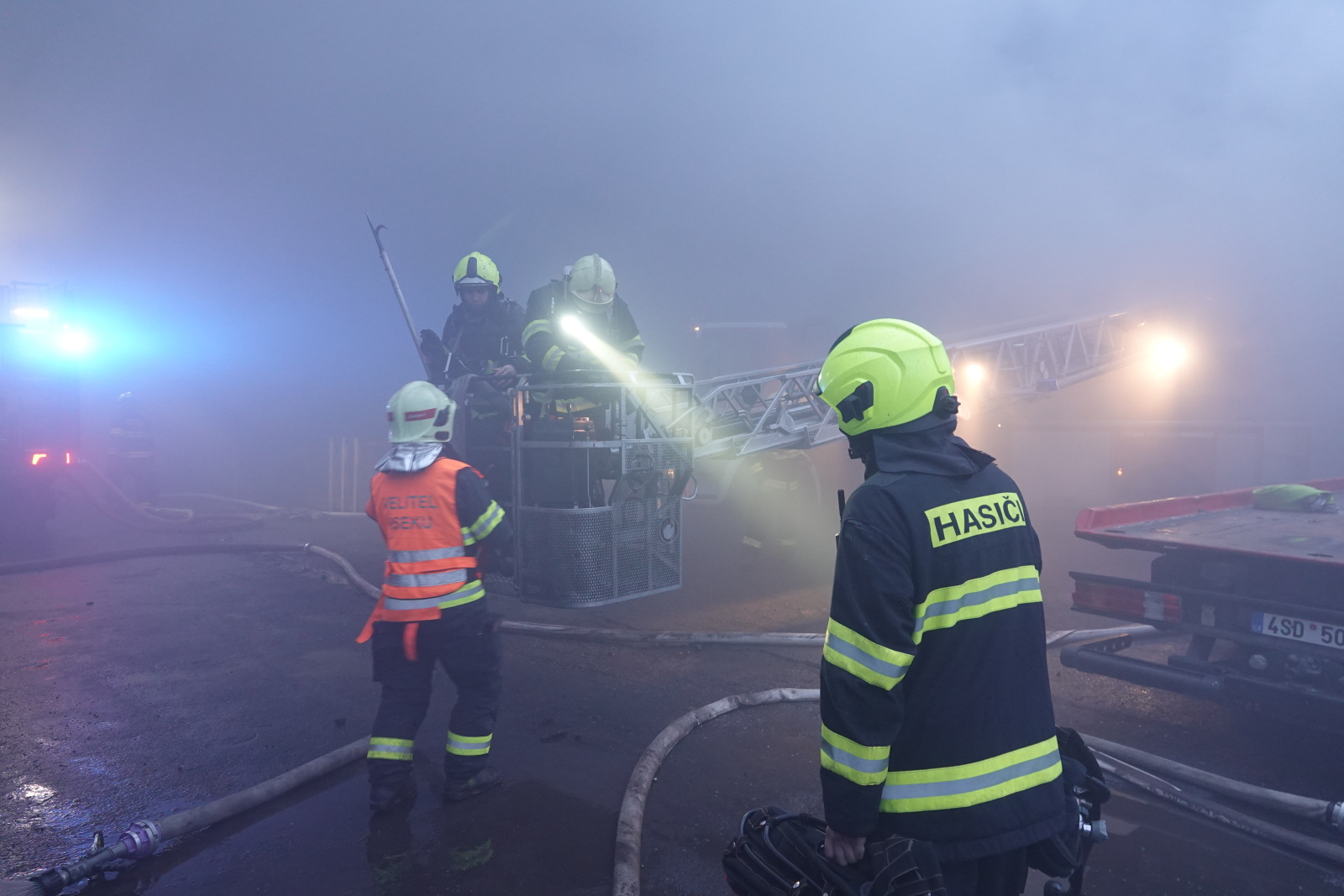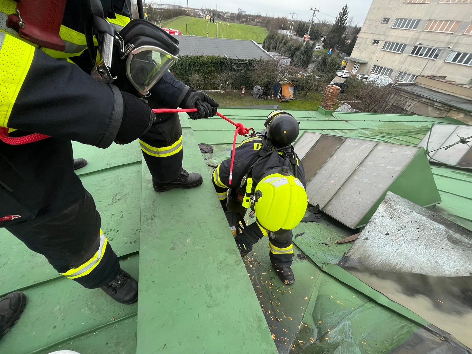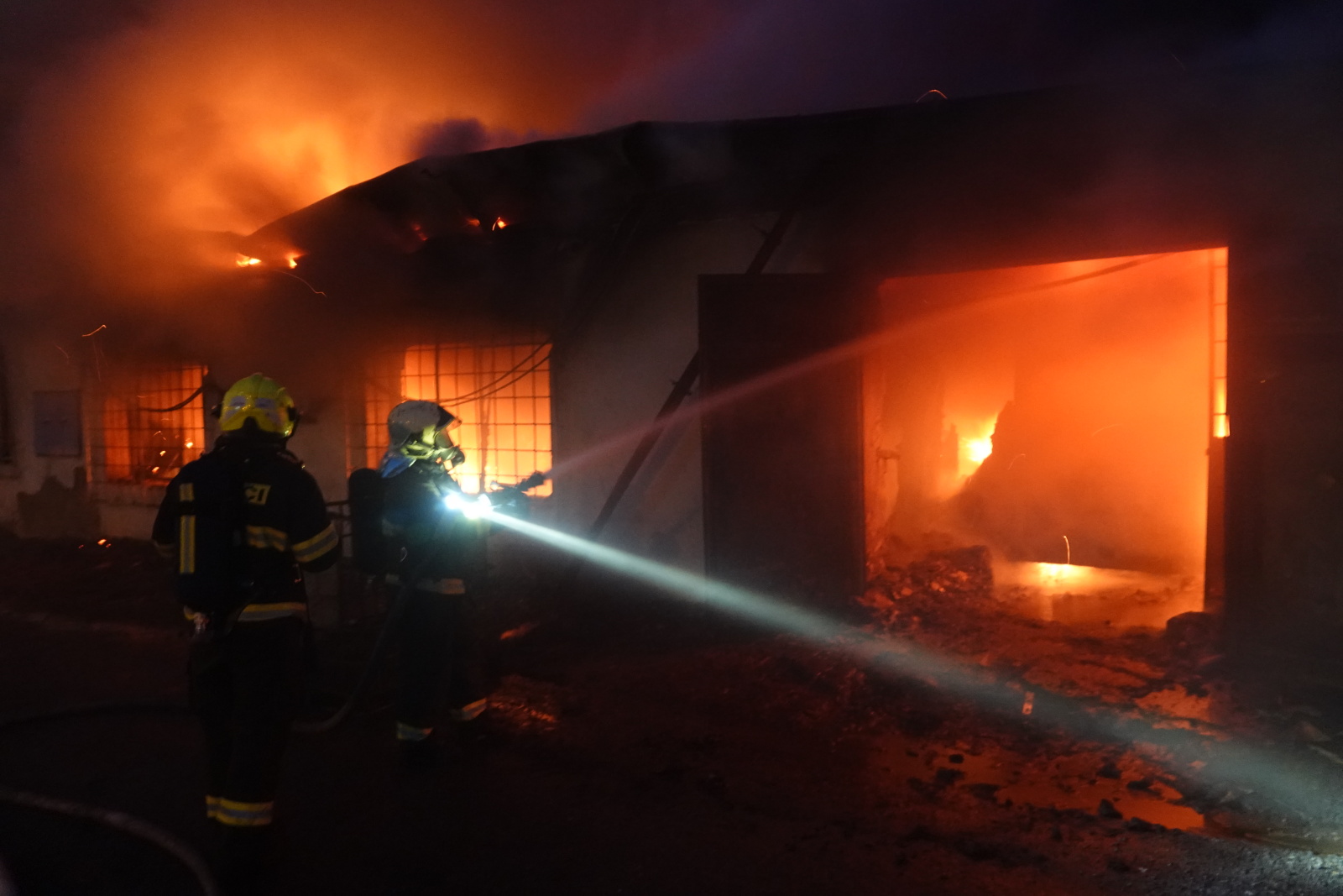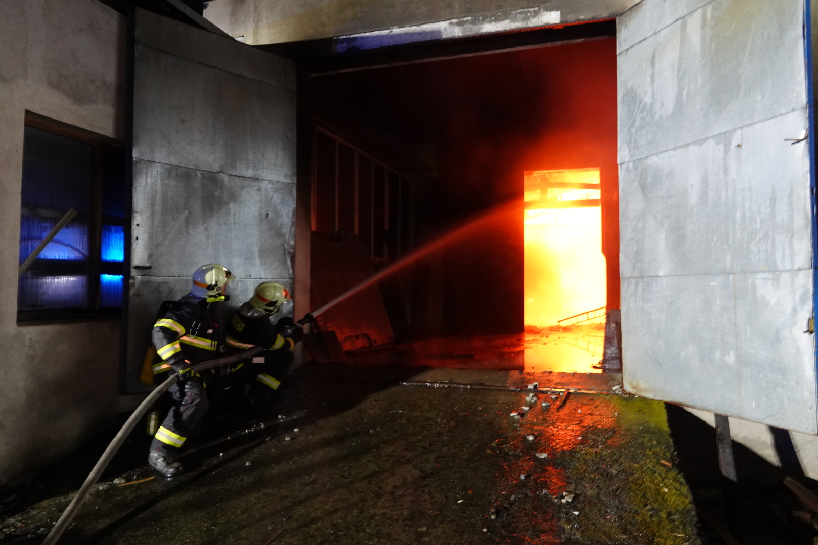 Zásah stále pokračoval na dvou úsecích s tím, že v části, kde se propadla střecha, nemohli hasiči vniknout dovnitř budovy, ale museli zasahovat z výškové techniky. Požár se šířil hlavně pod plechovou a lepenkovou střešní krytinou, takže bylo složité se k plamenům dostat. Hasiči tak na několika místech prořezali do plechového pláště otvory. Kolem páté hodiny ranní zasahovalo na místě přes sto profesionálních a dobrovolných hasičů.