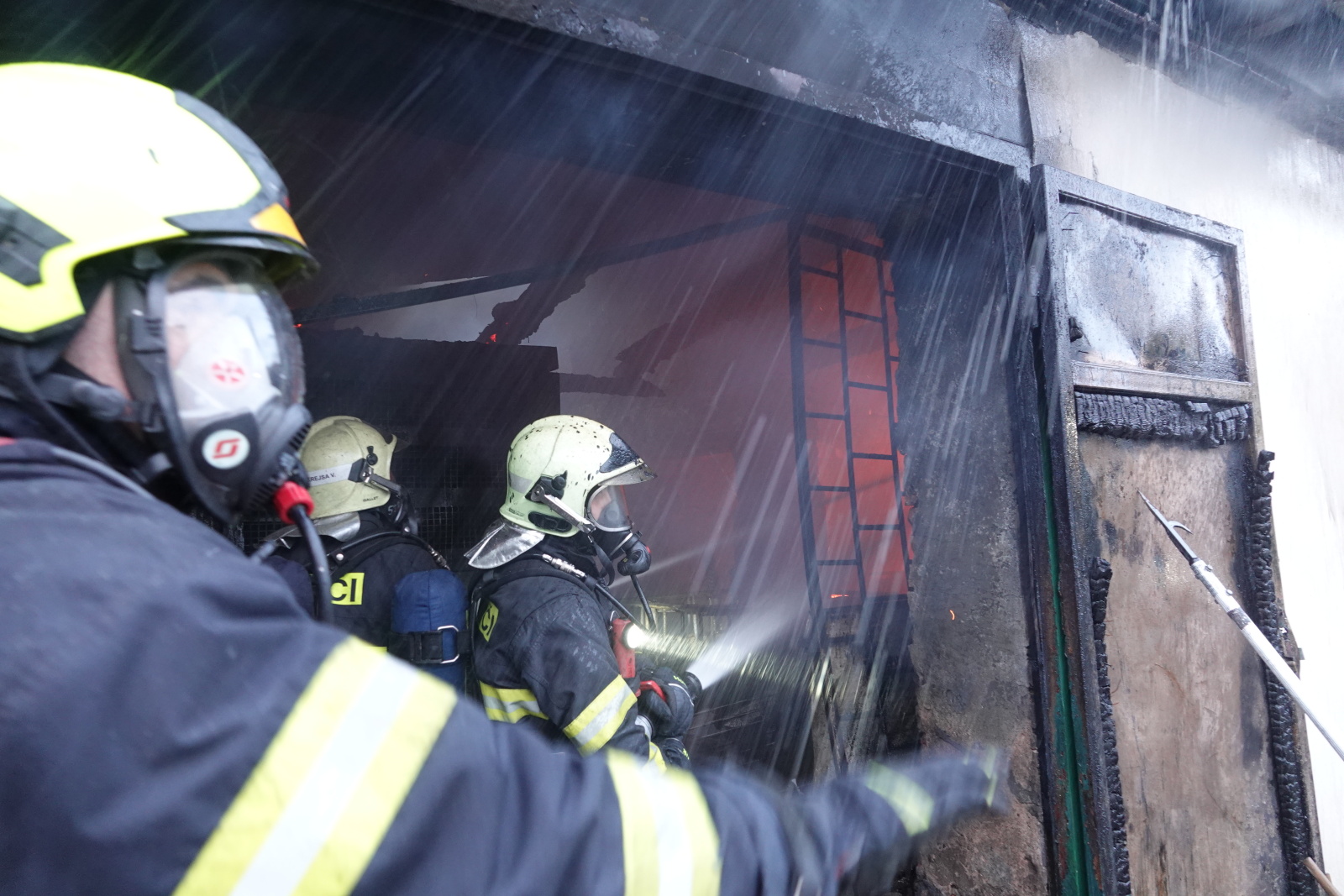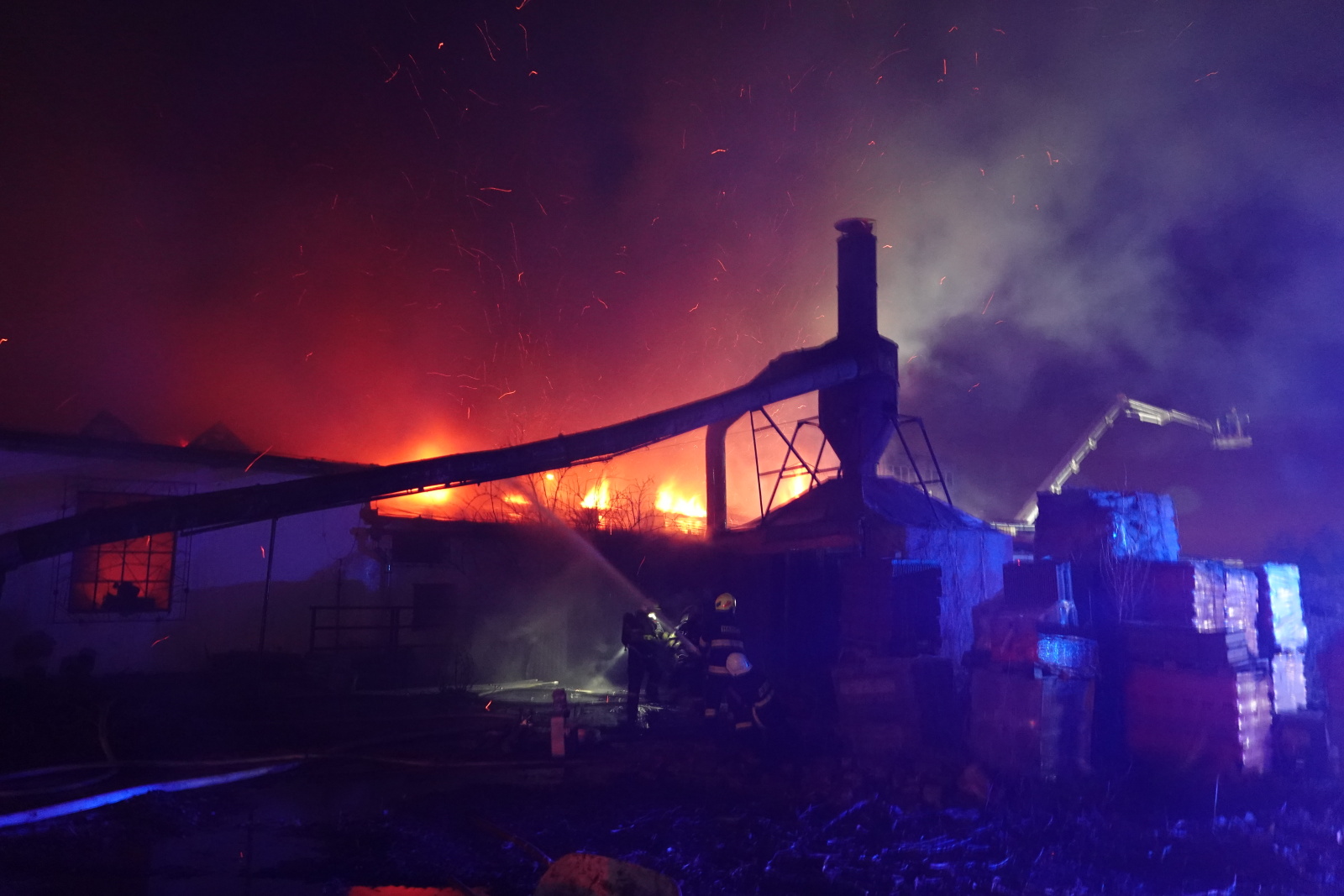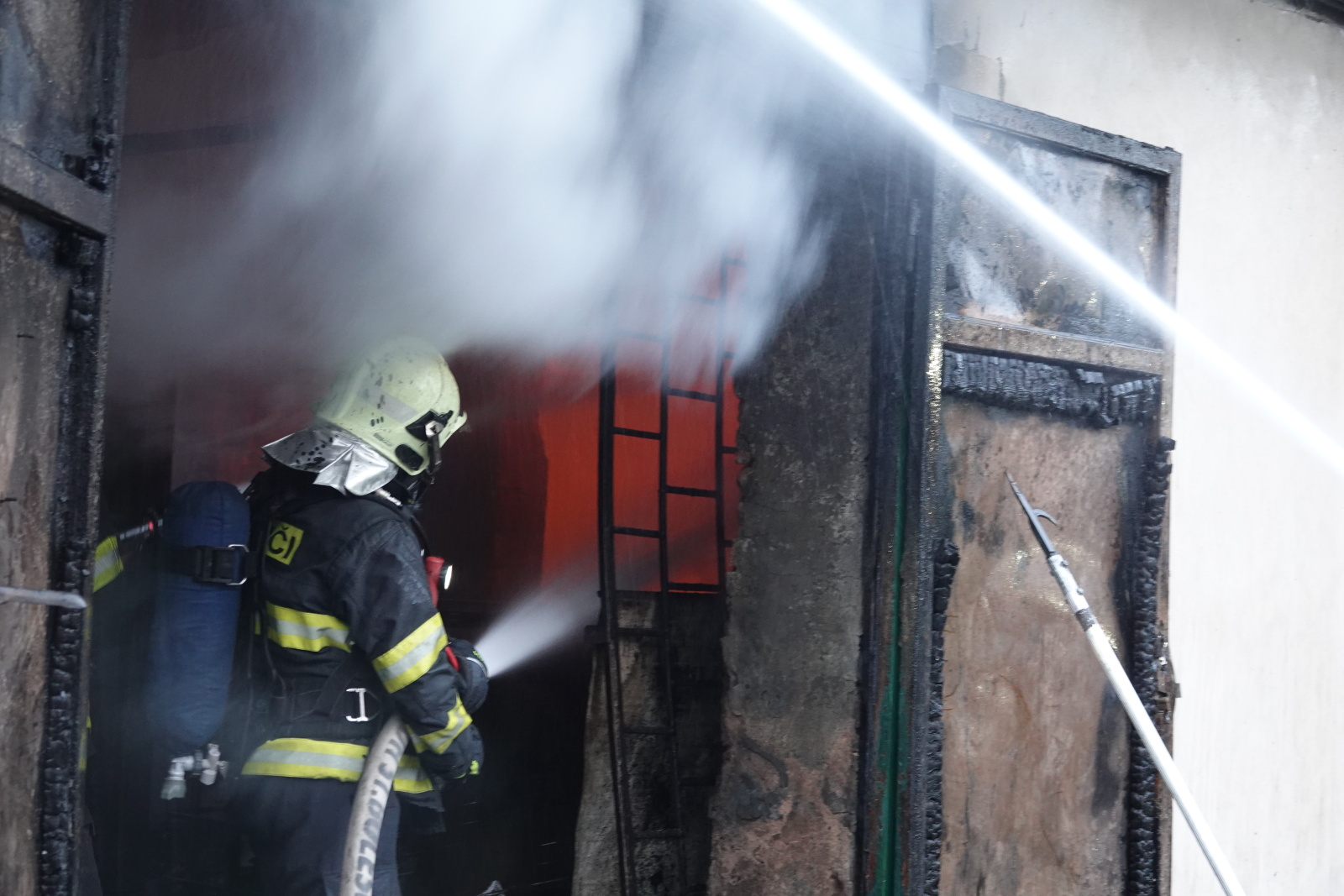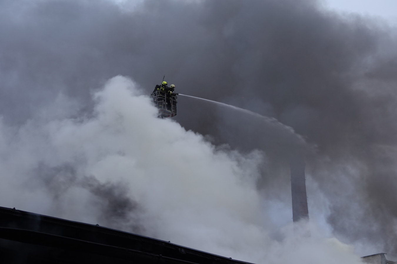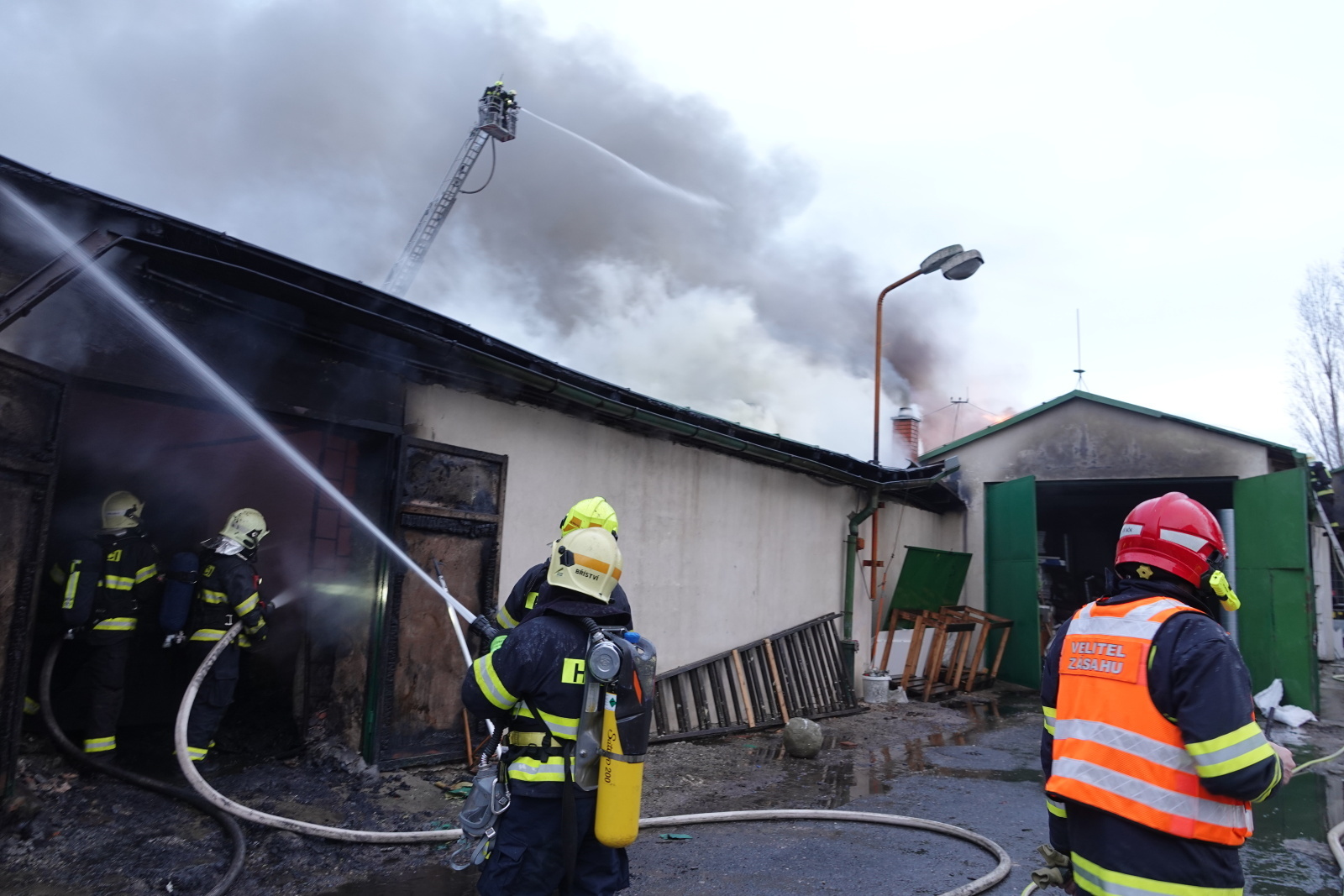 Zásah stále pokračoval na dvou úsecích s tím, že v části, kde se propadla střecha, nemohli hasiči vniknout dovnitř budovy, ale museli zasahovat z výškové techniky. Požár se šířil hlavně pod plechovou a lepenkovou střešní krytinou, takže bylo složité se k plamenům dostat. Hasiči tak na několika místech prořezali do plechového pláště otvory. Kolem páté hodiny ranní zasahovalo na místě přes sto profesionálních a dobrovolných hasičů.