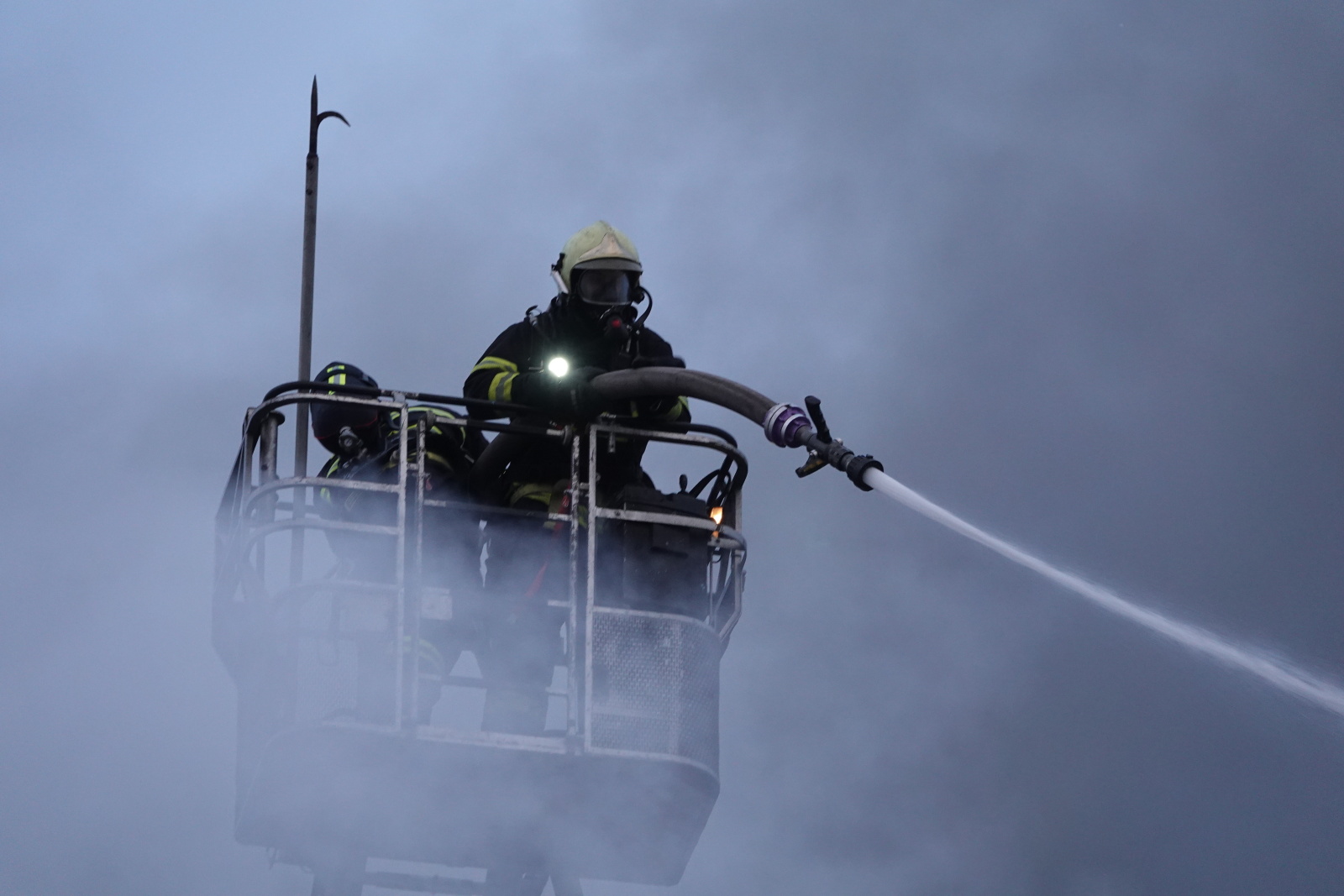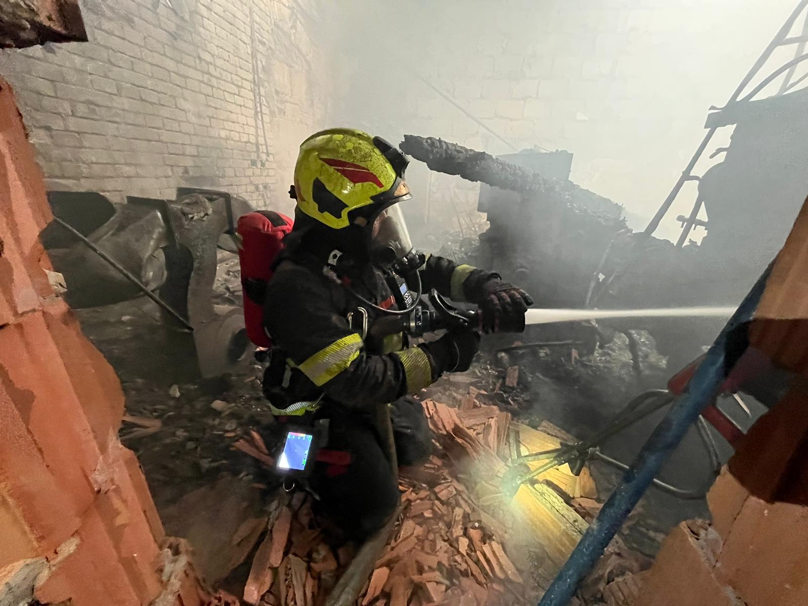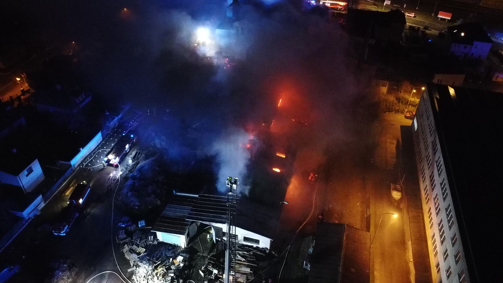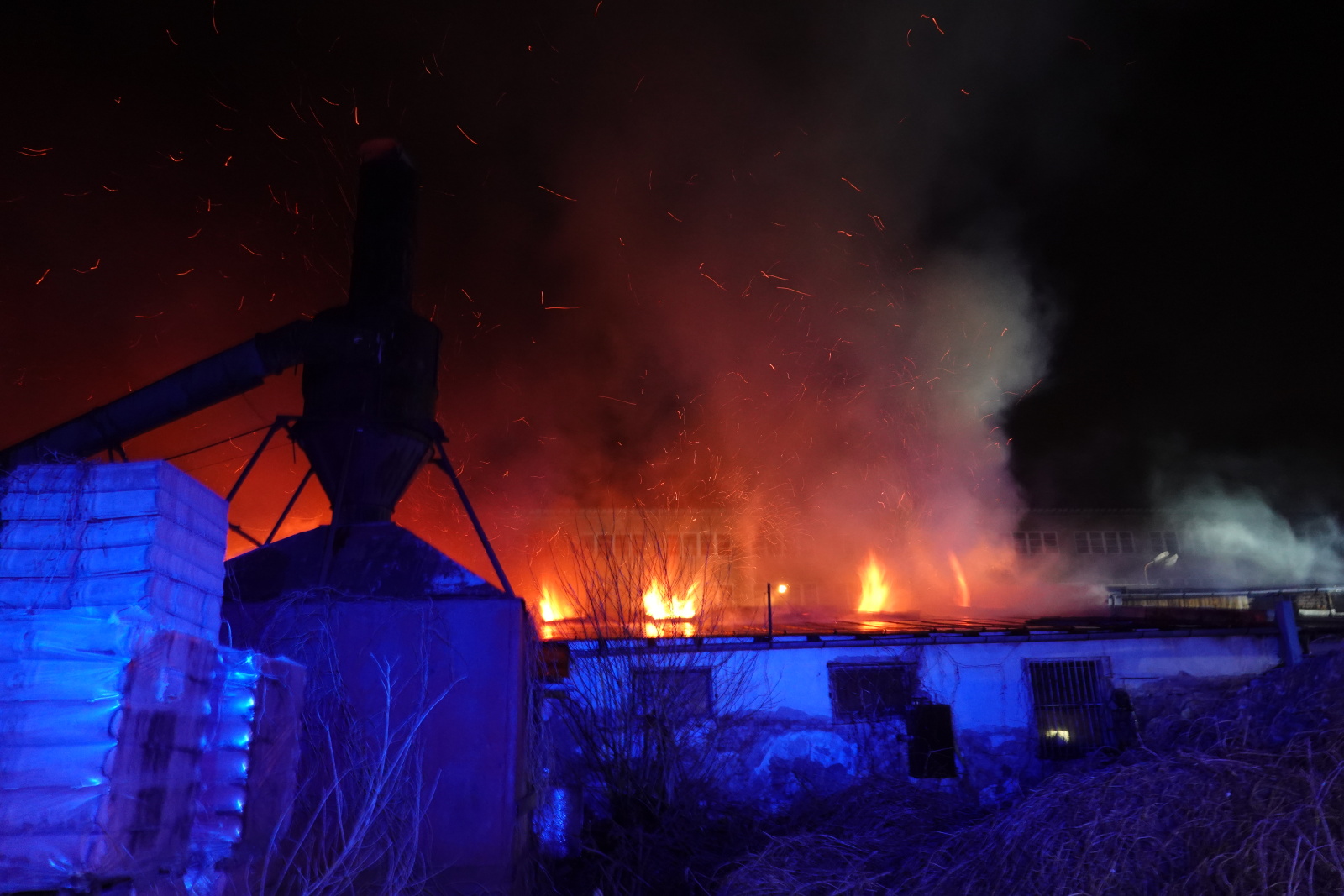 Zásah stále pokračoval na dvou úsecích s tím, že v části, kde se propadla střecha, nemohli hasiči vniknout dovnitř budovy, ale museli zasahovat z výškové techniky. Požár se šířil hlavně pod plechovou a lepenkovou střešní krytinou, takže bylo složité se k plamenům dostat. Hasiči tak na několika místech prořezali do plechového pláště otvory. Kolem páté hodiny ranní zasahovalo na místě přes sto profesionálních a dobrovolných hasičů.