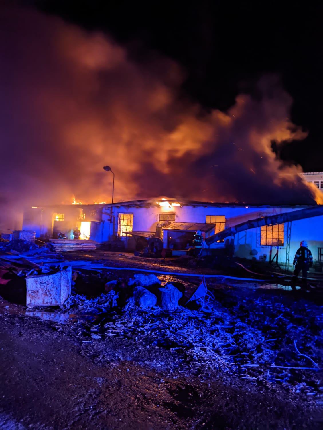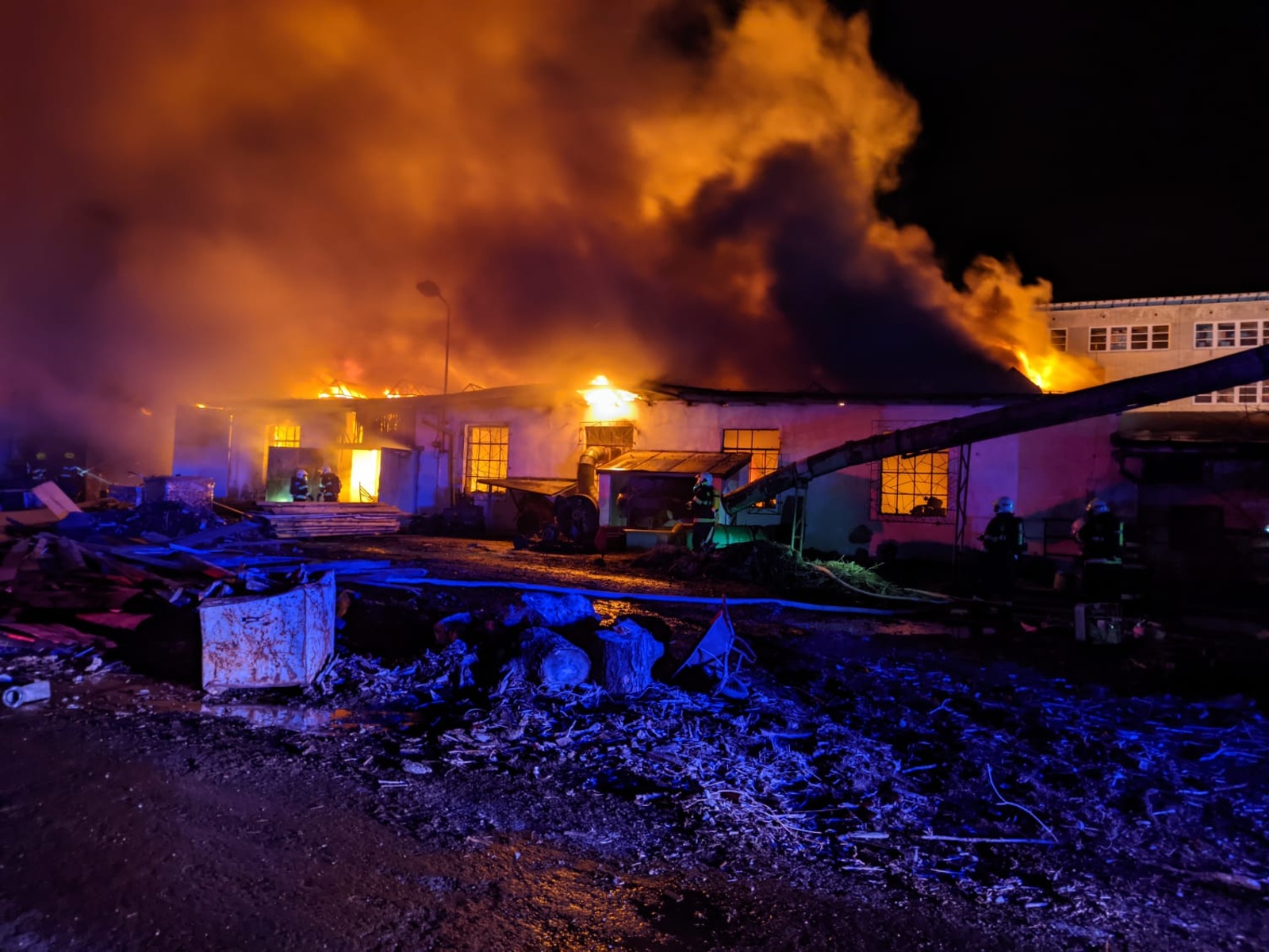 Po příjezdu prvních hasičů a rychlém průzkumu bylo upřesněno, že požár zasáhl především hlavní výrobní halu o půdorysu 20x50 metrů, která byla zasažena v plném rozsahu. Kromě vlastního hasebního zásahu bylo nutné chránit okolní objekty, což znamenalo zajištění dalších sil a prostředků pro dodávku většího množství vody. Proto velitel ve 2.33 hodin rozhodl o vyhlášení třetího poplachového stupně a o vyslání spojového vozu pro efektivnější řízení náročného zásahu.
