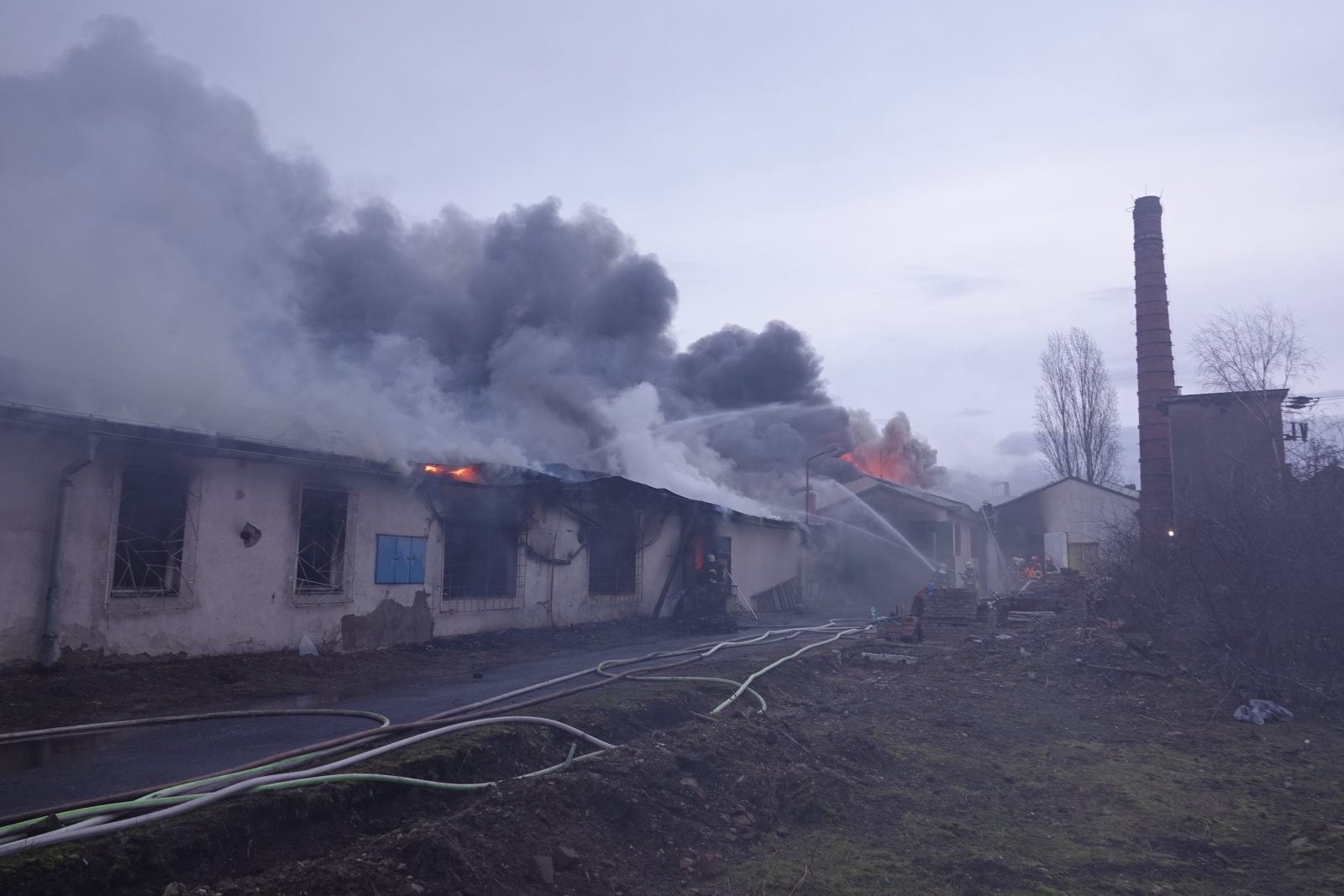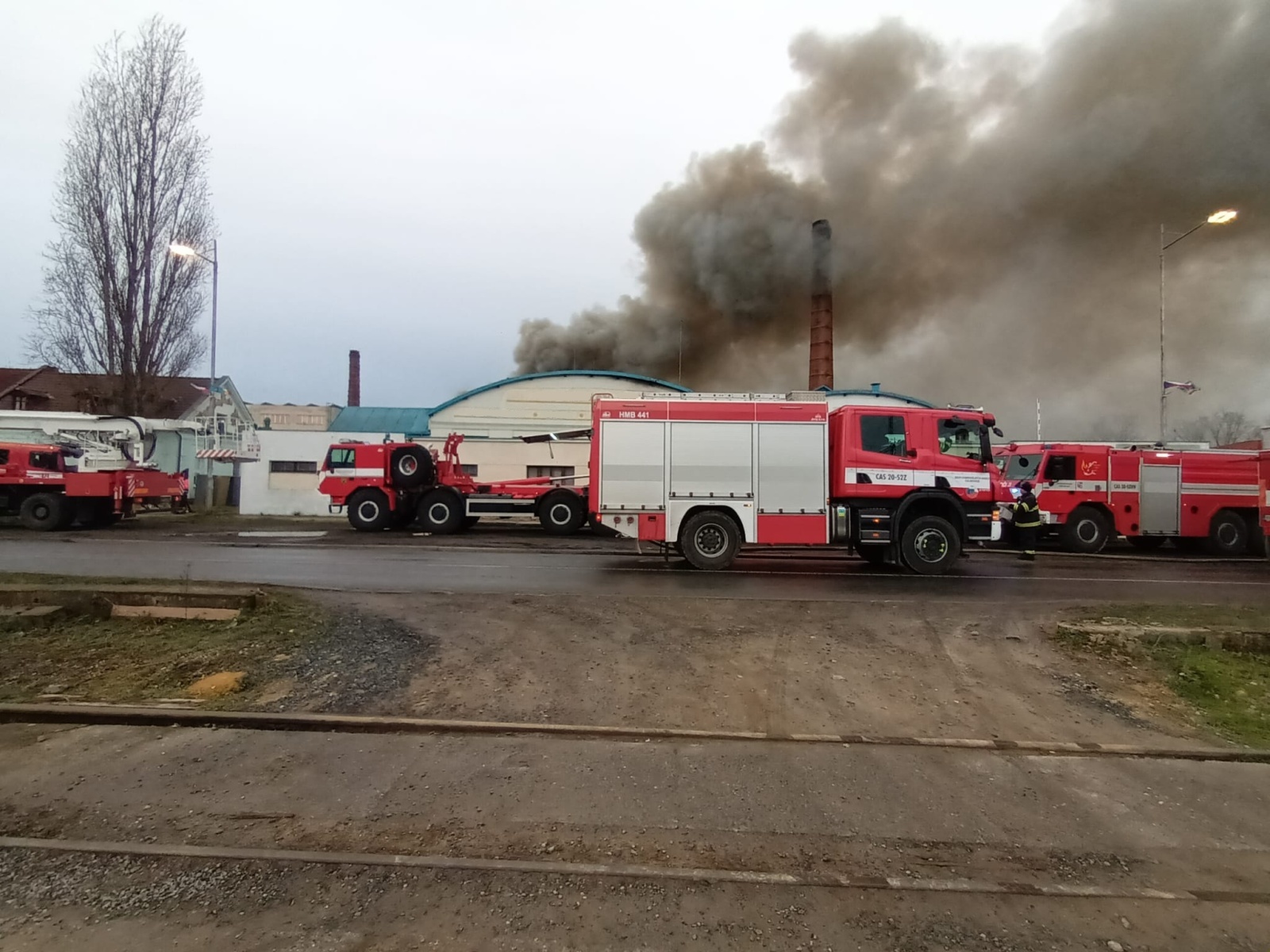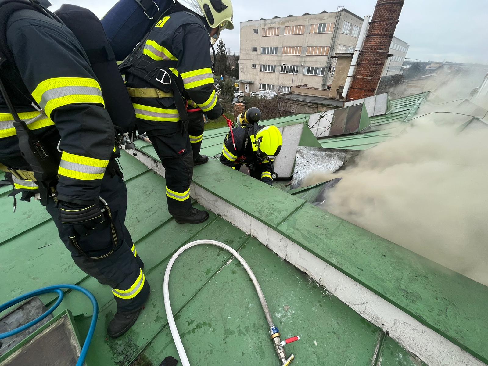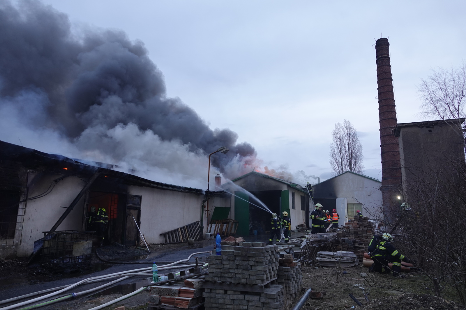 Podle oznamovatele se z areálu, kde v té době nebyli žádní zaměstnanci, valil hustý černý dým, ale plameny vidět nebyly. Vzápětí se požár objevil poté, když se na jednom z objektů propadla střecha. Operační středisko okamžitě zvýšilo poplachový stupeň a na místo vyslalo další jednotky.