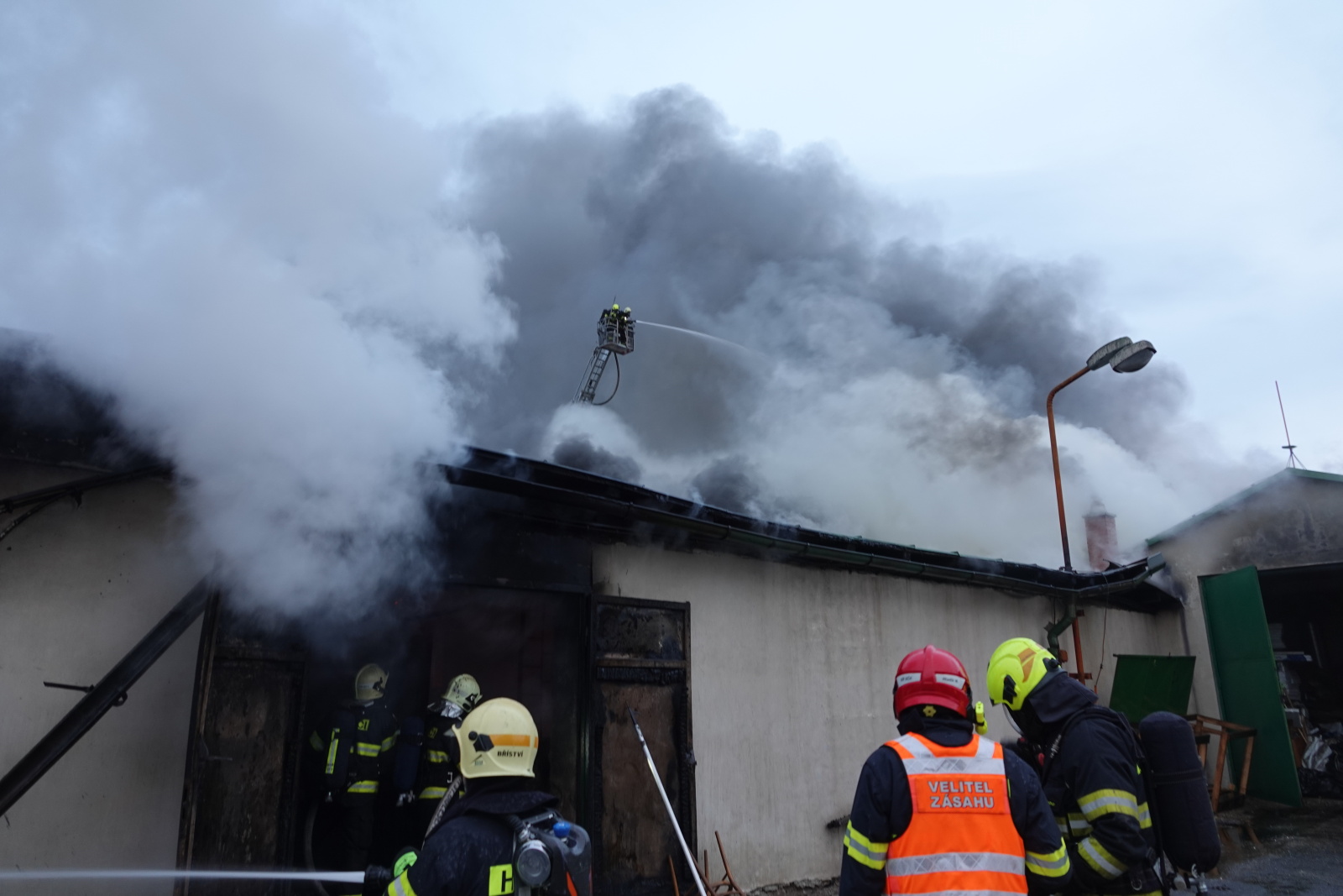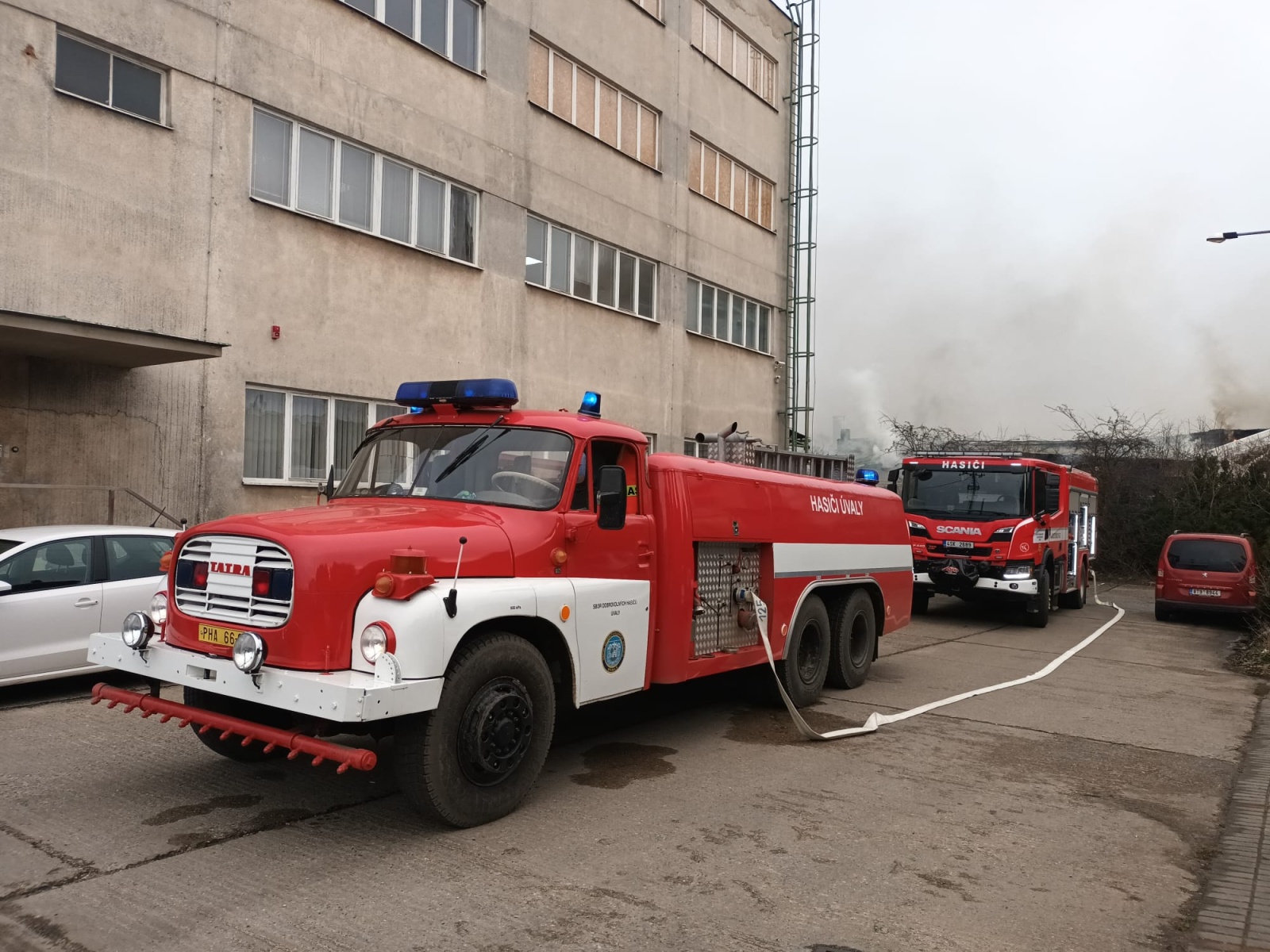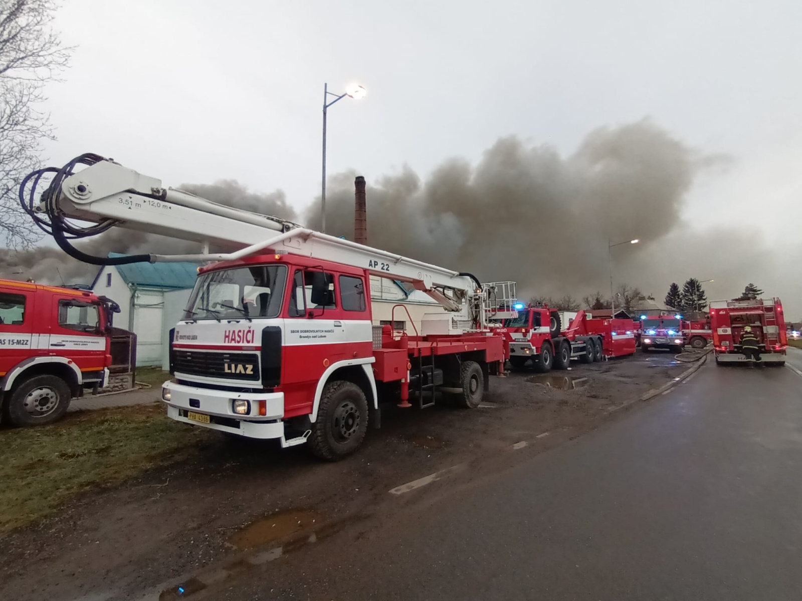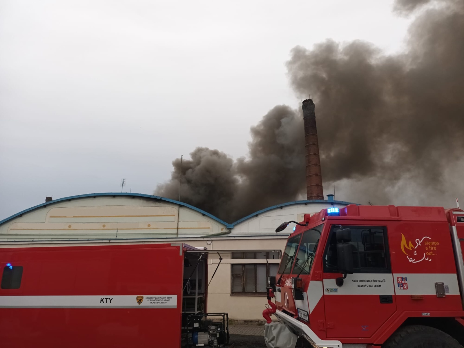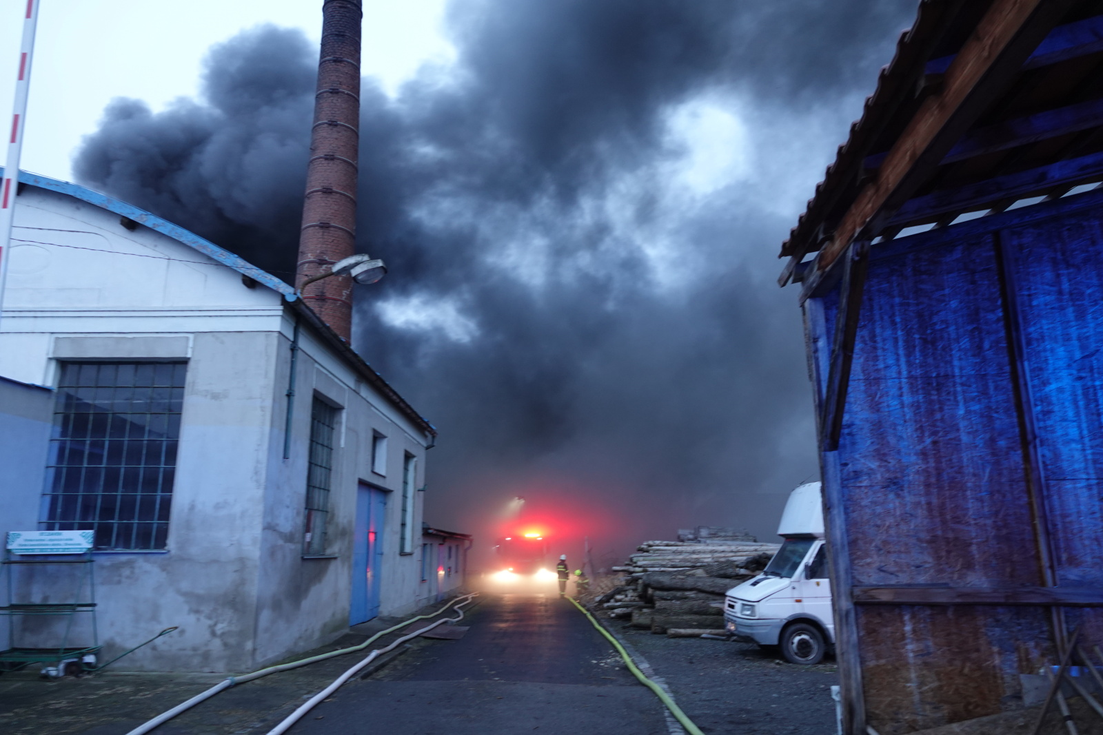 Podle oznamovatele se z areálu, kde v té době nebyli žádní zaměstnanci, valil hustý černý dým, ale plameny vidět nebyly. Vzápětí se požár objevil poté, když se na jednom z objektů propadla střecha. Operační středisko okamžitě zvýšilo poplachový stupeň a na místo vyslalo další jednotky.