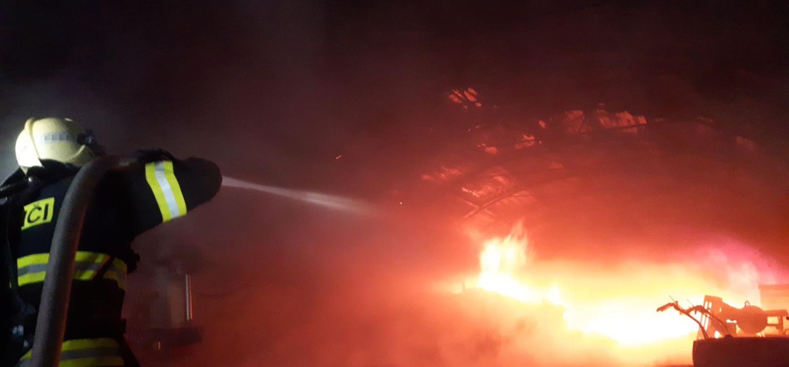 Vzhledem k tomu, že oznamovatel uvedl, že požárem je zasažena celá hala, vyslal operační důstojník na místo profesionální hasiče z Českého Brodu, Nymburka a Staré Boleslavi spolu s dobrovolnými hasiči obcí Čelákovice a Lysá nad Labem. První jednotky, které dojely na místo, nasadily dva vodní proudy především k ochraně okolních objektů. V době zahájení zásahu byly požárem zasaženy dvě venkovní haly o půdorysu 50x9 metrů a 35x9 metrů.