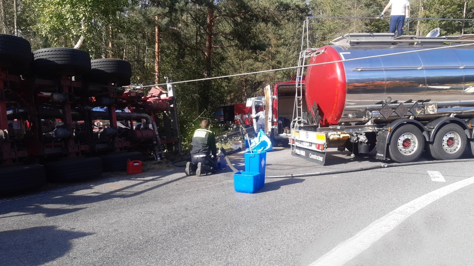 Zpočátku nedocházelo k žádnému úniku přepravované látky, ale následně začala kyselina drobně unikat přes vrchní poklop. Cisterna ovšem ležela na straně, kde jsou přečerpávací hrdla, takže nebylo možné ji bez nadzvednutí odčerpat. Na místo proto byla povolána specializovaná vyprošťovací firma a také firma Dekonta, která se specializuje na likvidaci úniku nebezpečných látek. Operační středisko na místo povolalo i příslušníky z Chemické laboratoře z Kamenice, kteří odebrali a vyhodnotili vzorky přepravované kyseliny.