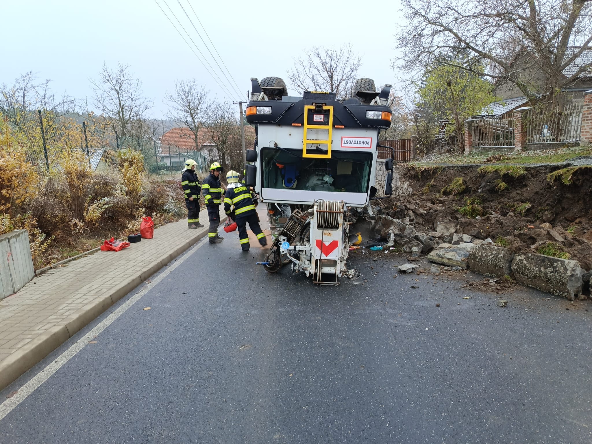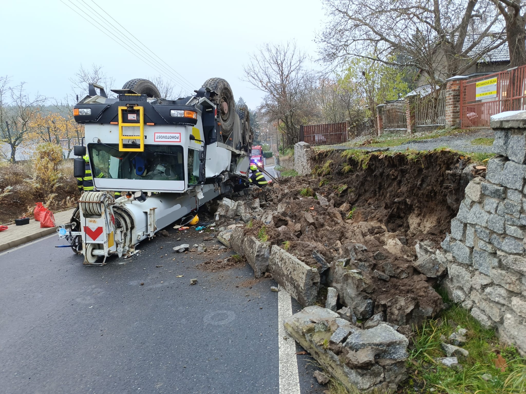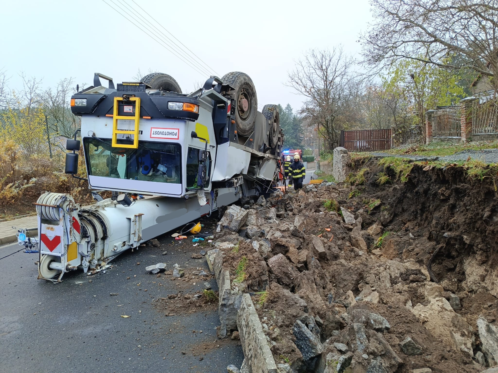 Hodinu po poledni byla profesionální jednotka z hasičské stanice Říčany vyslána k nedaleké havárii autojeřábu, pod kterým se utrhla krajnice a skončil převrácený koly vzhůru. Pětatřicetitunový kolos současně zboural část kamenné opěrné zdi podél silnice.
