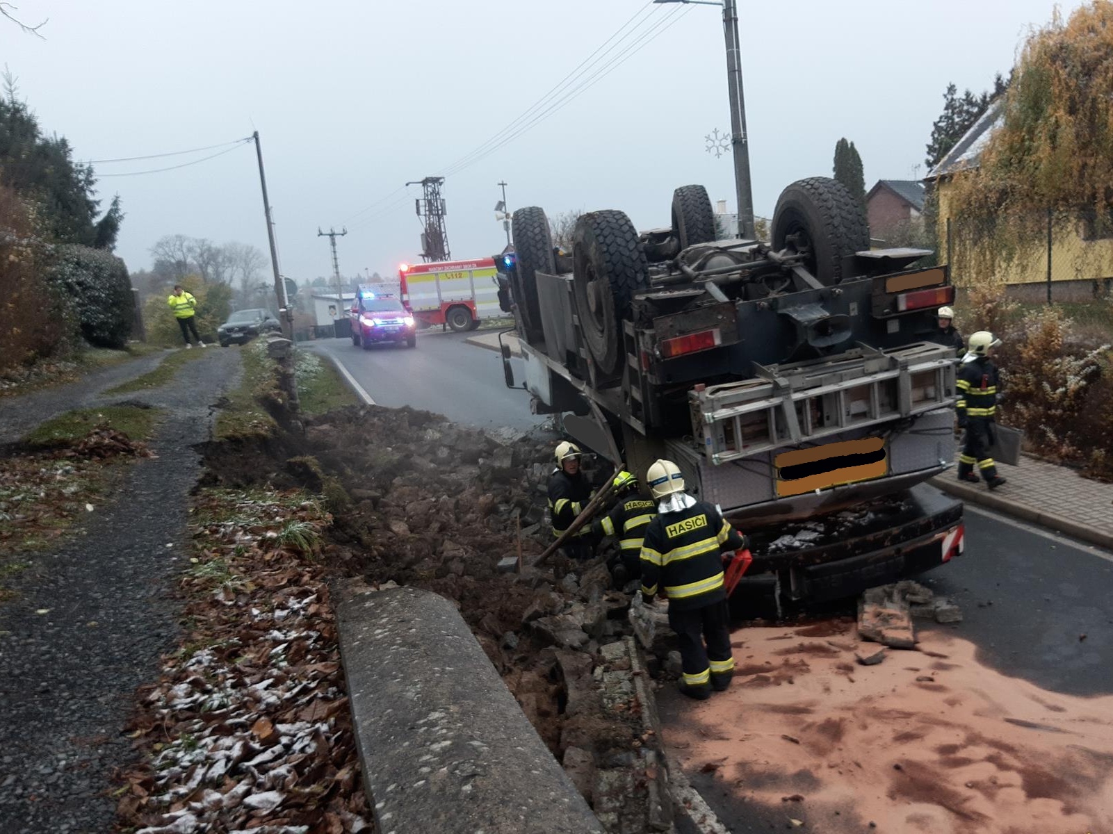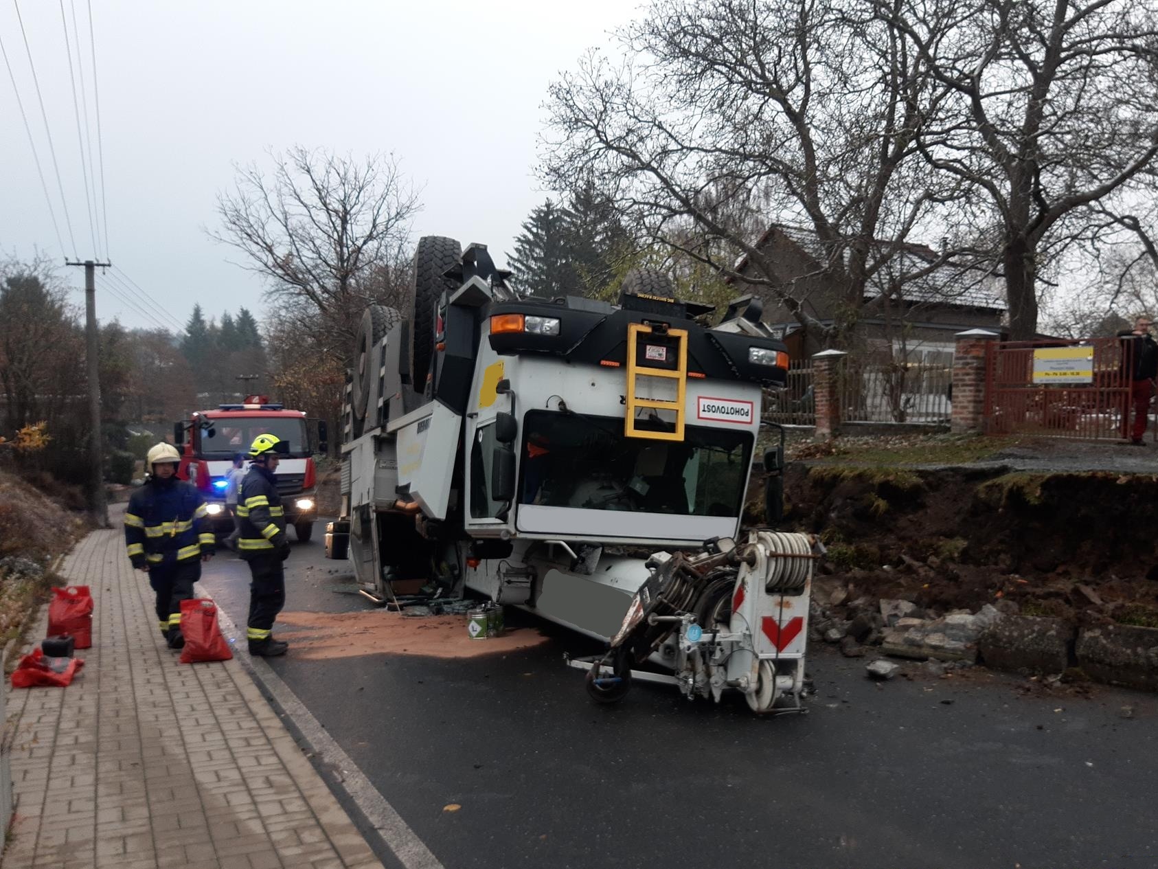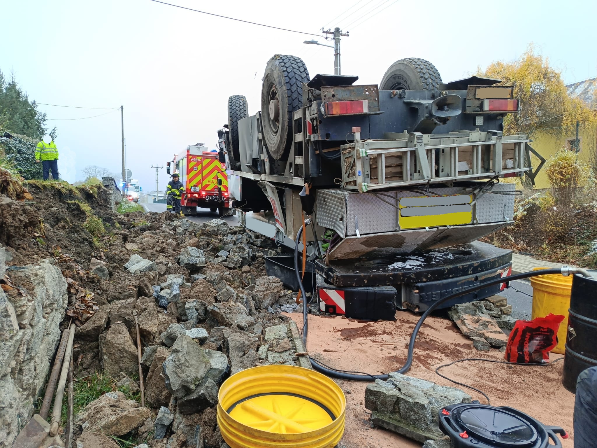 Hodinu po poledni byla profesionální jednotka z hasičské stanice Říčany vyslána k nedaleké havárii autojeřábu, pod kterým se utrhla krajnice a skončil převrácený koly vzhůru. Pětatřicetitunový kolos současně zboural část kamenné opěrné zdi podél silnice.
