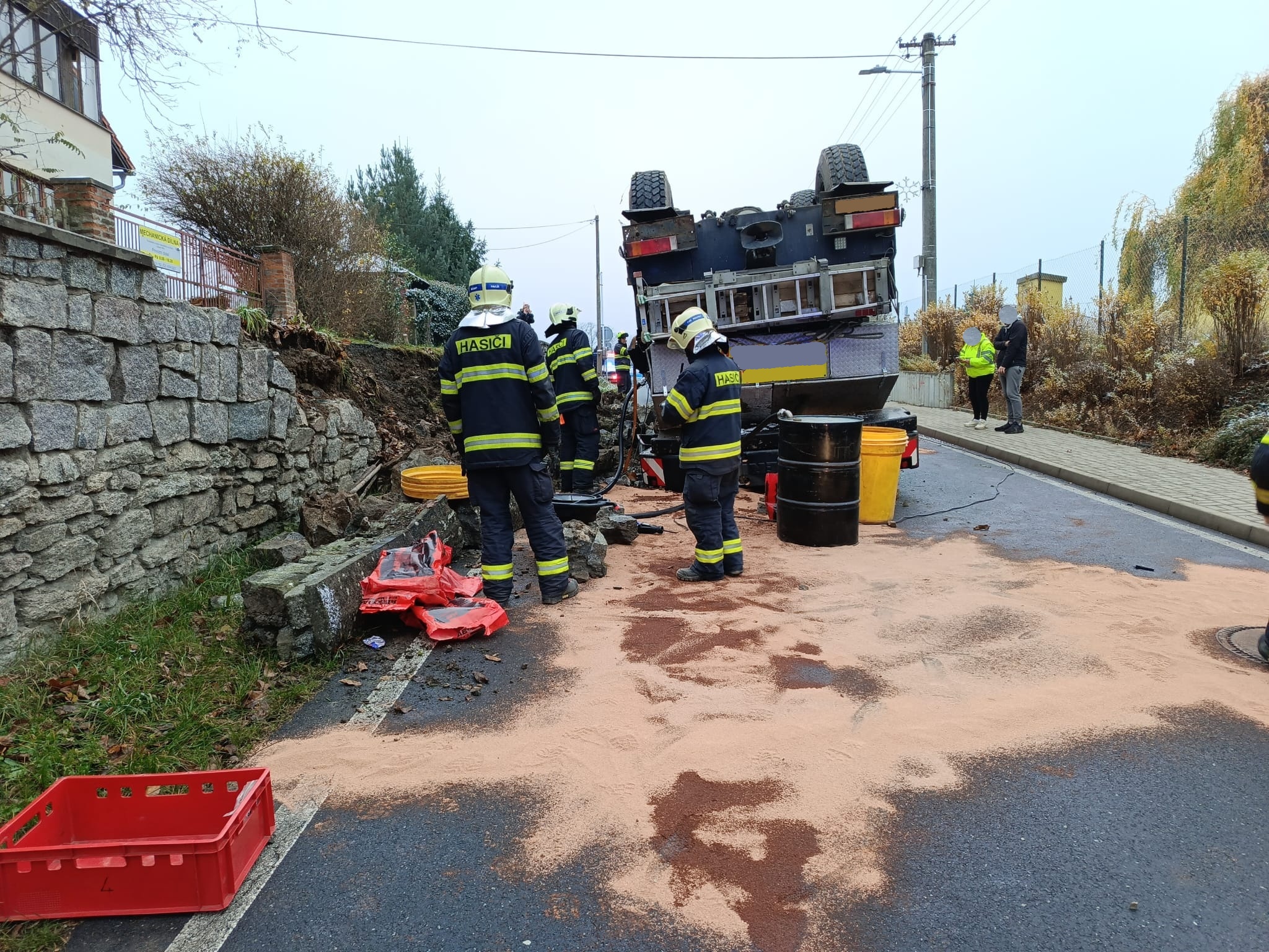 Řidič vyvázl bez zranění. Po nezbytném zajištění vozidla proti vzniku požáru se hasiči zaměřili na zachycení masivního úniku hydraulického oleje a také nafty z poškozené nádrže.