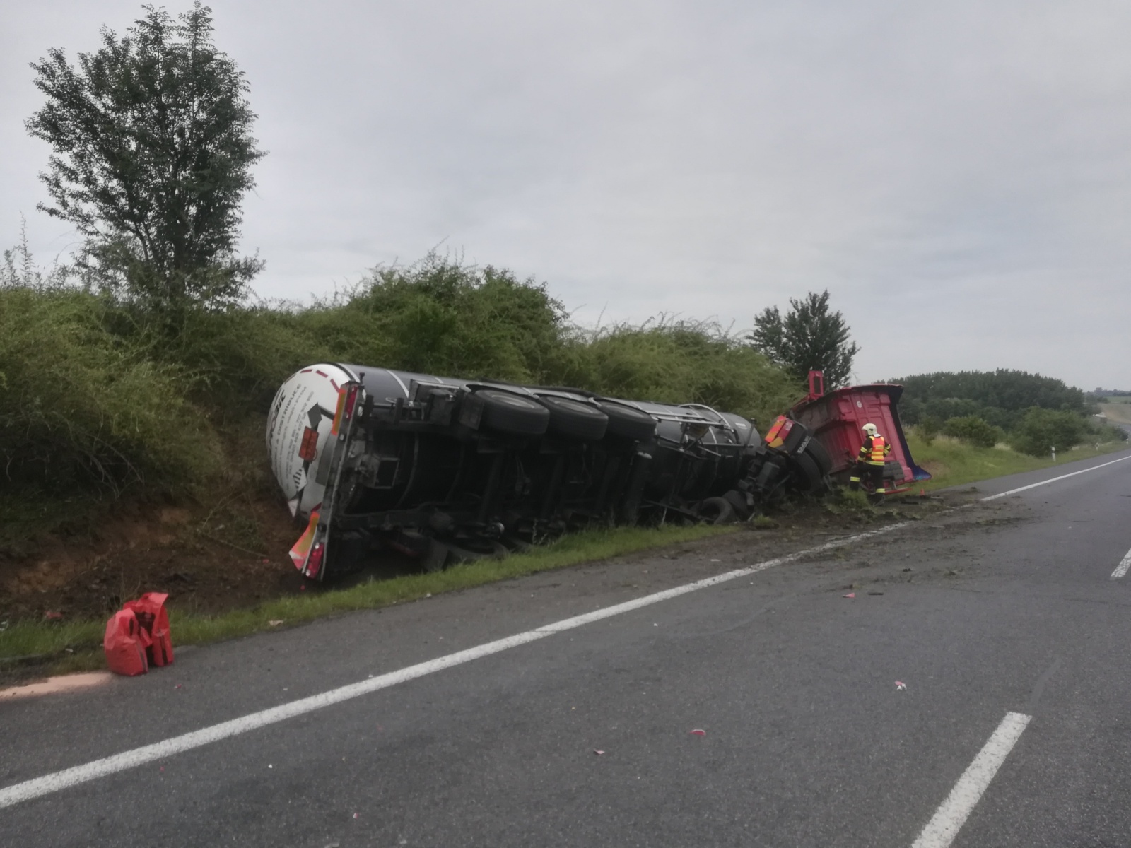 Cisterna převážející tekutý asfalt skončila po střetu v příkopu na levém boku a v kabině zůstal zaklíněný