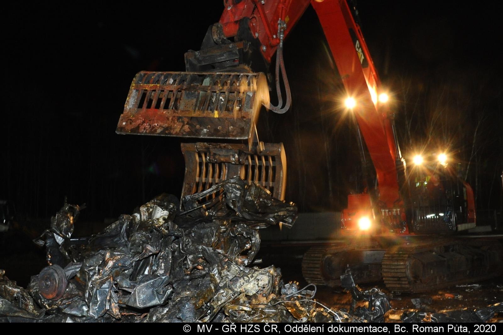 Následně velitel zásahu rozhodl o napuštění jednoho z velkých kontejnerů vodou se smáčedlem, do kterého speciální technika vždy ponořila jedno vozidlo, které následně za pomoci dalšího kontejneru odvážela na volné prostranství.
