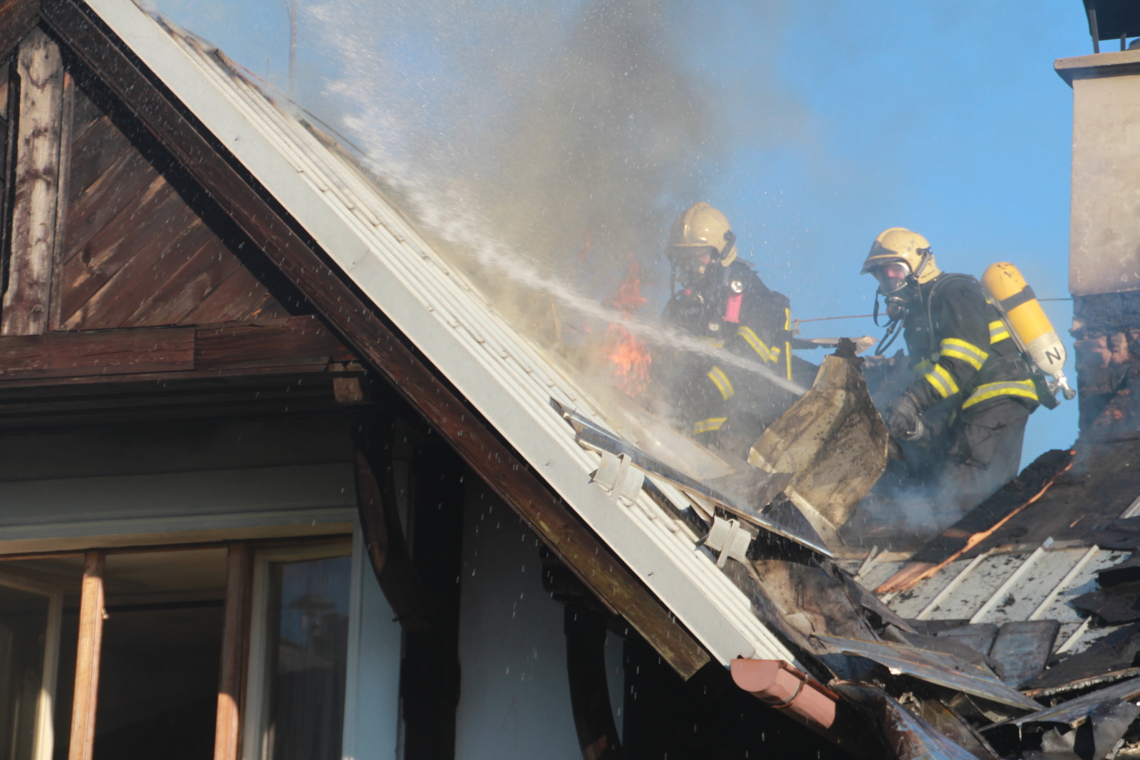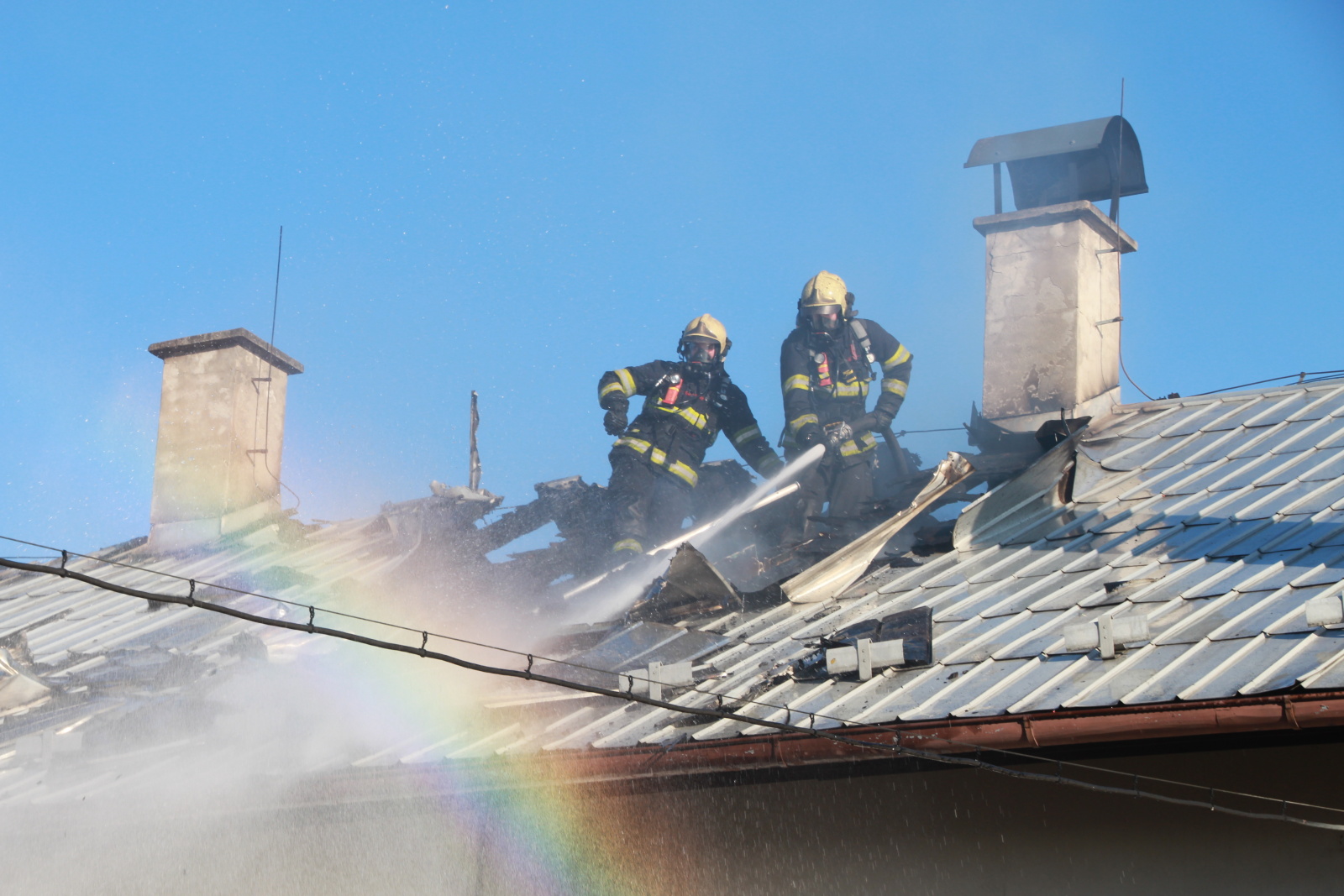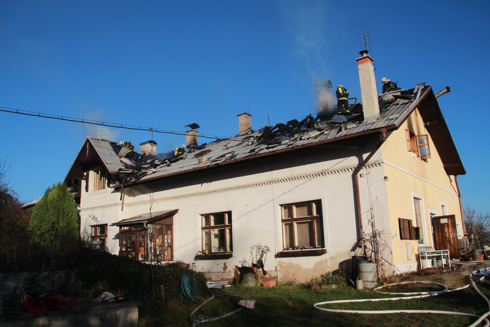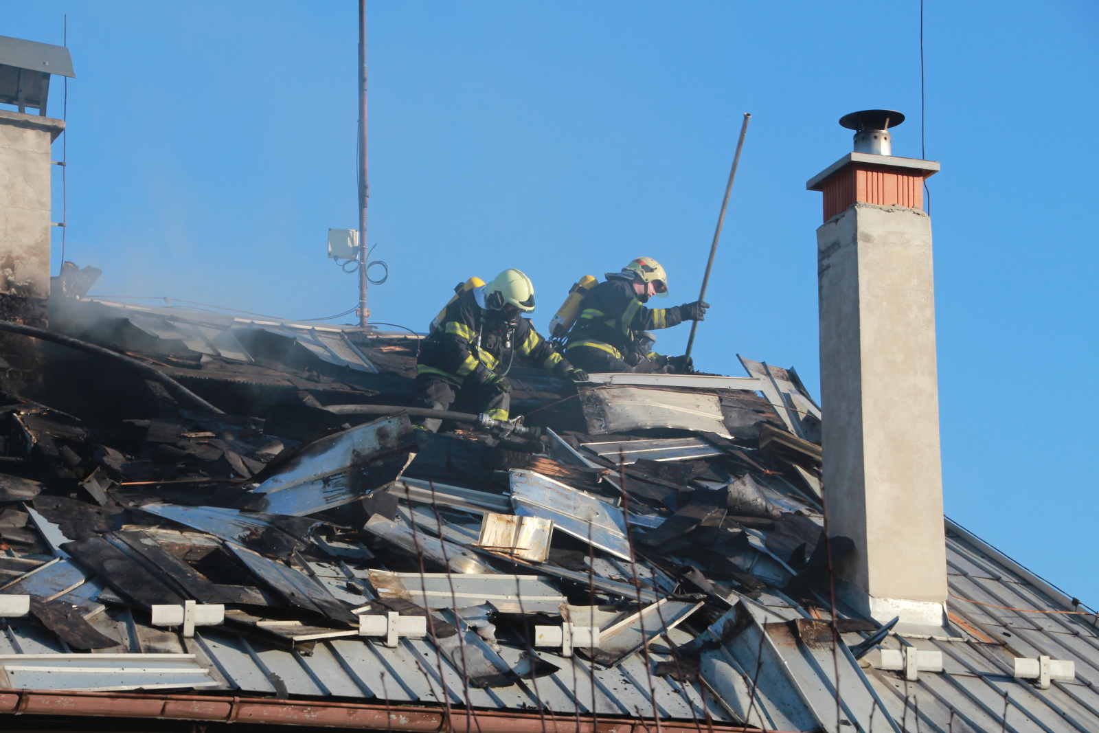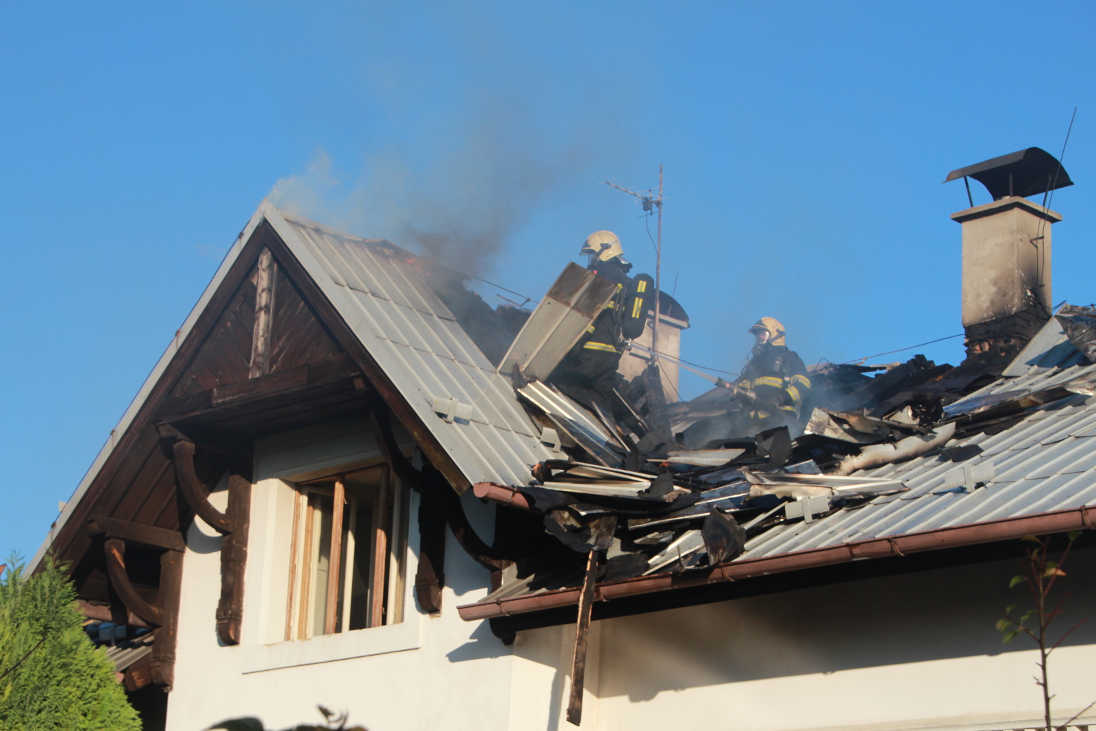 ventilace. Hasiči z domu vynesli jednu propanbutanovou láhev. Vzhledem k nemožnosti nasadit výškovou techniku z důvodu špatné příjezdové cesty využili hasiči nastavovací žebříky. Po lokalizaci na hasiče čekal úkol nejtěžší, a to dohašování skrytých ohnisek a postupné rozebrání plechové krytiny střechy.