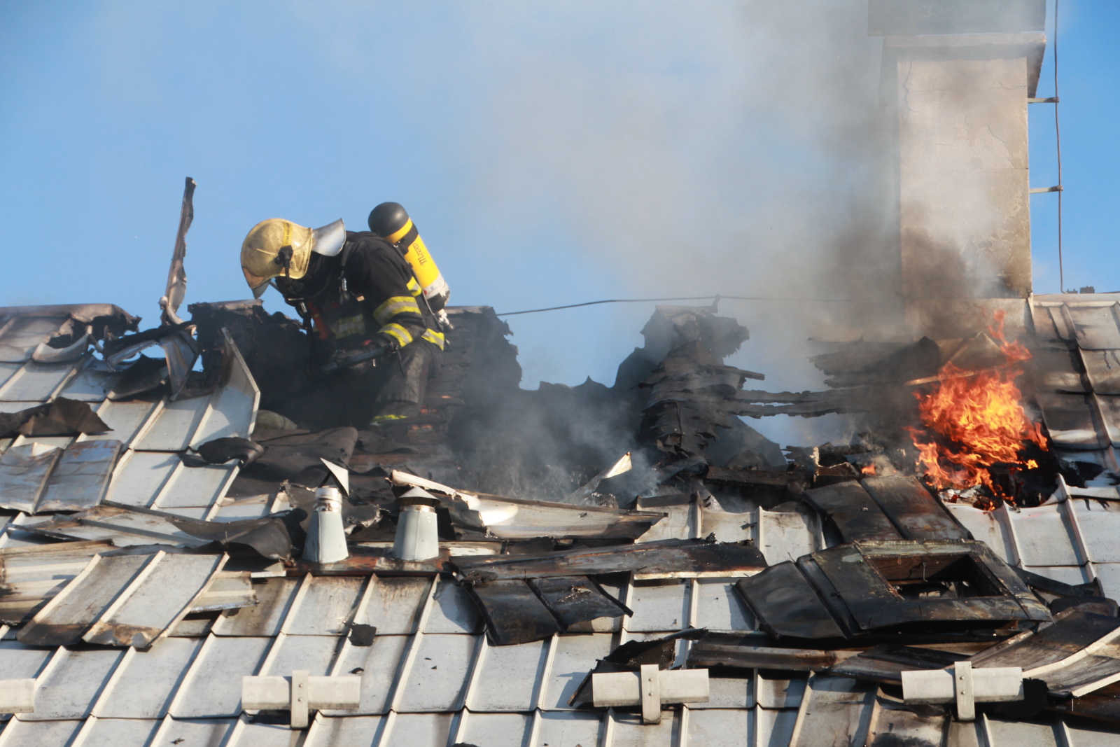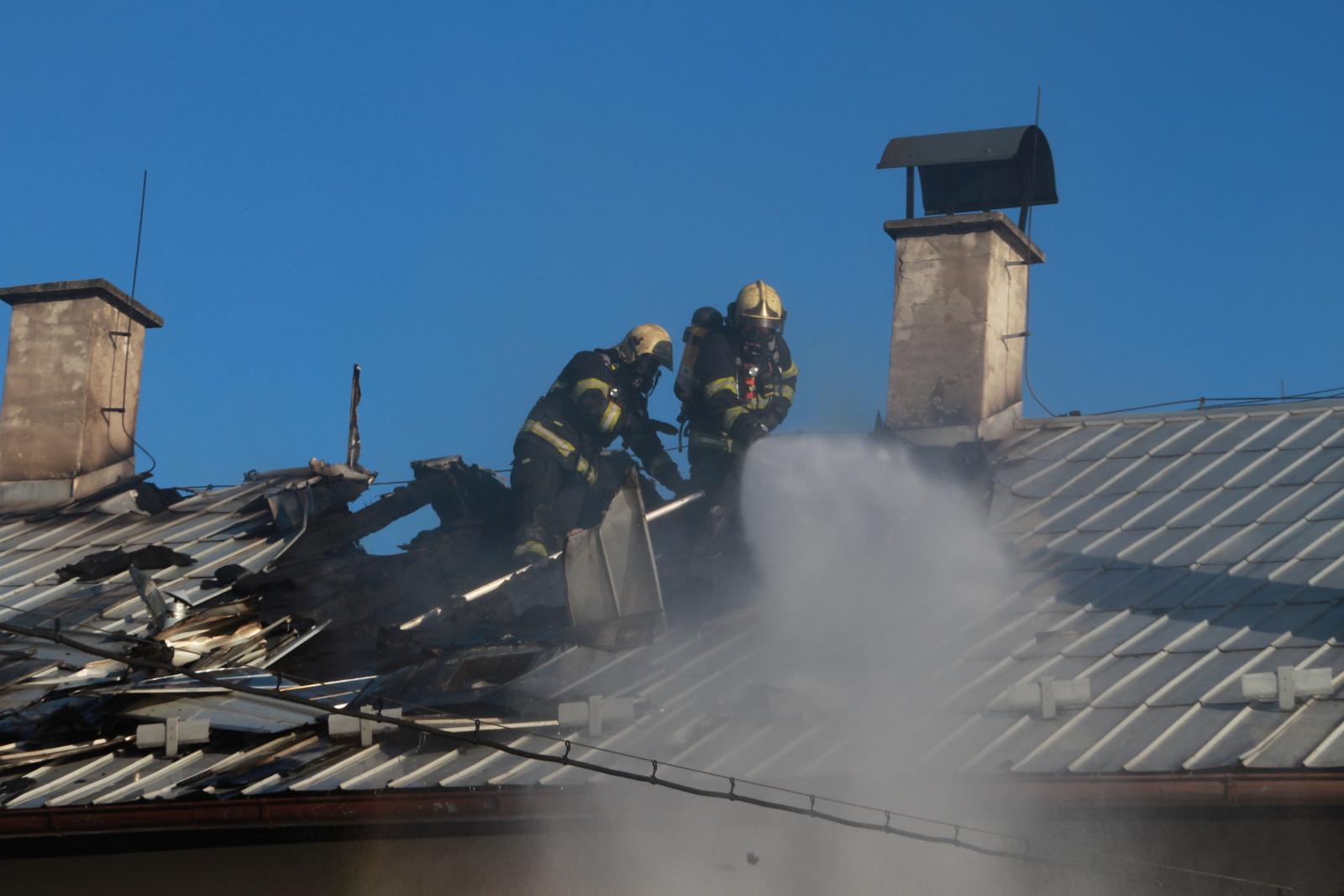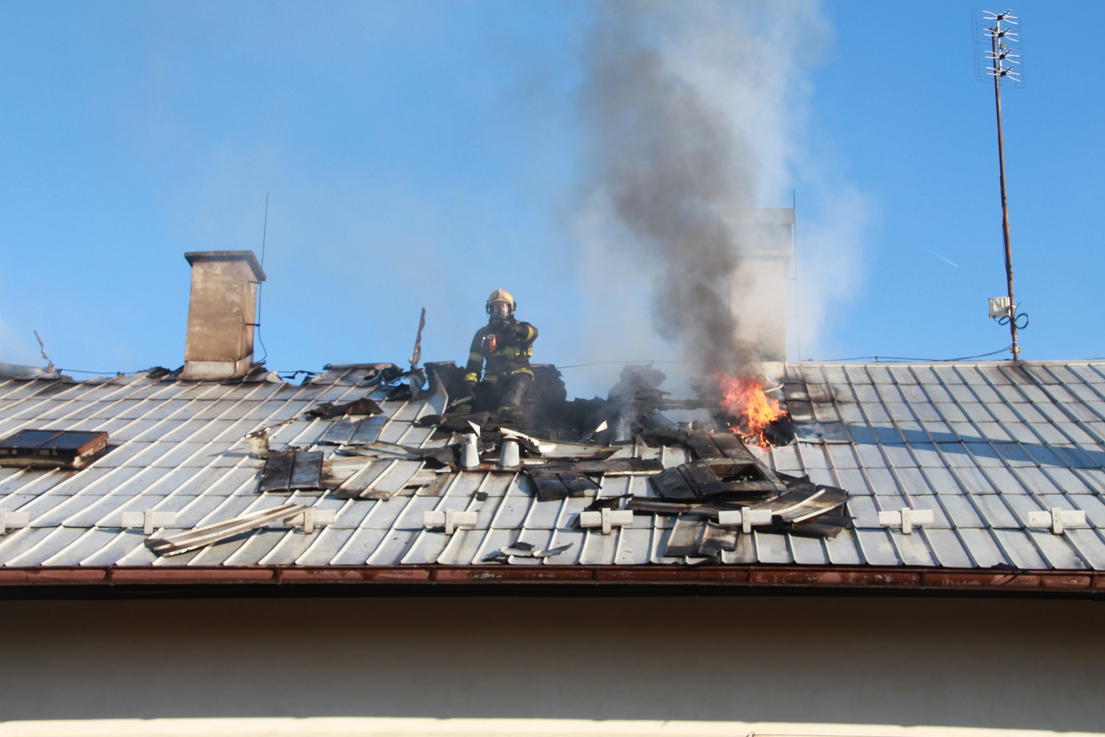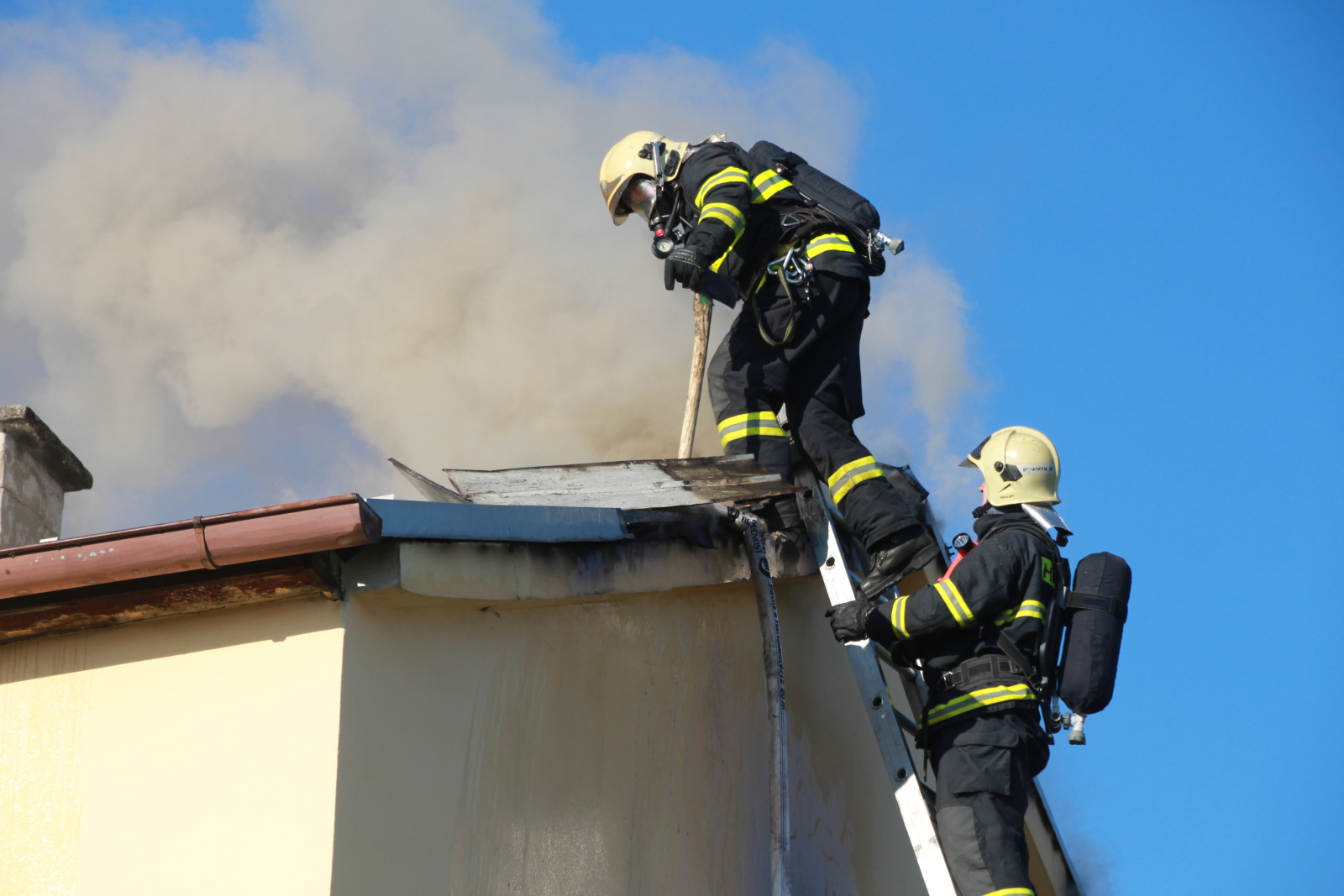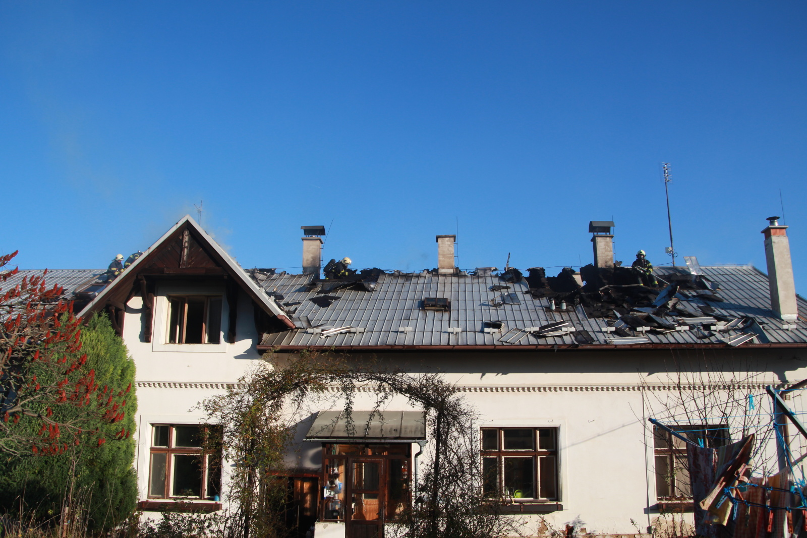 ventilace. Hasiči z domu vynesli jednu propanbutanovou láhev. Vzhledem k nemožnosti nasadit výškovou techniku z důvodu špatné příjezdové cesty využili hasiči nastavovací žebříky. Po lokalizaci na hasiče čekal úkol nejtěžší, a to dohašování skrytých ohnisek a postupné rozebrání plechové krytiny střechy.