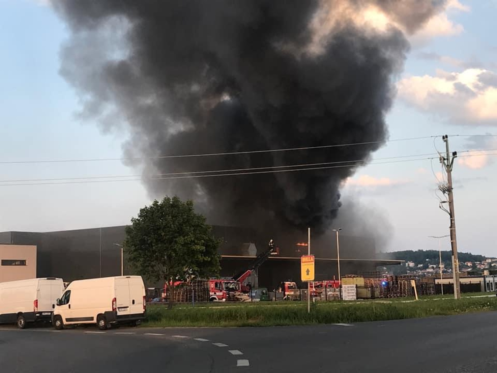 Po necelé hodině byl vyhlášen třetí stupeň požárního poplachu. Pro zajištění dostatku hasební vody bylo na nedalekém rybníku Na Sklenářce zřízeno čerpací stanoviště, odkud byla voda dovážena kyvadlově cisternami. Ke zvýšení efektivity zásahu nasadili hasiči do konstrukce stavby hasicí hřeby, zároveň začali s vyskladňováním uloženého materiálu z prostoru o přibližném rozměru 16x10x8 metrů.