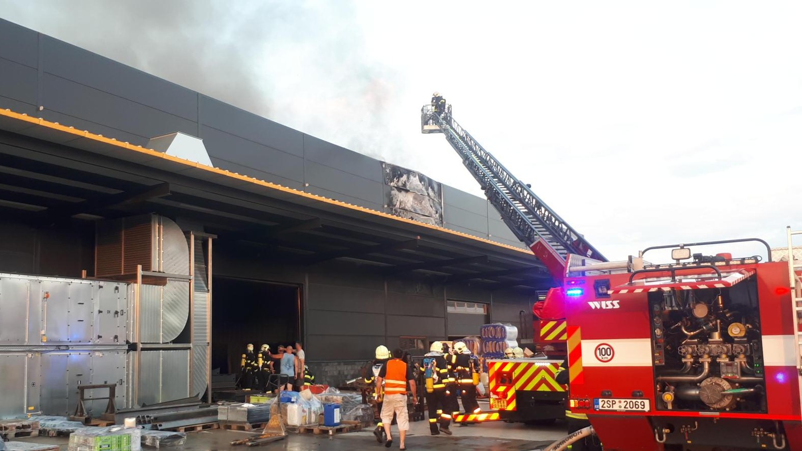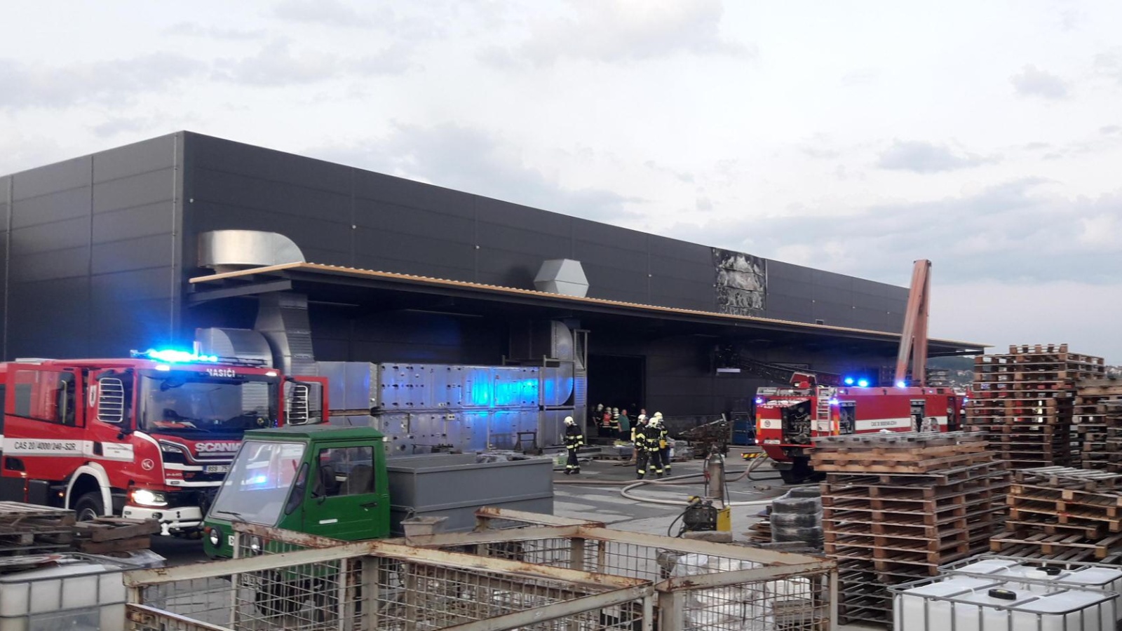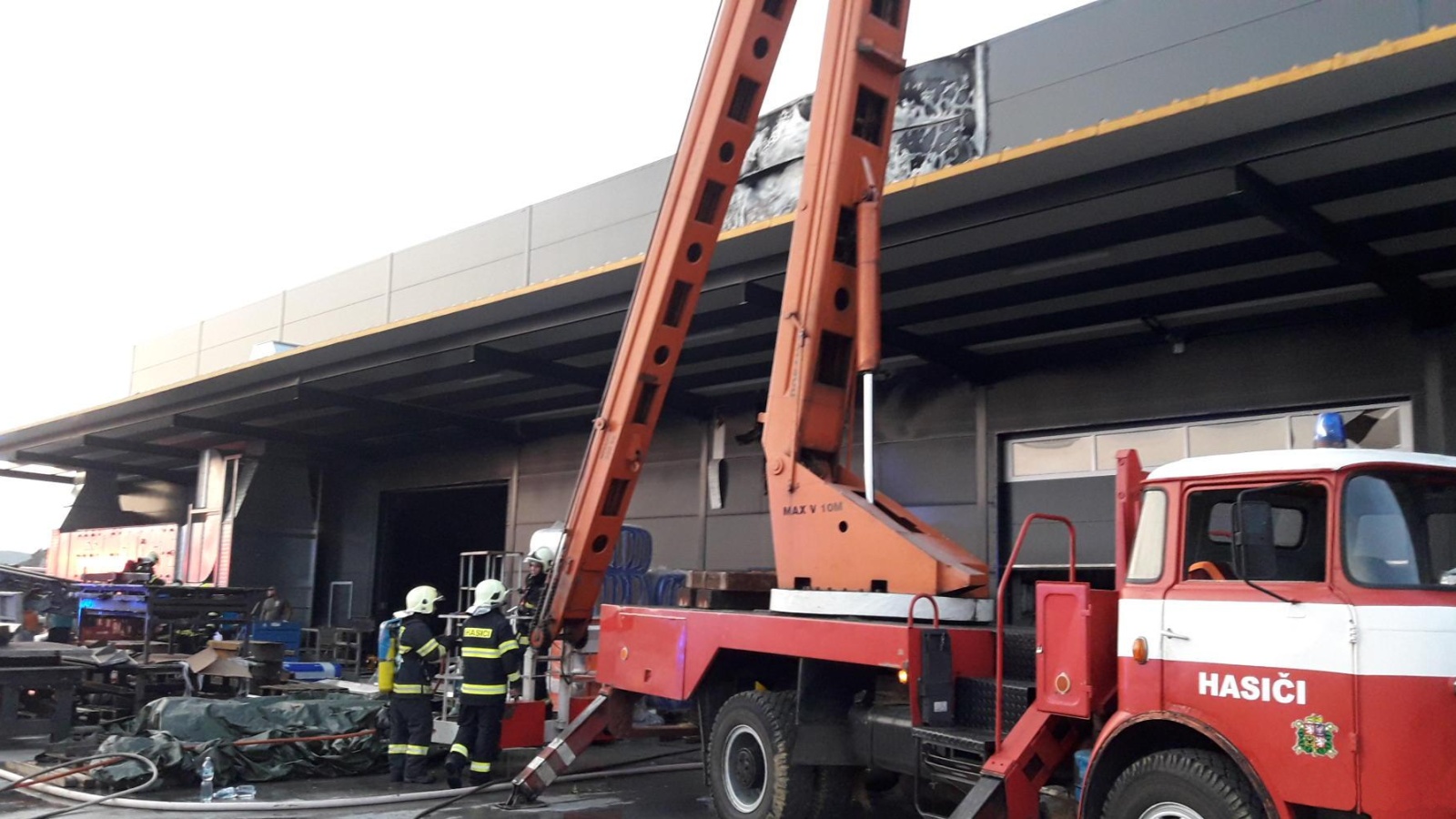 Podle upřesněné informace přímo z místa byly zasaženy dvě vnitřní lakovací haly. Hasiči v dýchací technice zahájili zásah několika C proudy a jedním vysokotlakem, a to i z výškové techniky na střechu, pod kterou hořel uskladněný polystyrén. K uhašení barev, tmelů a podobných hořlavin ve skladu byl použit D proud s pěnotvorným zařízením PRO/pak. Ze zasažené haly se povedlo vytáhnout svářecí soupravu s tlakovými lahvemi, které hasiči začali ihned ochlazovat proudem vody.