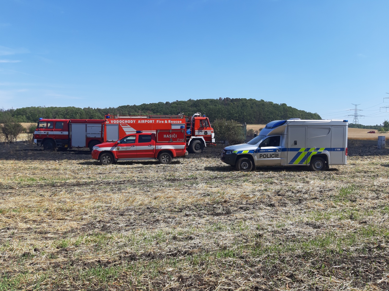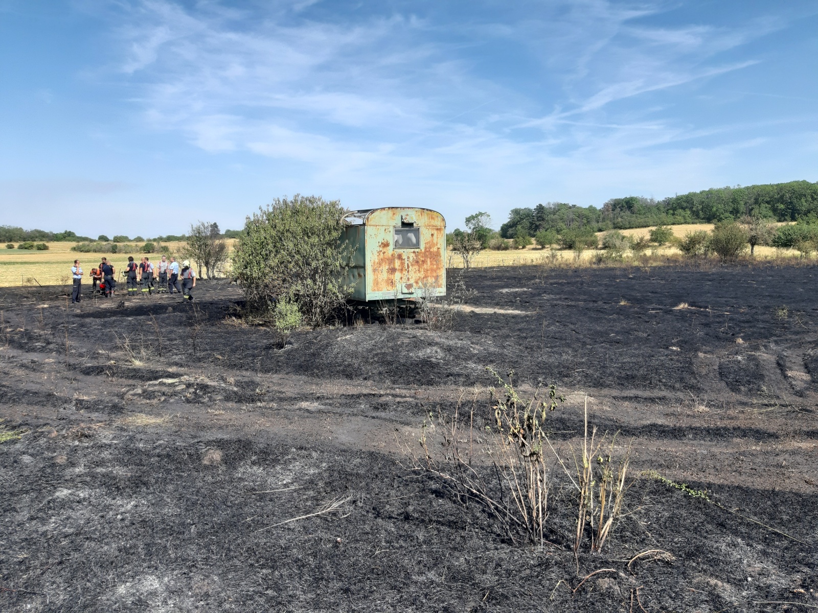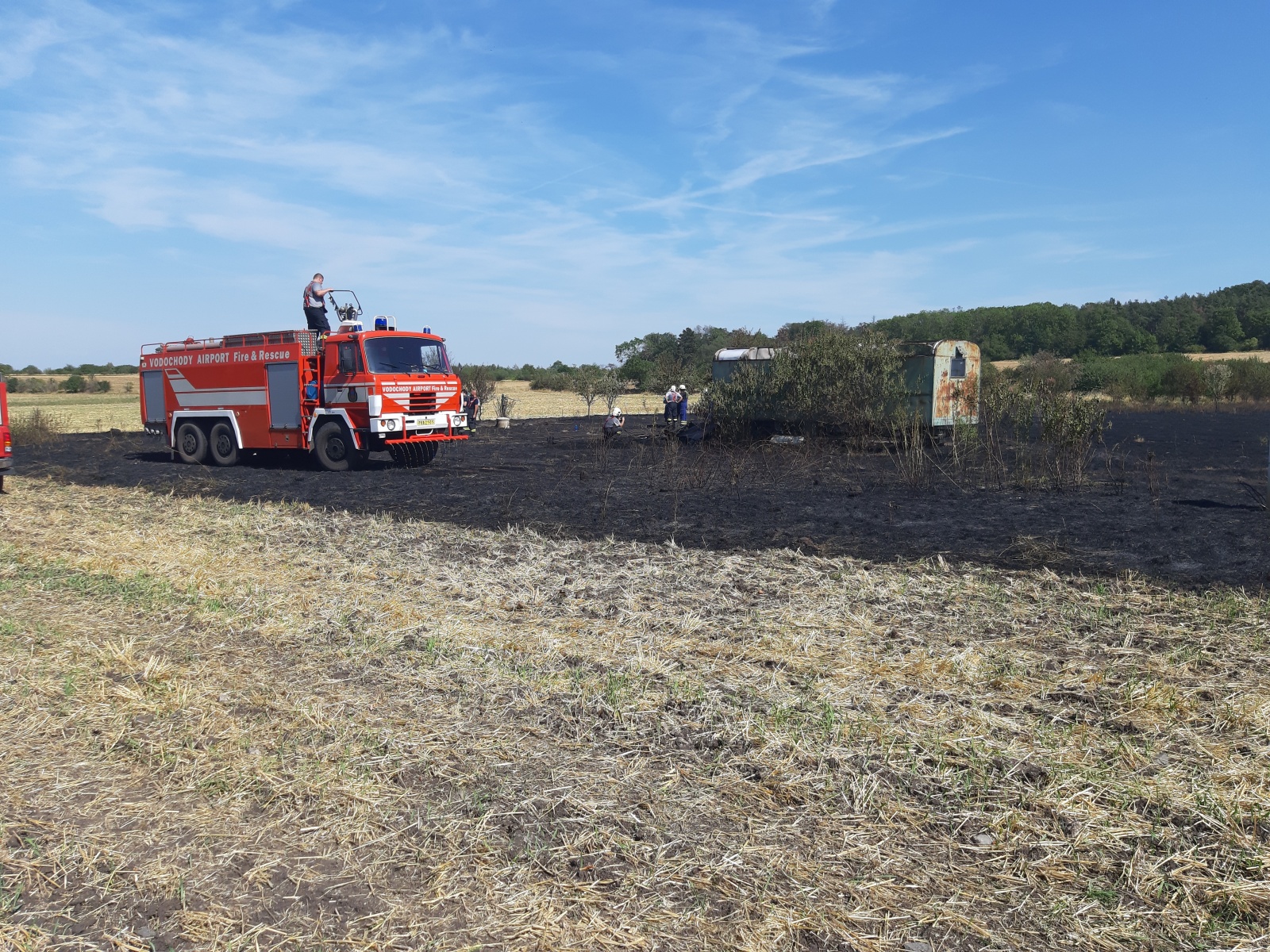 Po příjezdu hasiči zjistili, že požár zasáhl plochu cca 100x100 metrů částečně posekaného pole, na kterém hořela i maringotka, a pás náletových dřevin. Na zdolání plamenů jednotky nasadily lafety a několik C proudů. V průběhu zásahu bylo na požářišti nedaleko maringotky nalezeno torzo lidského těla. Přesně po hodině od oznámení požáru ohlásil velitel zásahu lokalizaci.