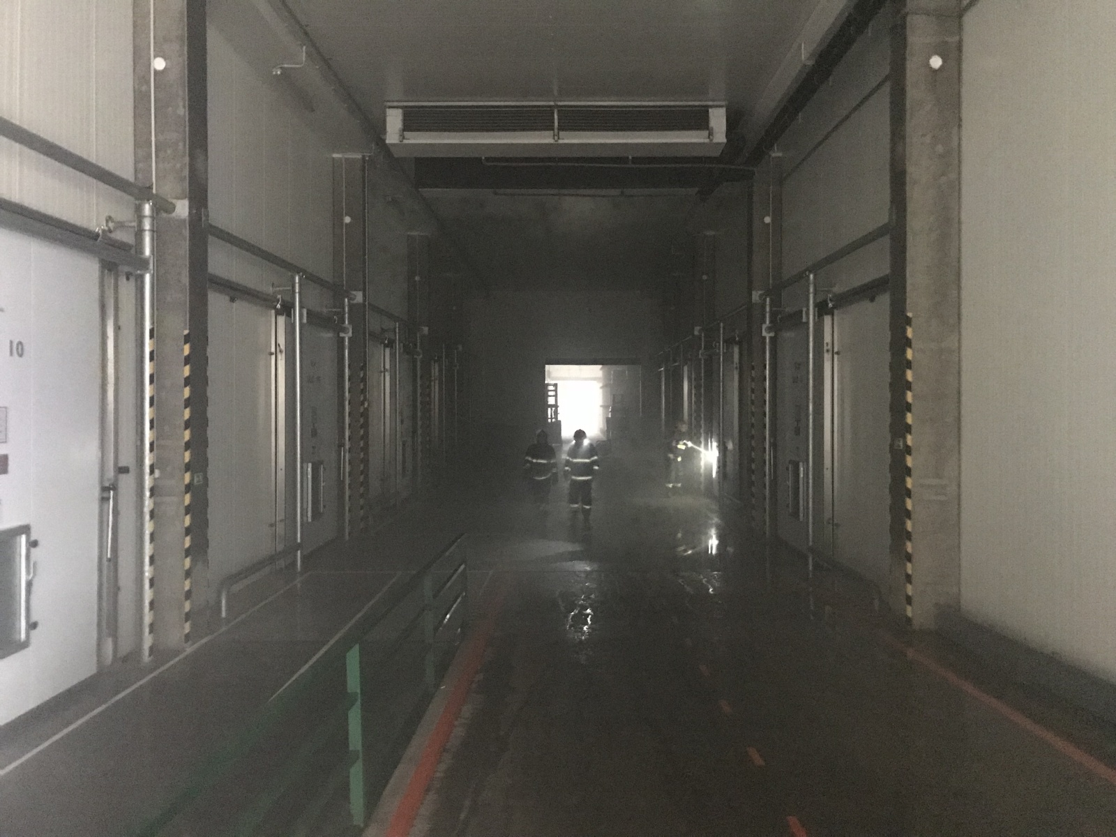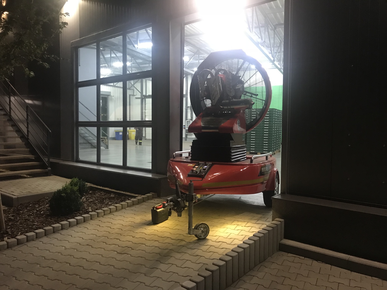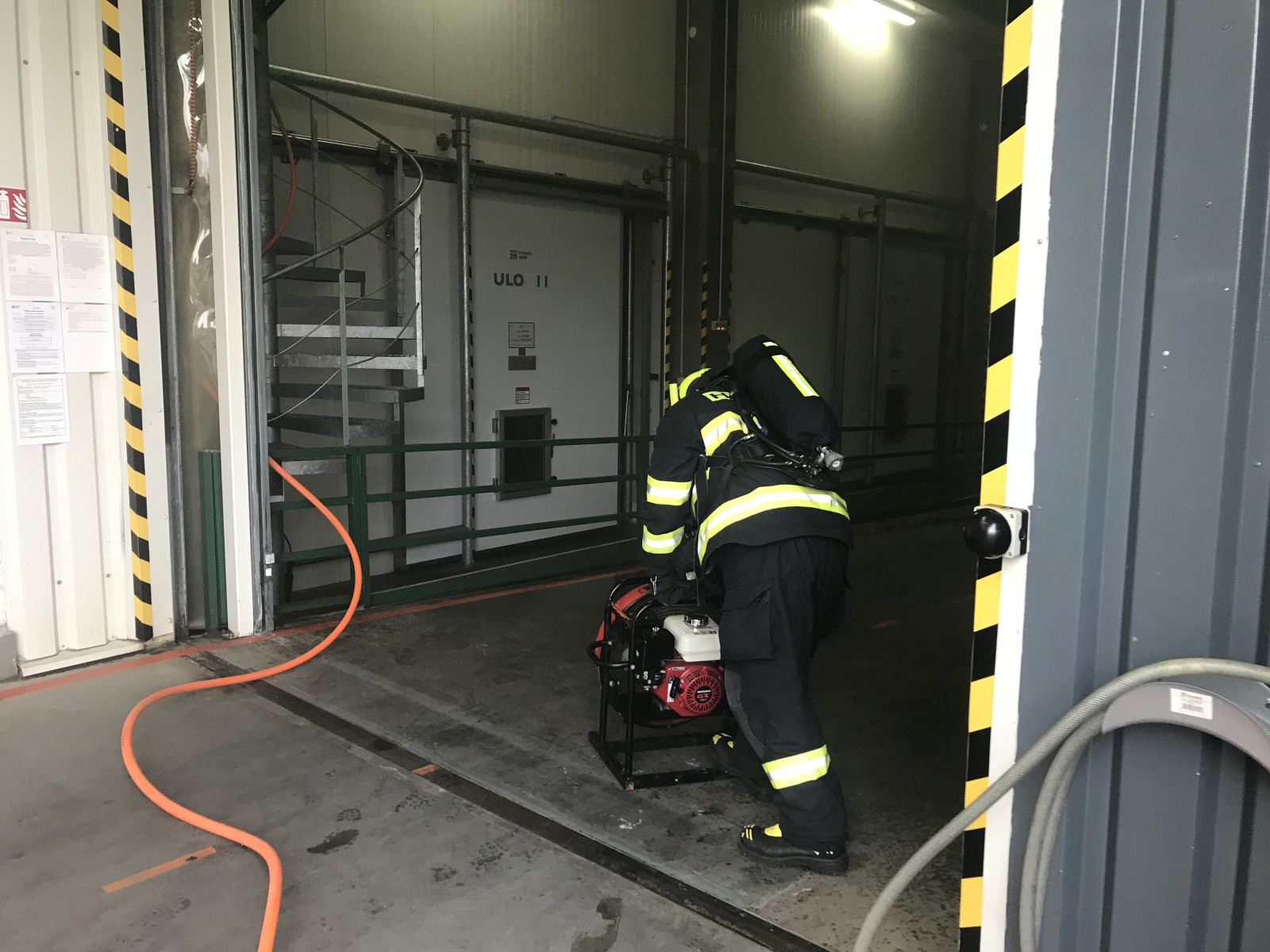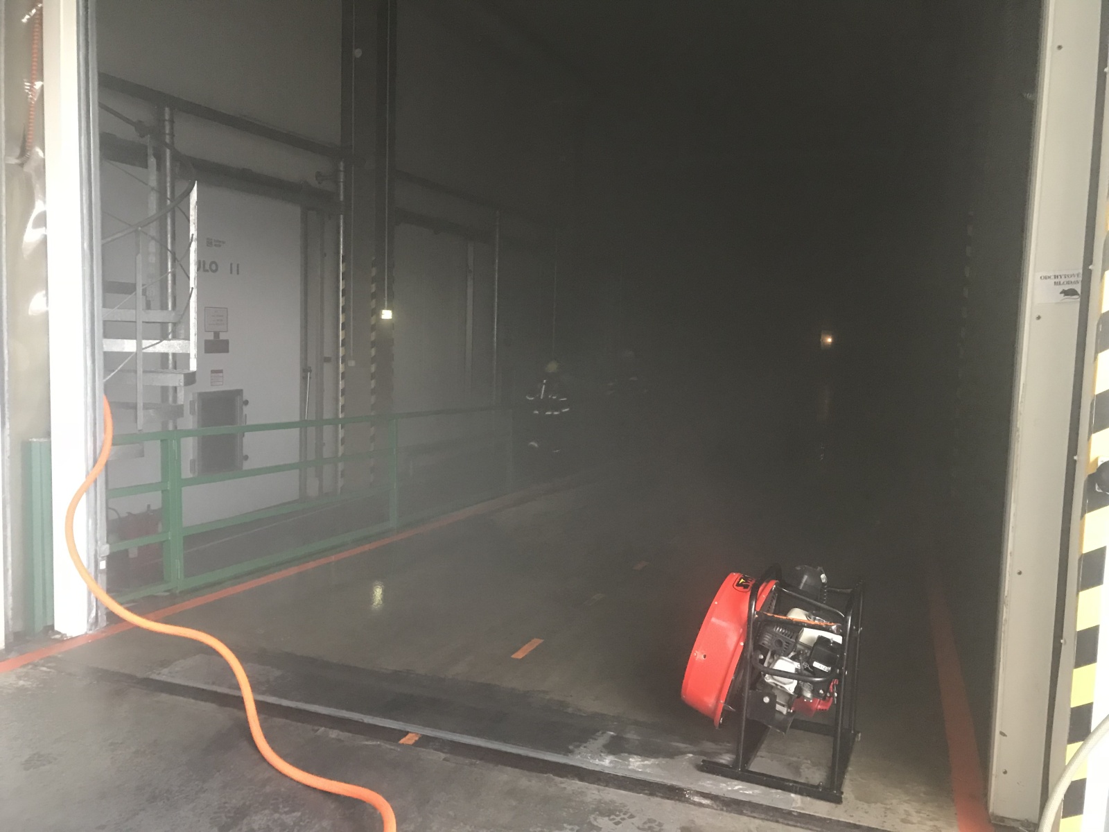 z místního zdroje. Lokalizaci nahlásil velitel zásahu v 18.45 hodin. Následně byla hala odvětrána, nejprve pomocí přenosných ventilátorů a poté byl nasazen i přívěsný s podstatně vyšším výkonem.