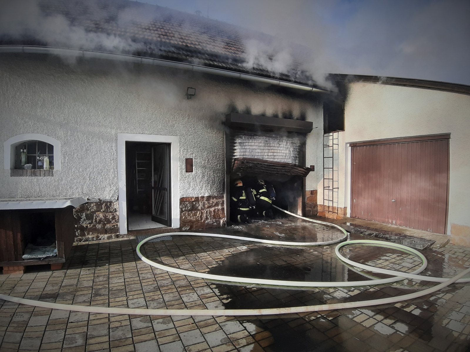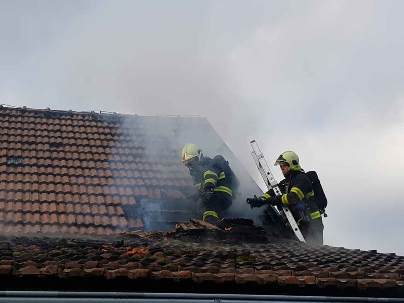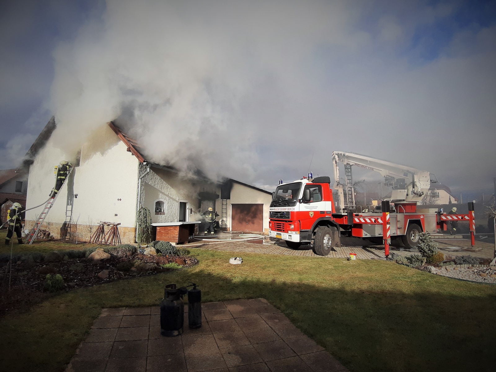 V průběhu zásahu se z objektu ozývaly výbuchy. Hasiči s dýchací technikou ihned zahájili hasební práce, vynesli kanystry s pohonnými hmotami a ustavili výškovou techniku. Voda byla do rozvinutého požáru dodávána čtyřmi vodními proudy. Pro zastavení šíření požáru pod střešní konstrukcí byly použity hasicí hřeby. Dodávka hasební vody byla plynule zajištěna pomocí obecní hydrantové sítě.