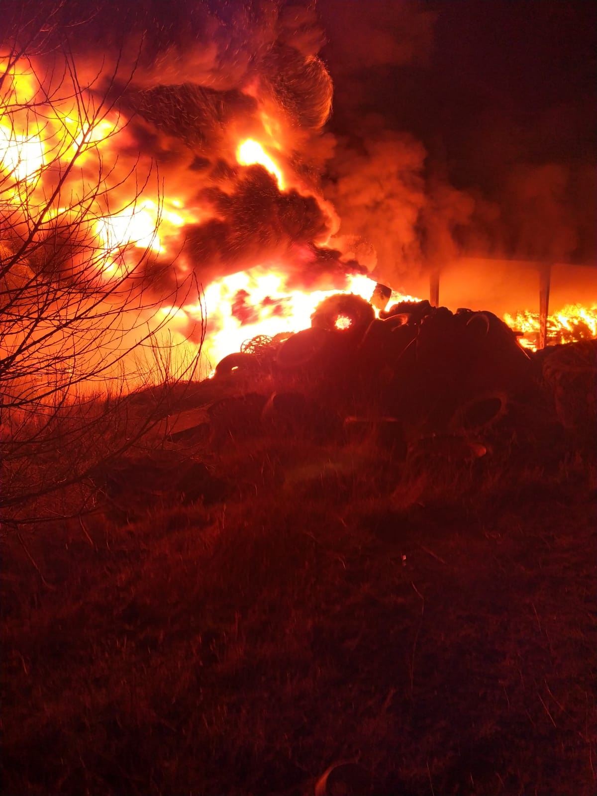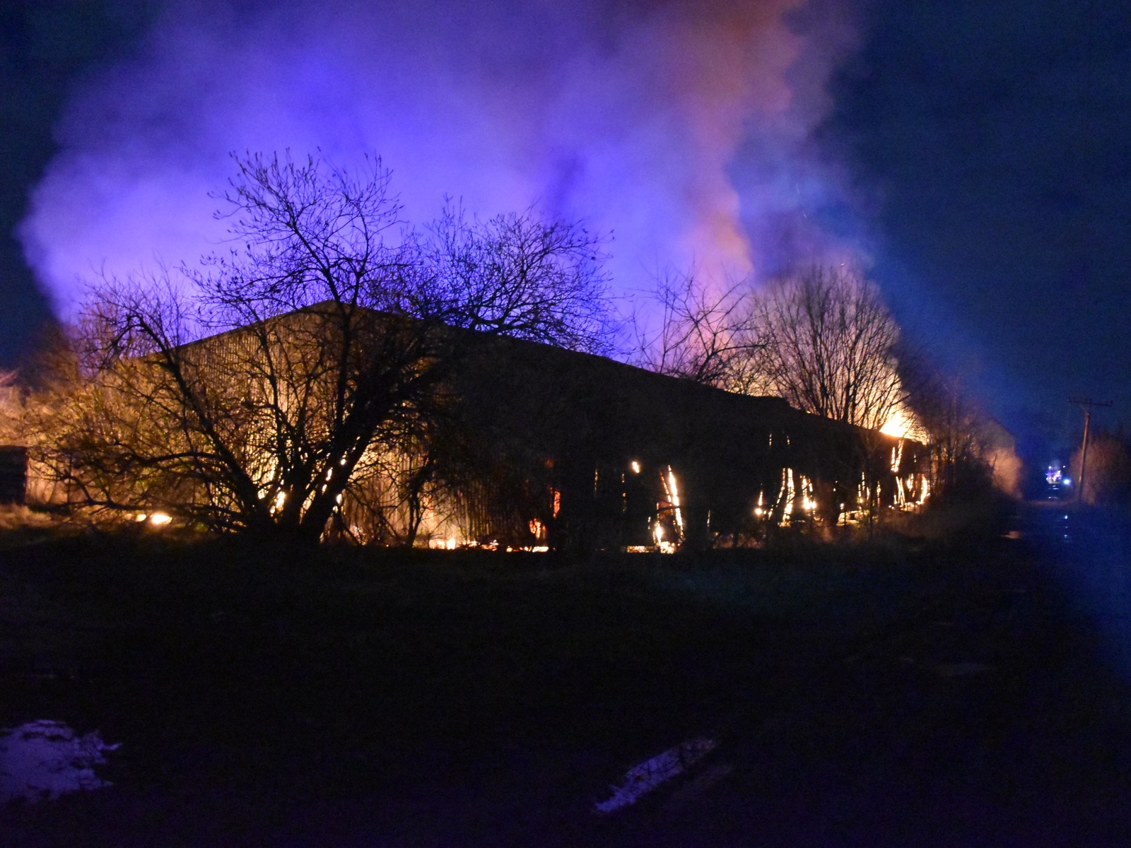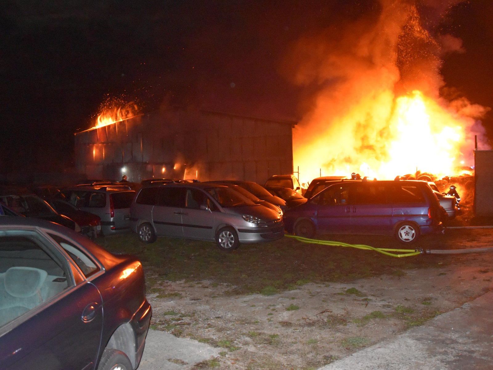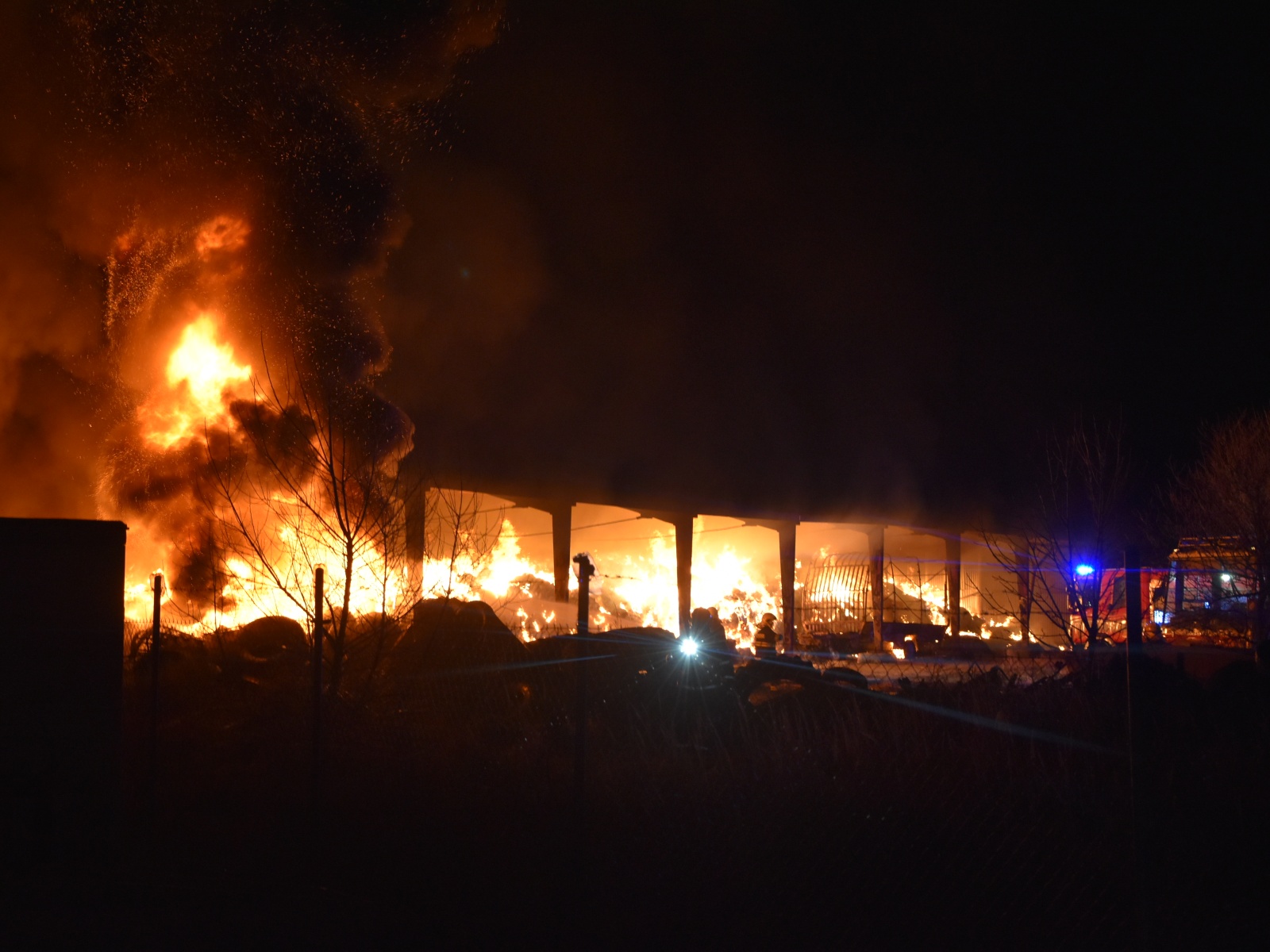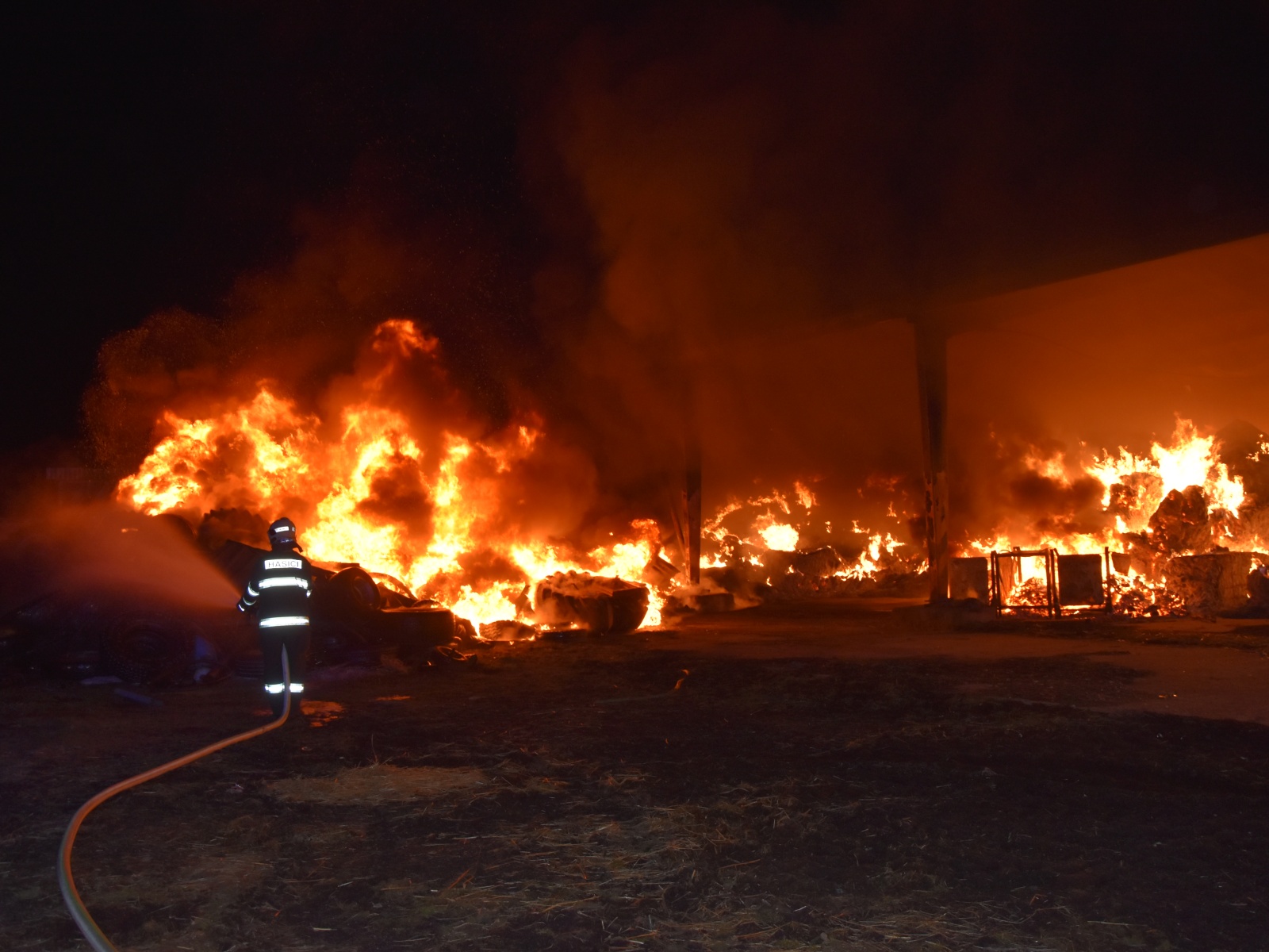 Jedním z volajících byl také starosta příslušné obce, který uvedl, že hoří zastřešená hala bez zdí o půdorysu 50x20 metrů, kde je skladováno seno, sláma a také pneumatiky. Po příjezdu první jednotky na místo bylo potvrzeno, že objekt je požárem zcela zasažen. Protože bylo nutné povolat další jednotky s cisternami, rozhodl velitel o vyhlášení druhého poplachového stupně.