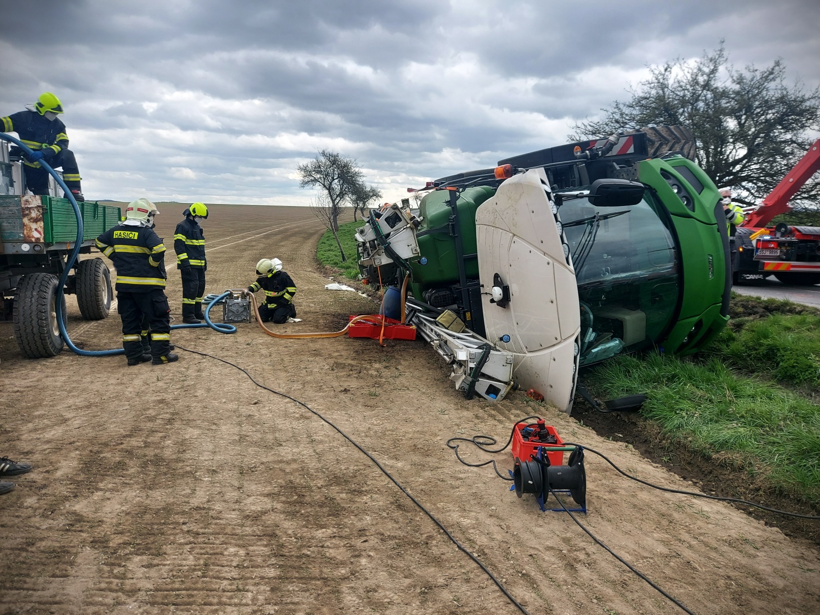 Na místo vyjeli profesionální hasiči ze stanice Rakovník s prvovýjezdovou cisternou. Po průzkumu zjistili, že si řidič začal stěžovat na bolest hlavy a zad. K události byl proto vyžádán výjezd posádky zdravotnické záchranné služby. Dále bylo zjištěno, že zemědělský stroj převážel skoro 3 000 litrů dusíkatého hnojiva a vlivem netěsnosti cisterny došlo k úniku několika hektolitrů do půdy. Zbytek bylo nezbytné přečerpat. Malý únik redukčního činidla (AdBlue) pro snížení emisí motoru hasiči provizorně utěsnili.
