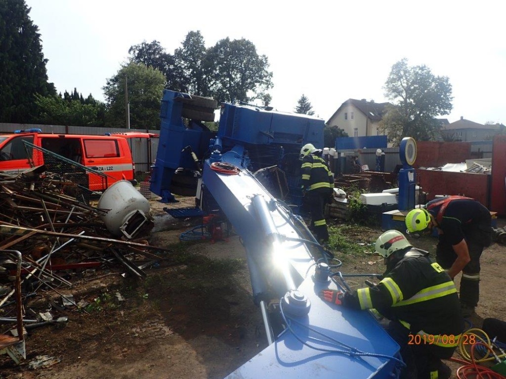 Tísňová linka HZS Středočeského kraje přijala informaci o převrácení hydraulického nakladače v areálu sběrného dvora v sousedství vlakového nádraží ve Strančicích v okrese Praha-východ.