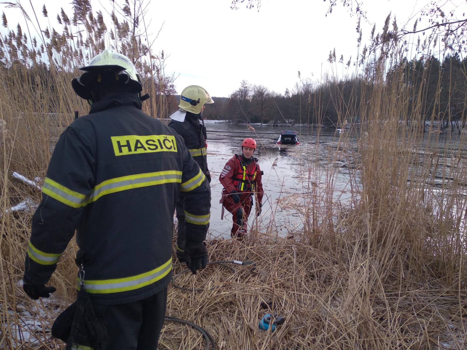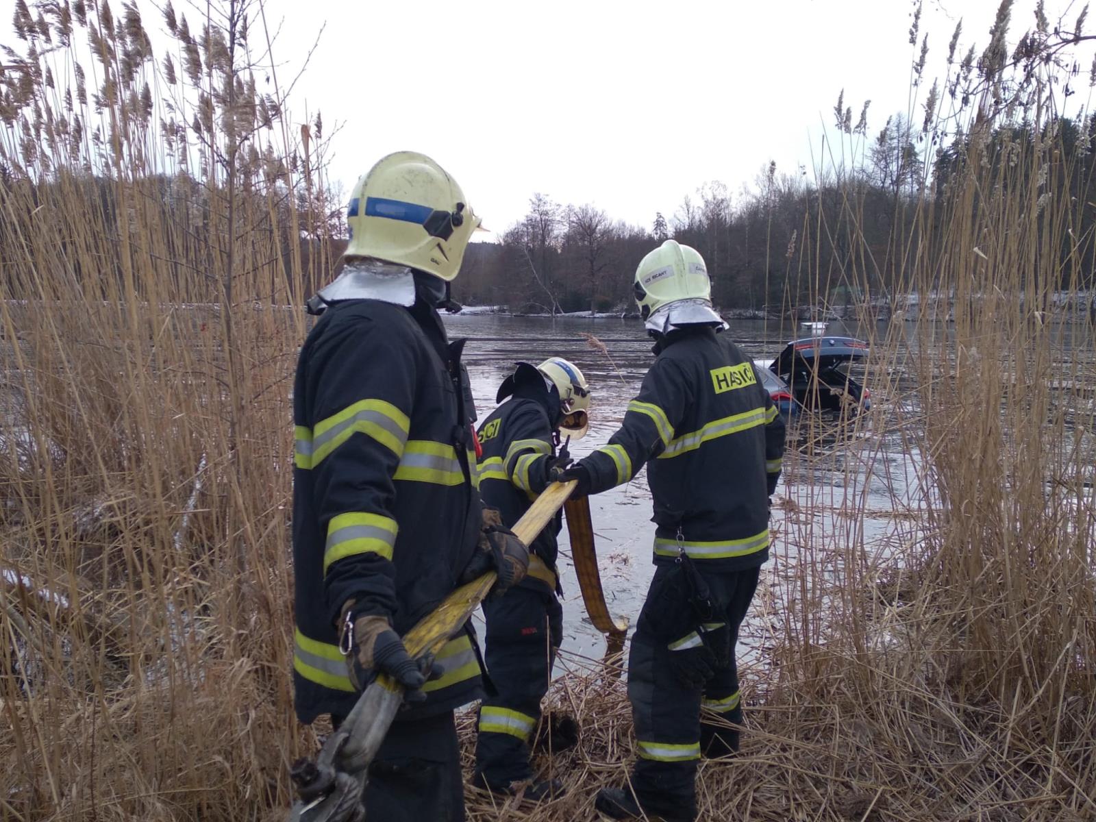 Říčanští hasiči vyprošťovali osobní automobil z rybníka Pařez