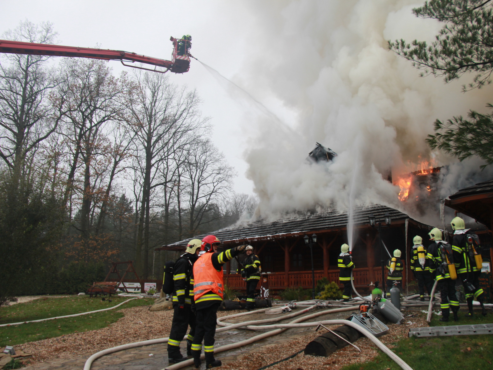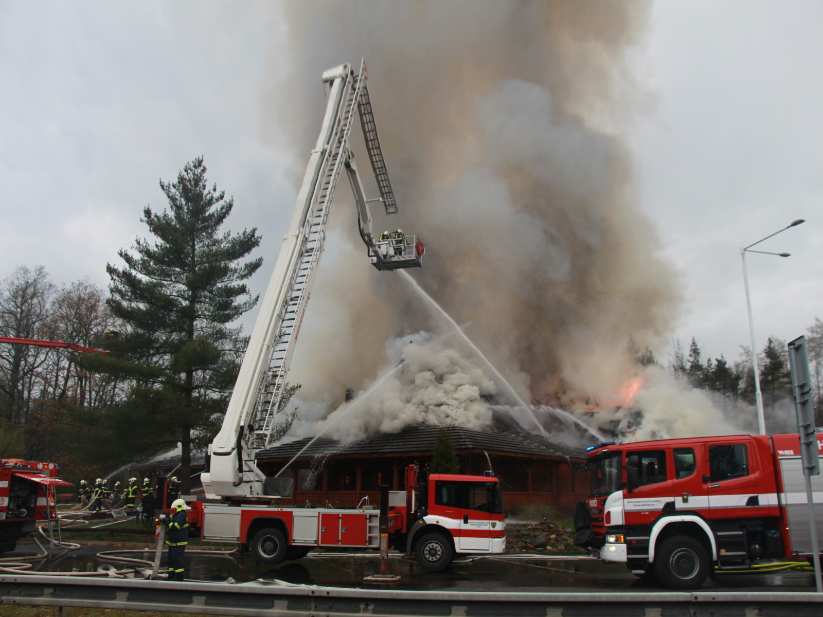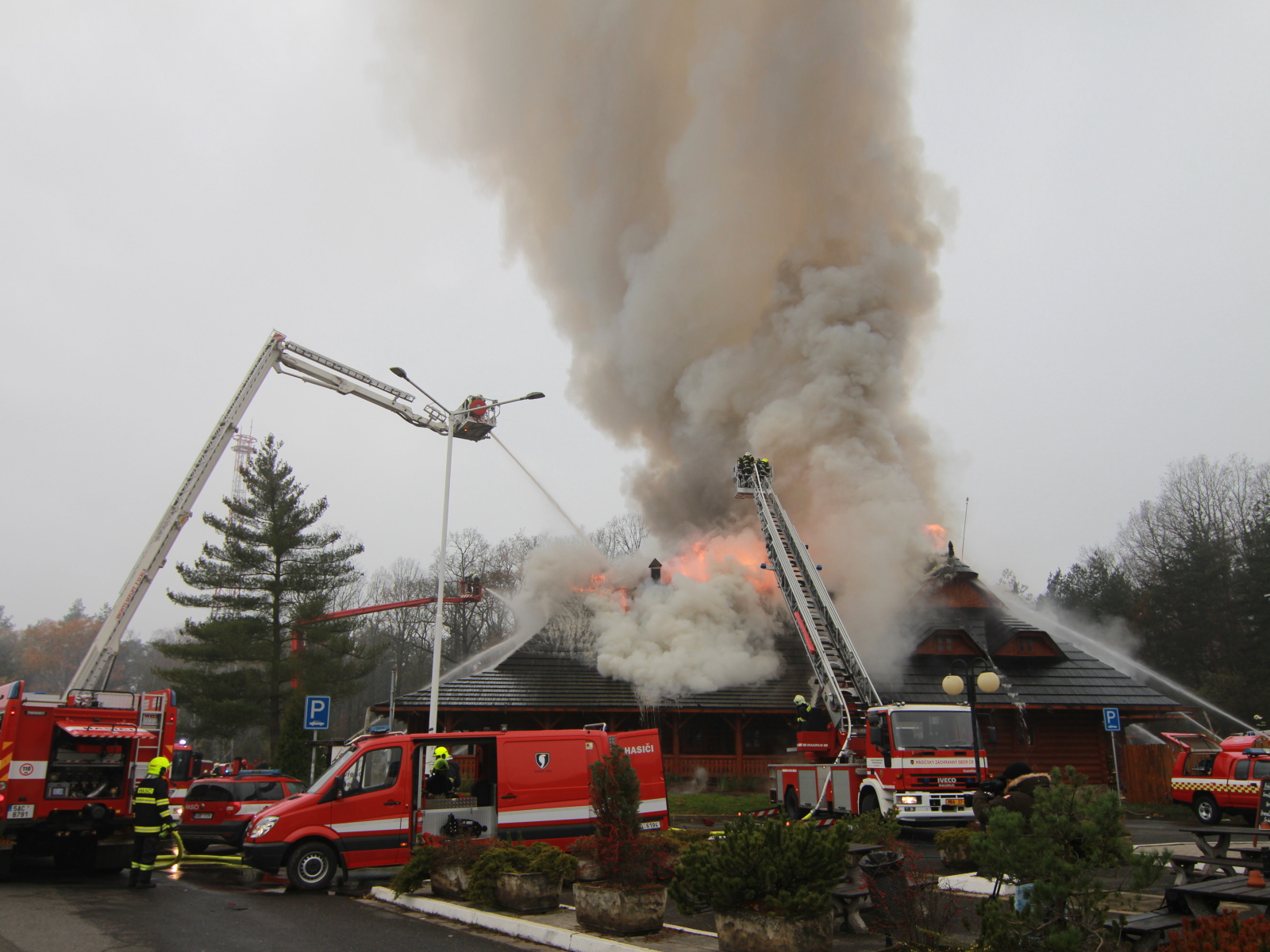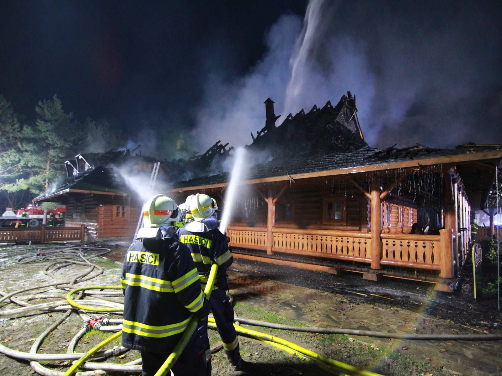 Pět minut před jedenáctou hodinou byla na místě první jednotka, která potvrdila, že požár zasáhl střechu celodřevěné koliby a postupně nabírá na intenzitě. Vzhledem k tomu, že sousední objekt, který byl vzdálen asi třicet metrů, byla benzínová čerpací stanice, byl vyhlášen třetí poplachový stupeň.